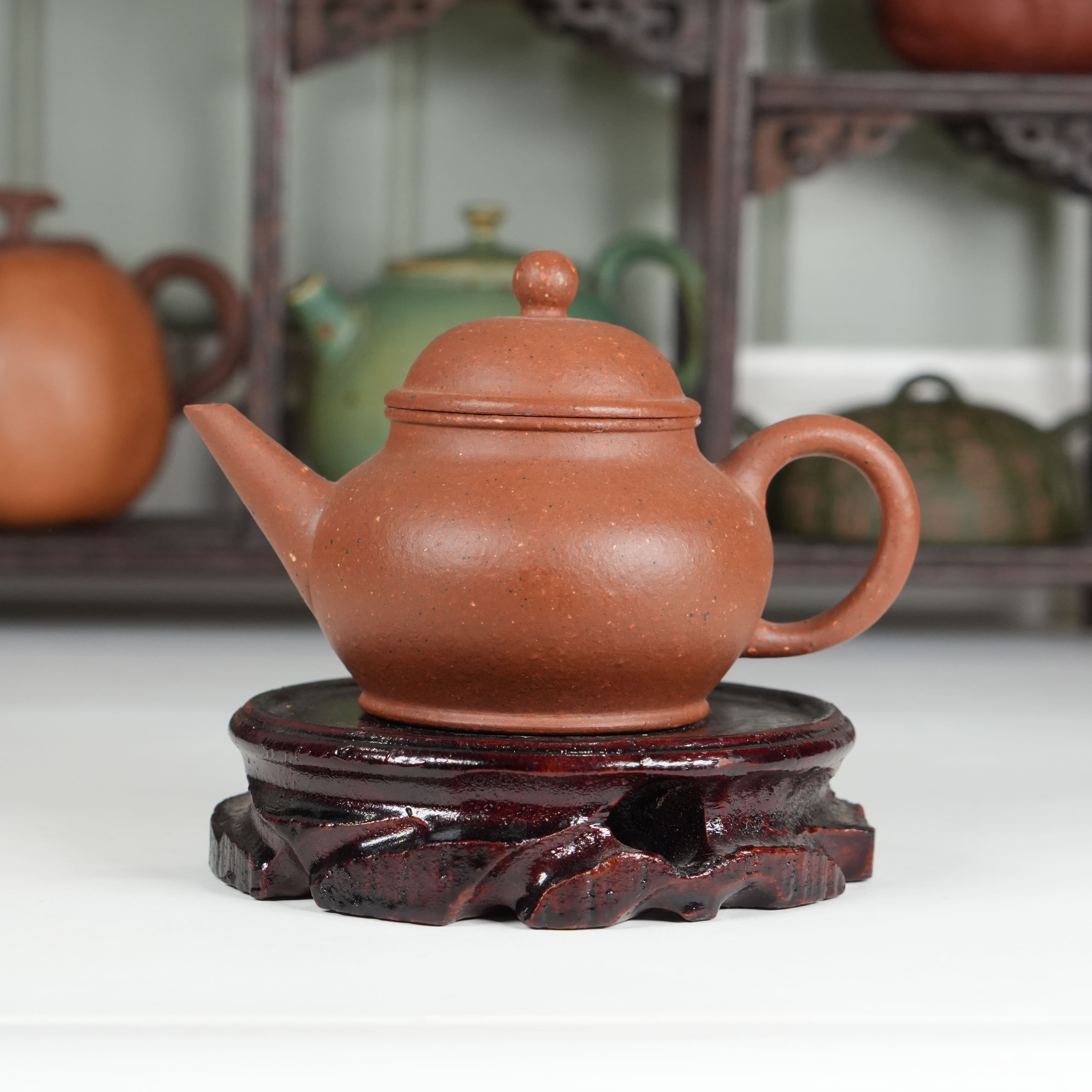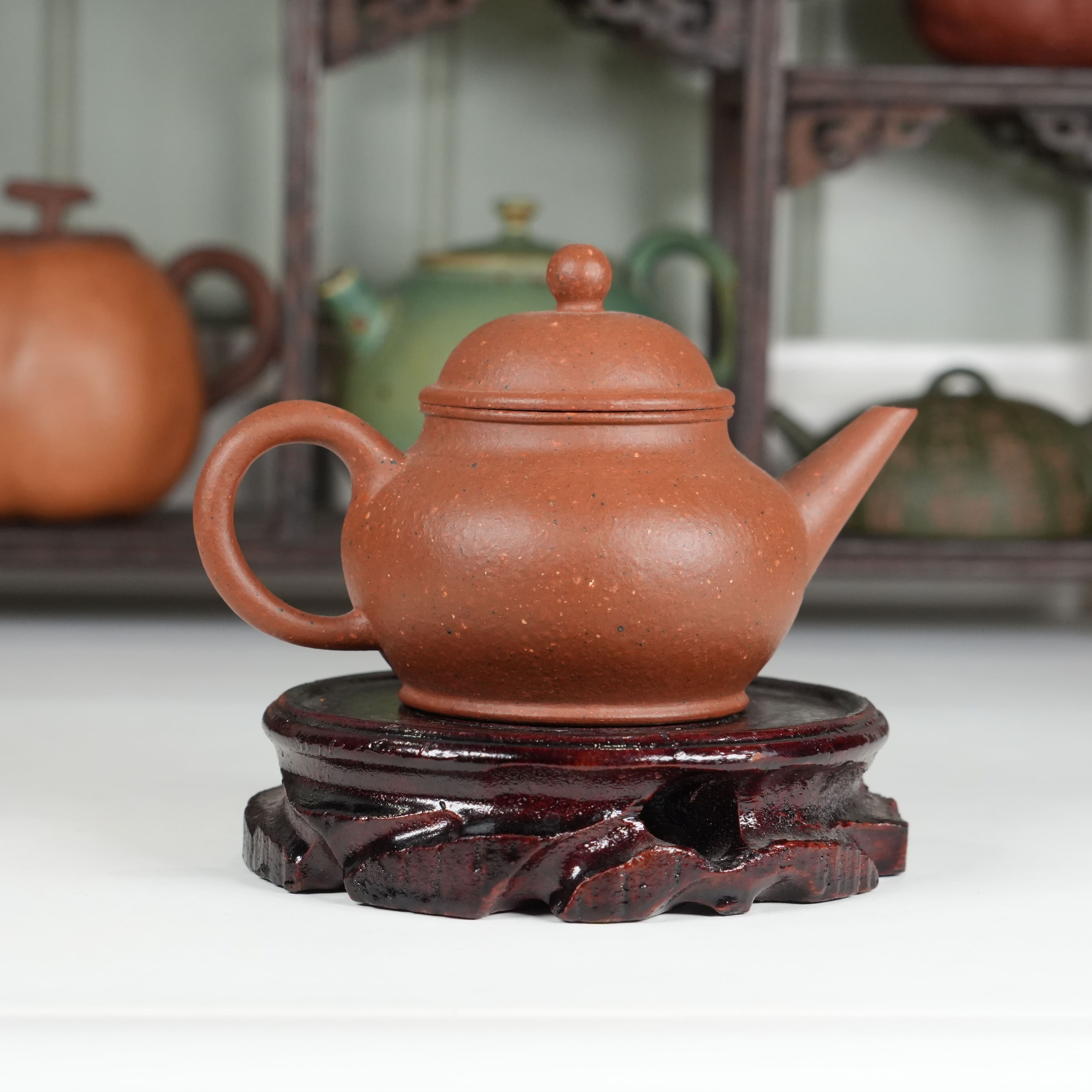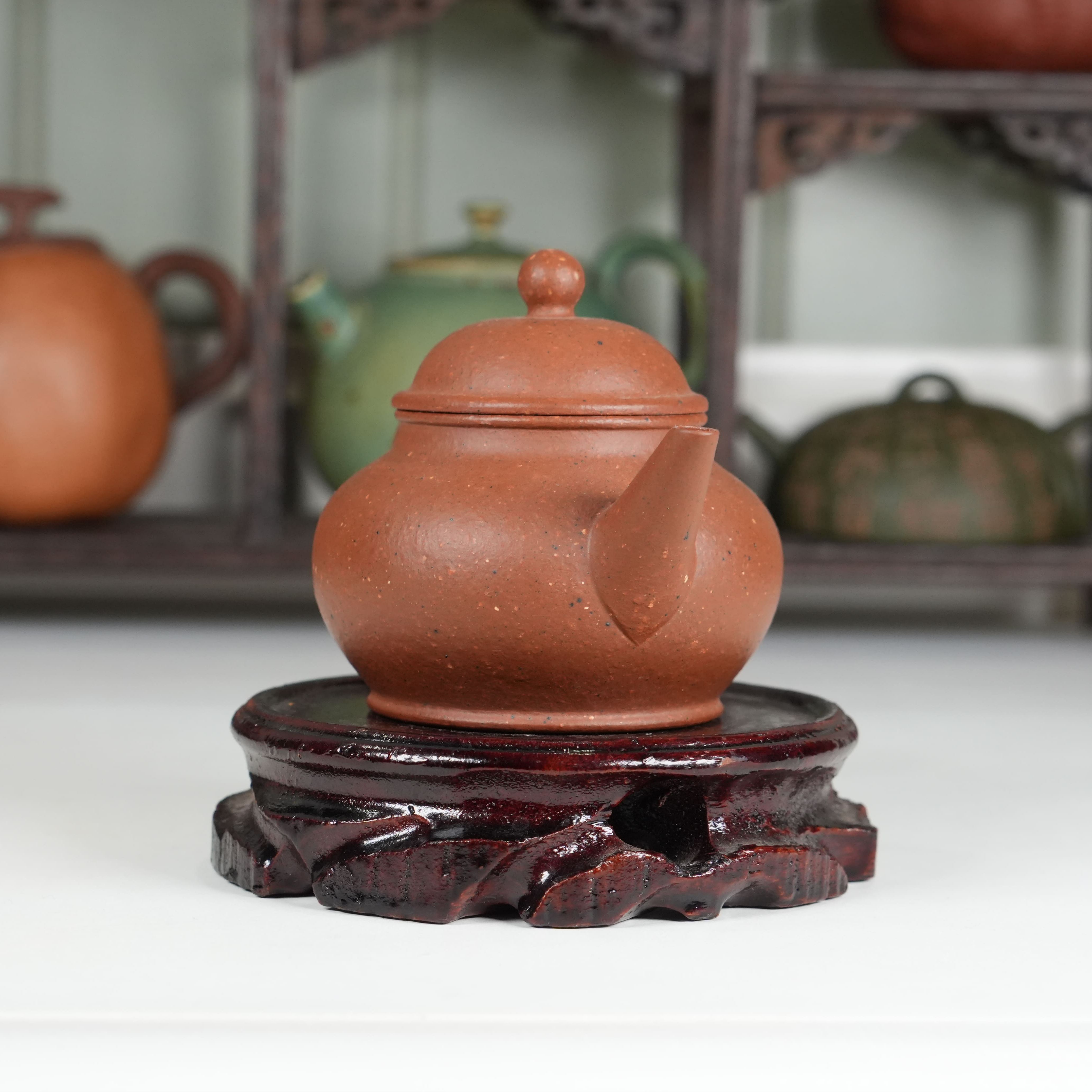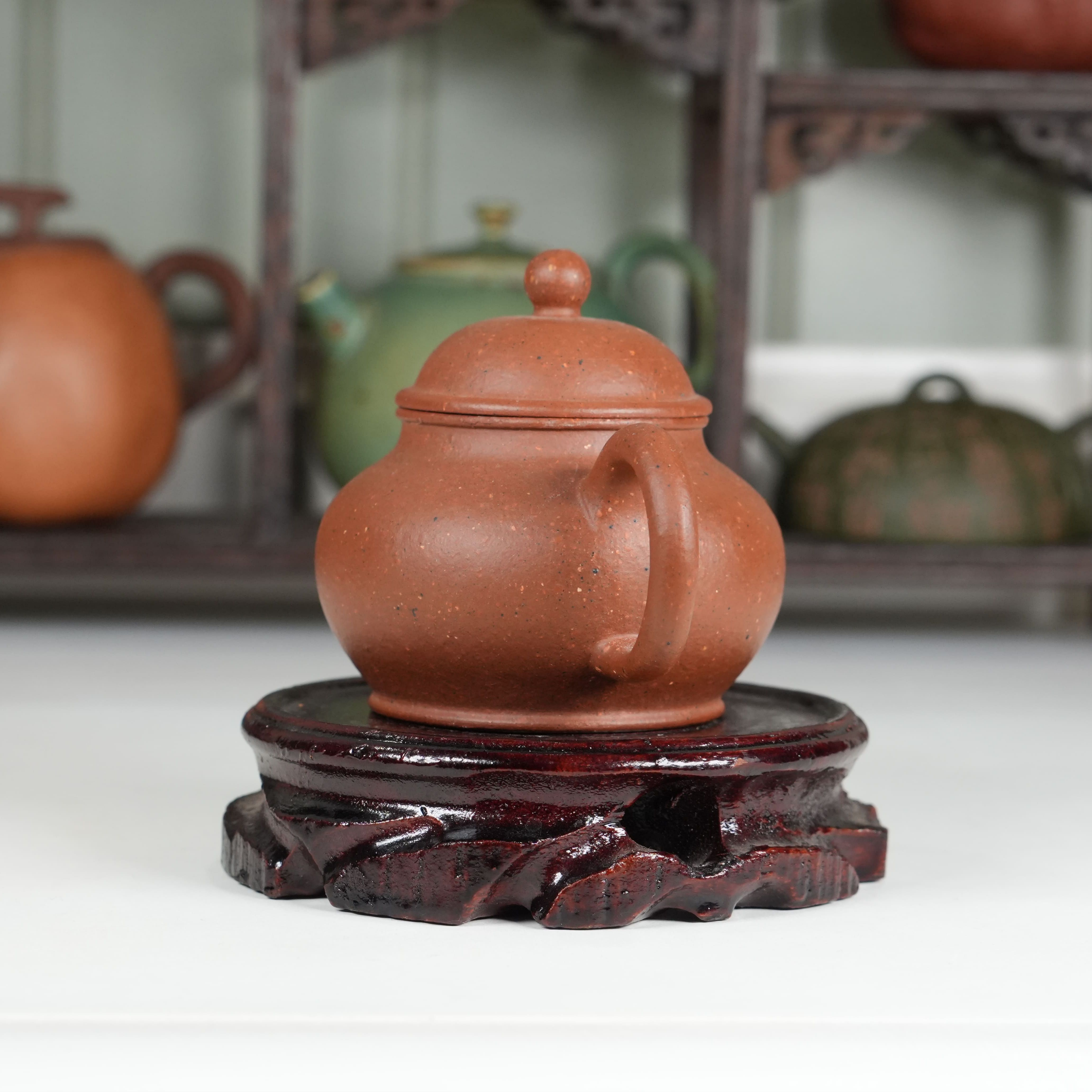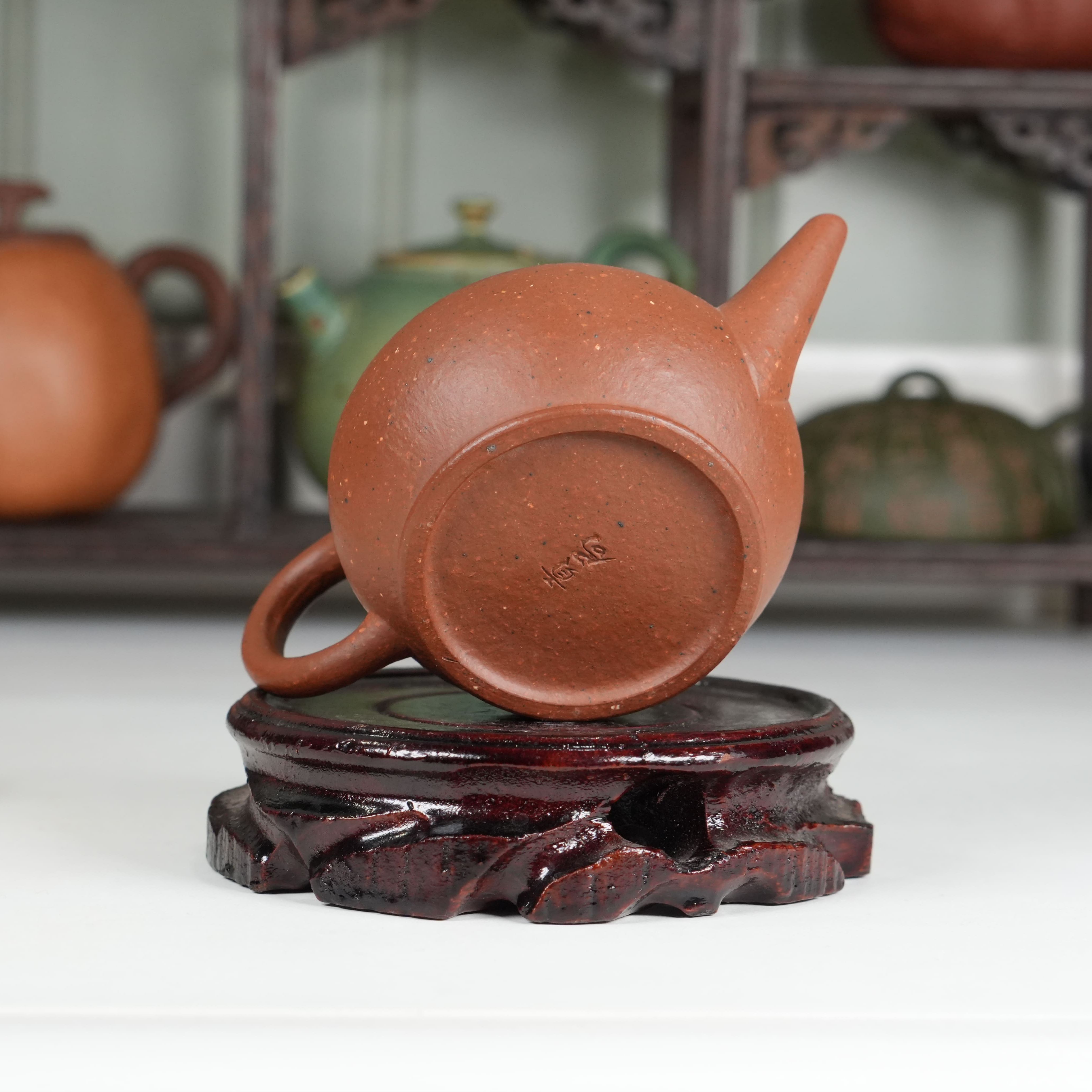 Чайник от студии Yinchen Studio выполнен с безупречным соблюдением канонов. Его пропорции выверены до миллиметра: округлое «тело» мягко расширяется к середине и сужается к основанию, носик изящно изогнут и расположен строго параллельно ручке, что обеспечивает идеальный перелив воды без малейшего усилия. Это не просто чайник - это скульптура, в которой каждый элемент дышит историей.