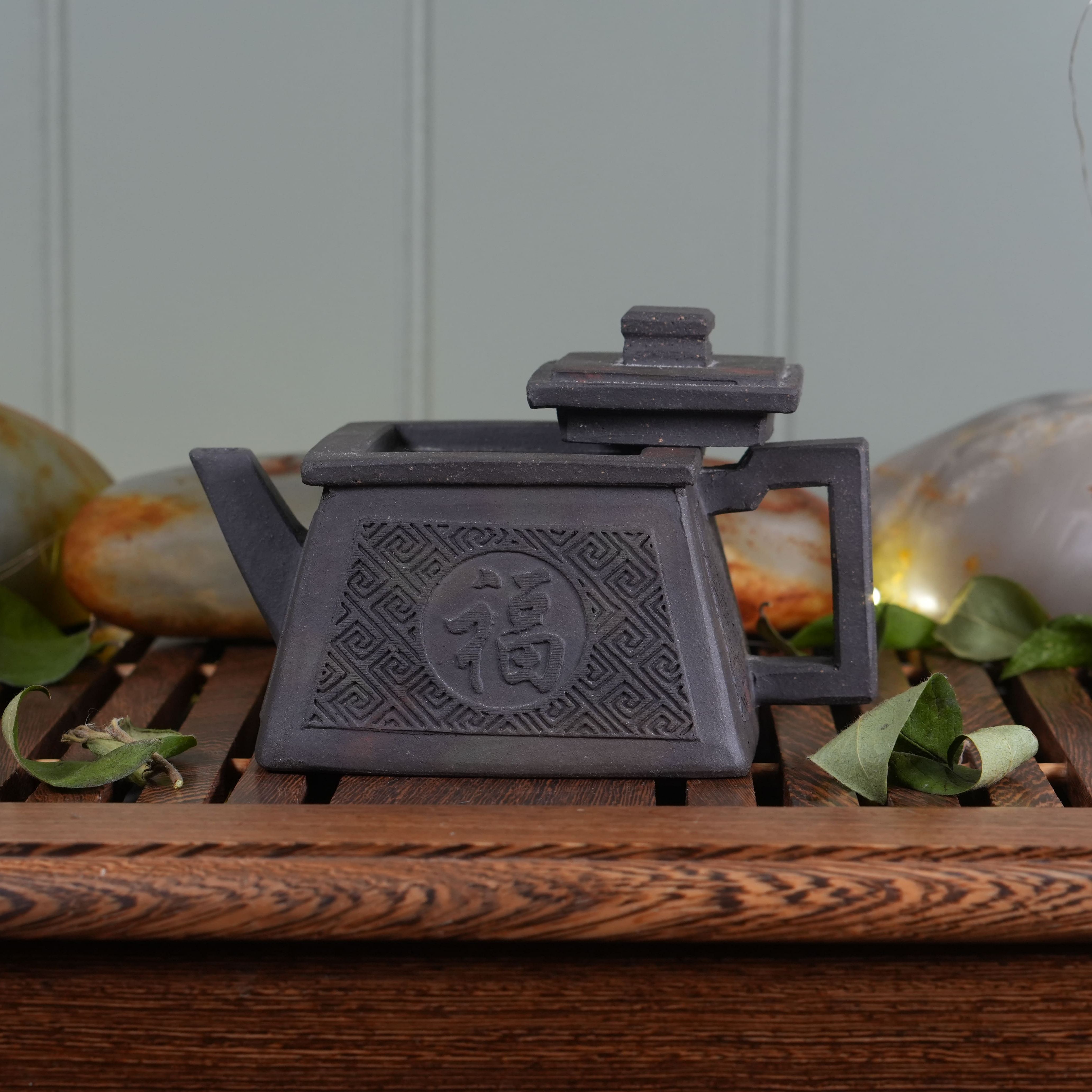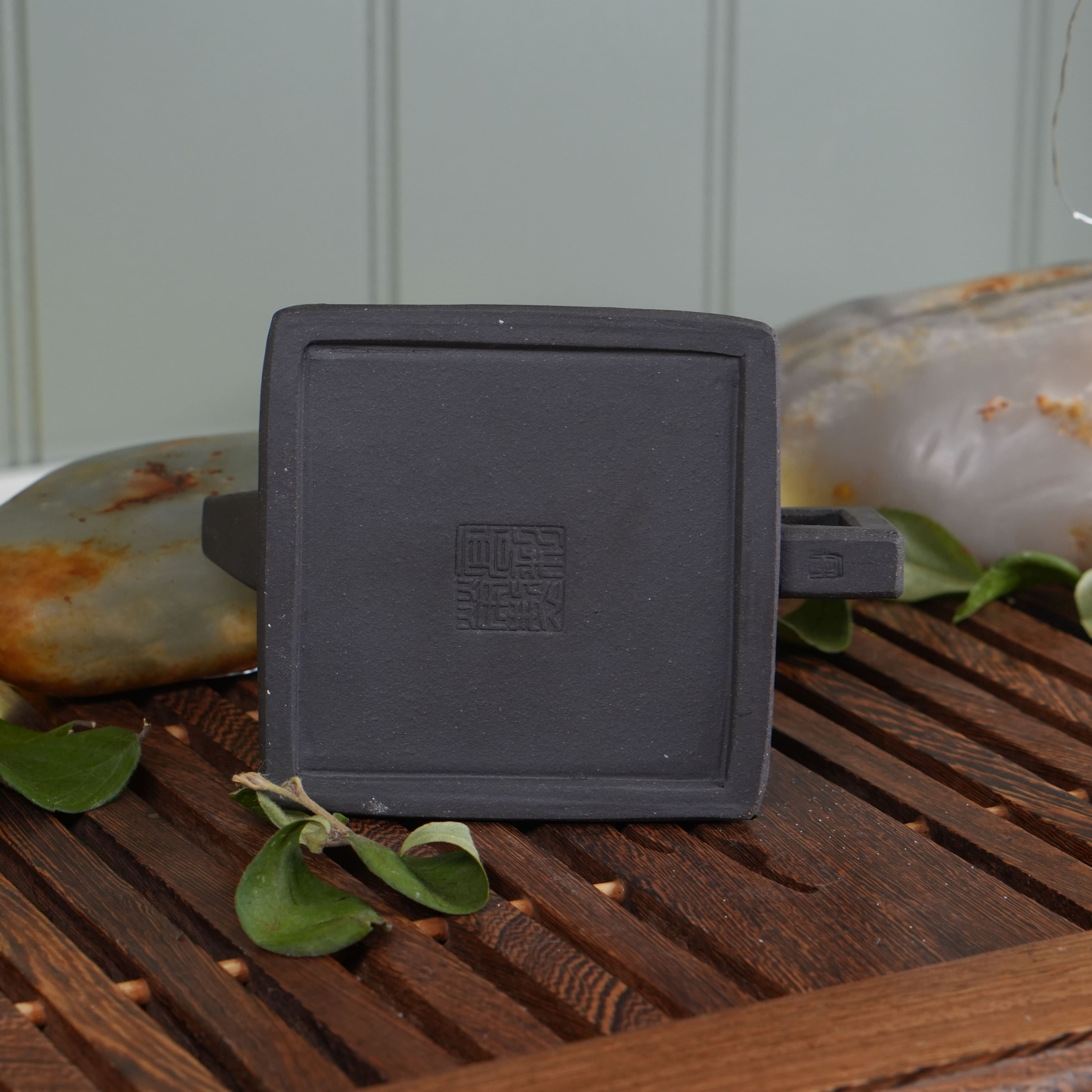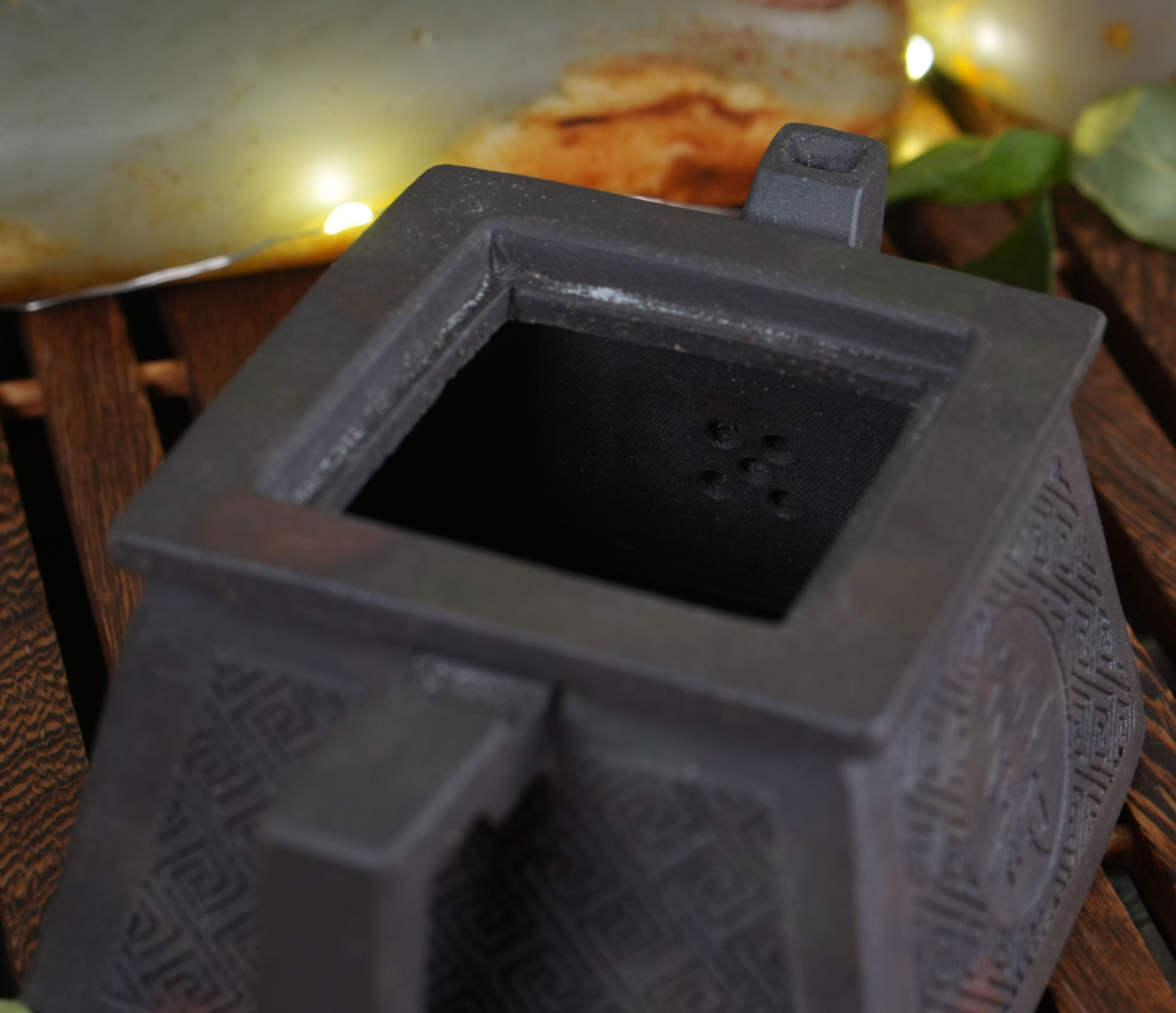 Чайник выполнен из особой исинской глины Хэй Ни (чёрная глина). Эта глина не подвергалась глубокой очистке, поэтому в ней сохранены естественные вкрапления — мелкие частицы других пород и минералов. Такая текстура придаёт поверхности живой, «дышащий» вид и делает каждый чайник уникальным. Со временем глина будет благородно меняться, впитывая чайный настой и становясь только красивей.