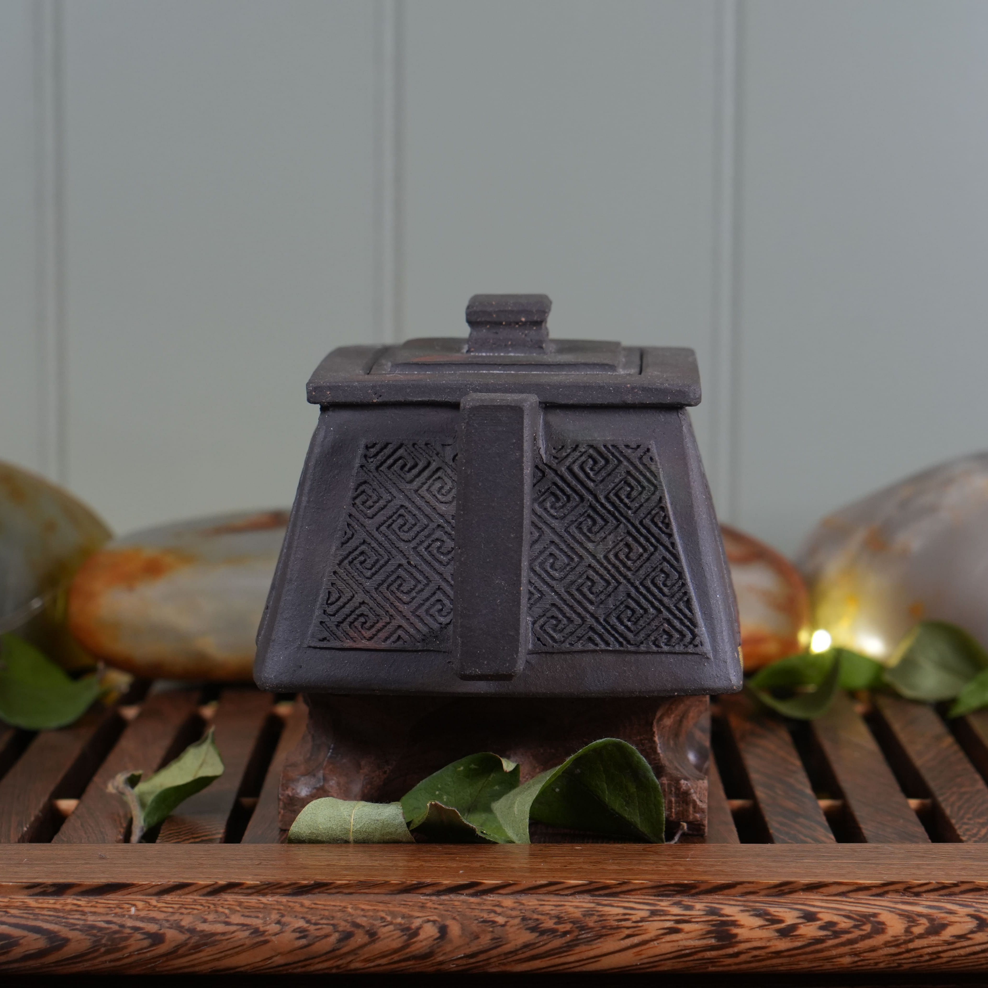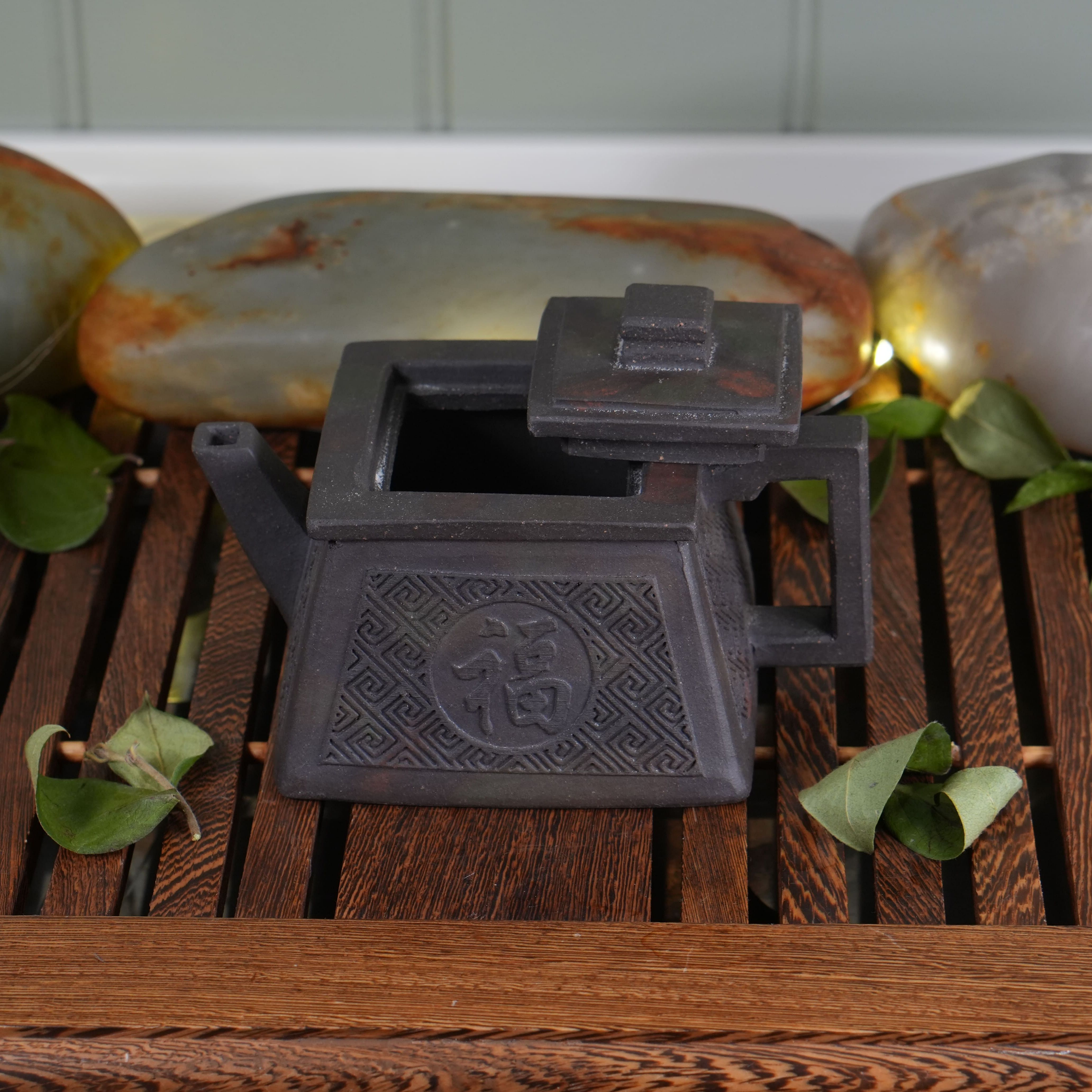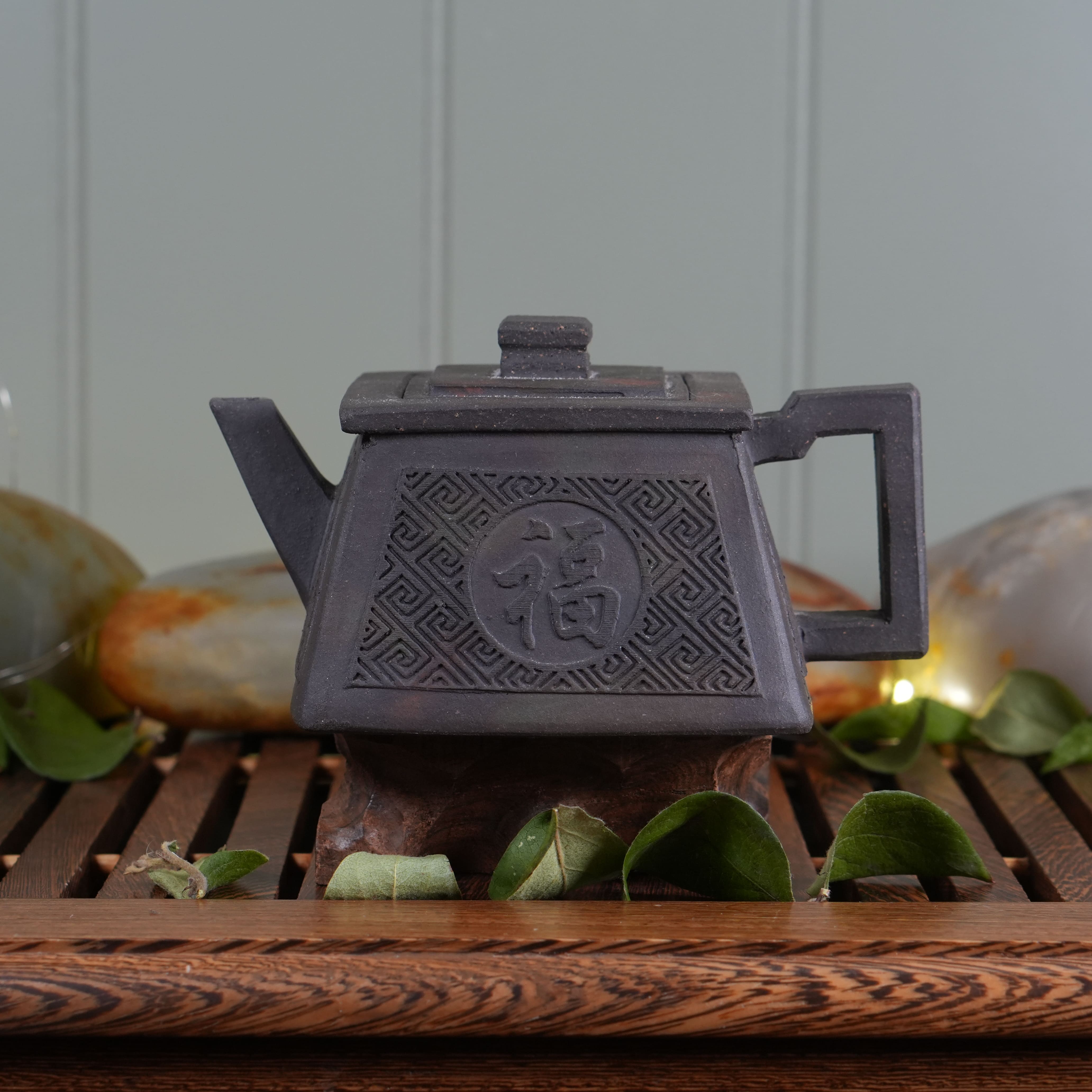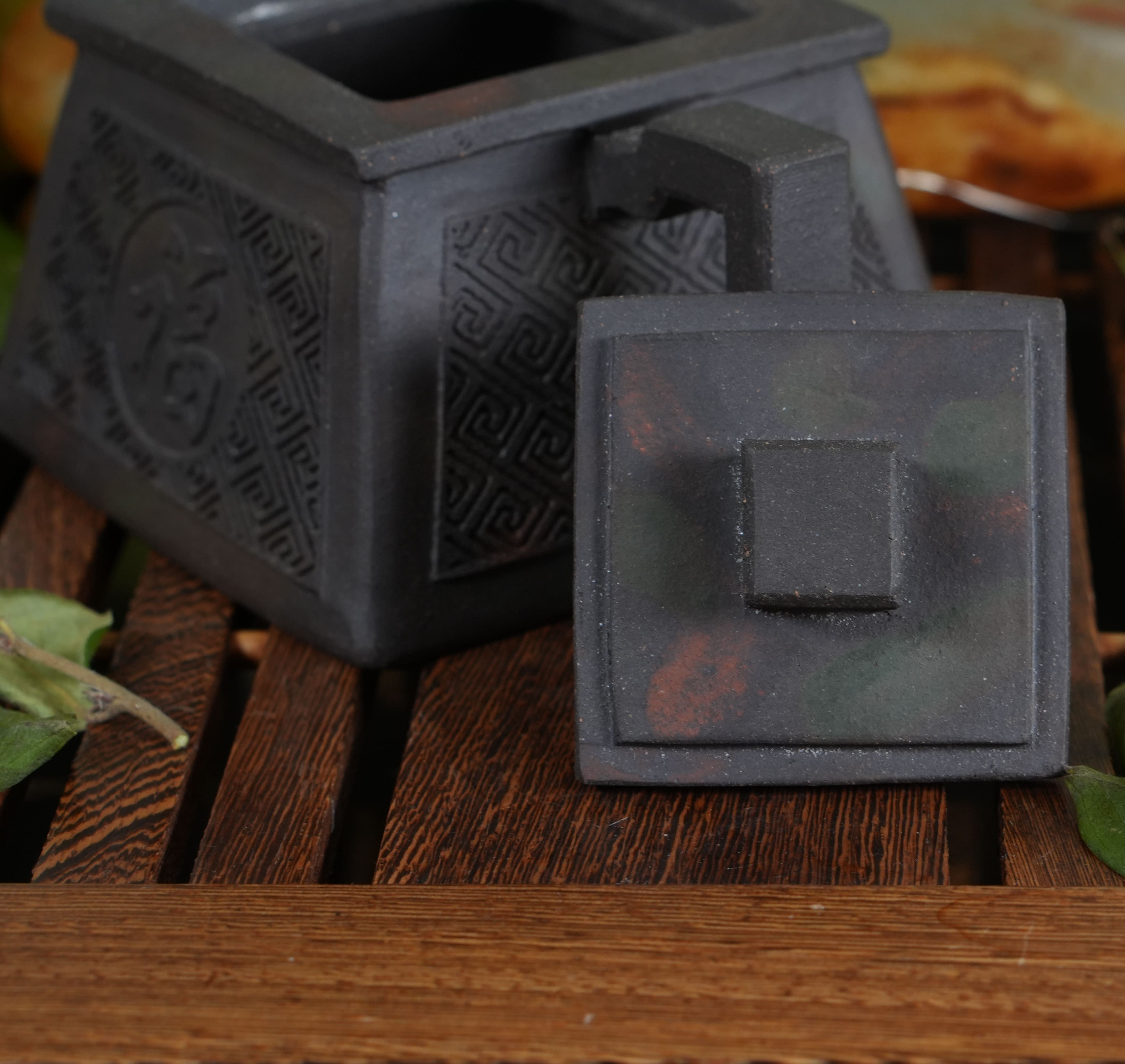 Чайник выполнен из особой исинской глины Хэй Ни (чёрная глина). Эта глина не подвергалась глубокой очистке, поэтому в ней сохранены естественные вкрапления — мелкие частицы других пород и минералов. Такая текстура придаёт поверхности живой, «дышащий» вид и делает каждый чайник уникальным. Со временем глина будет благородно меняться, впитывая чайный настой и становясь только красивей.