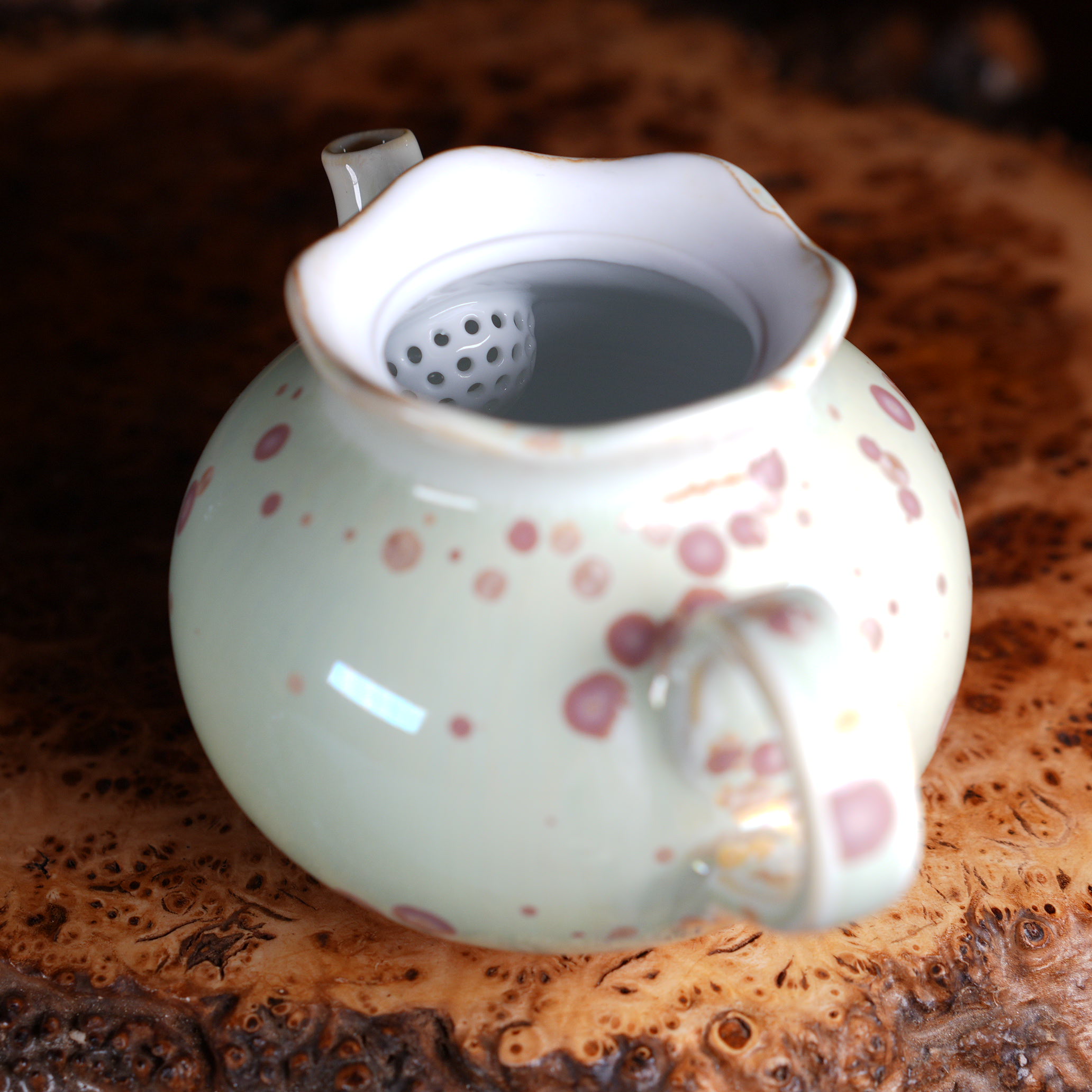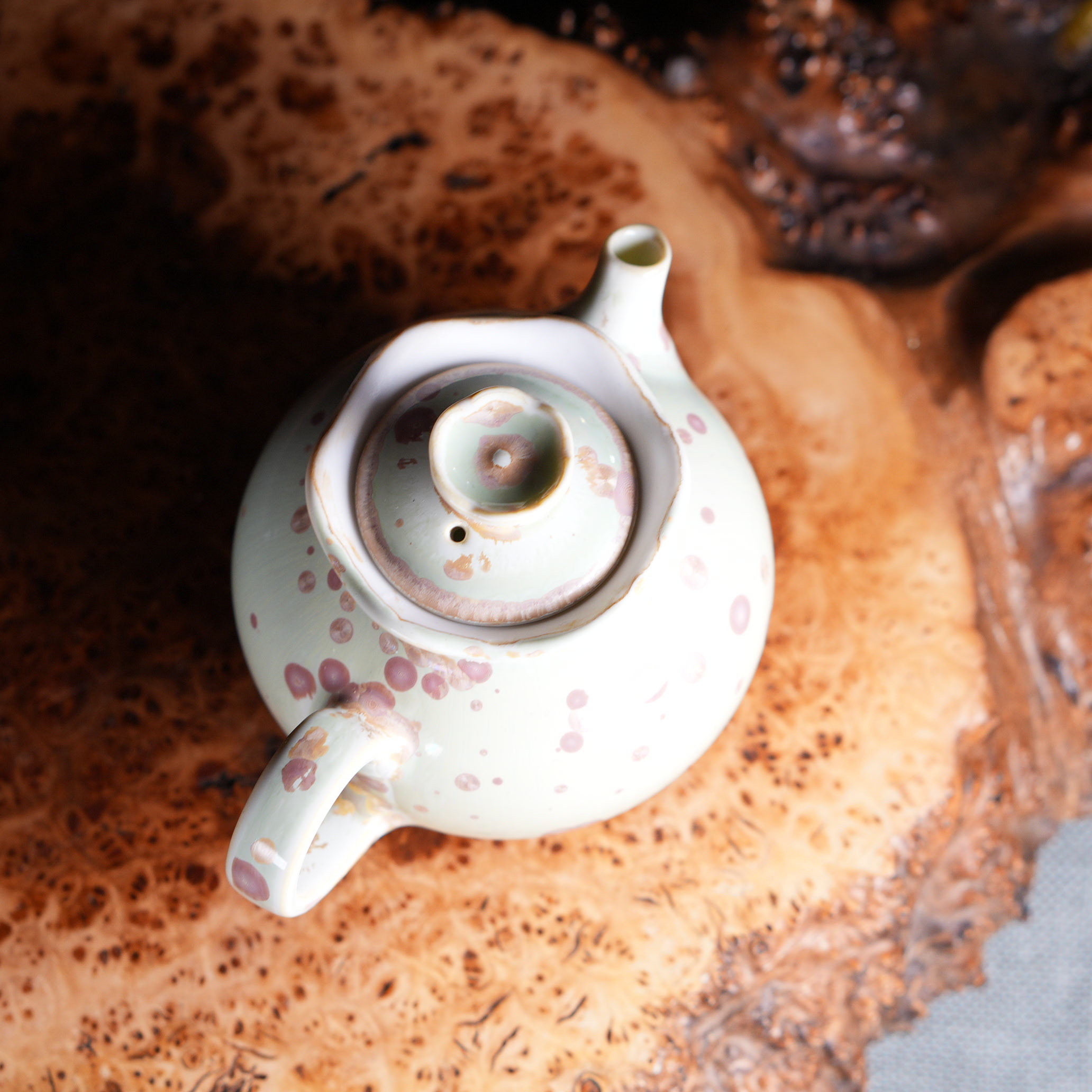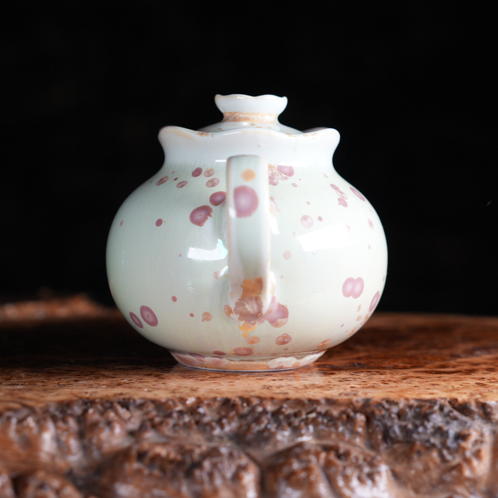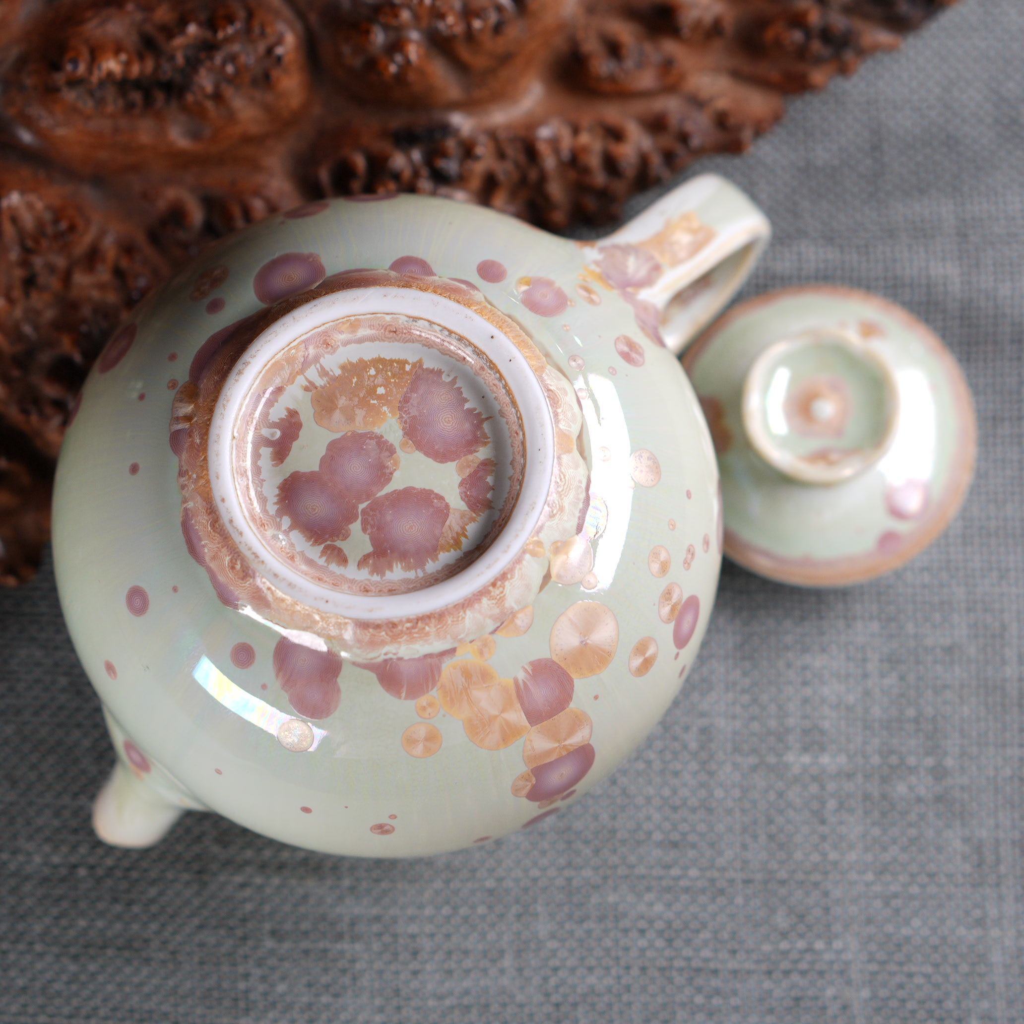 Главная особенность этого чайника - уникальное глазурное покрытие. На нежный мятный фон нанесены брызги кристаллической глазури с радиальной структурой. Этот эффект напоминает: