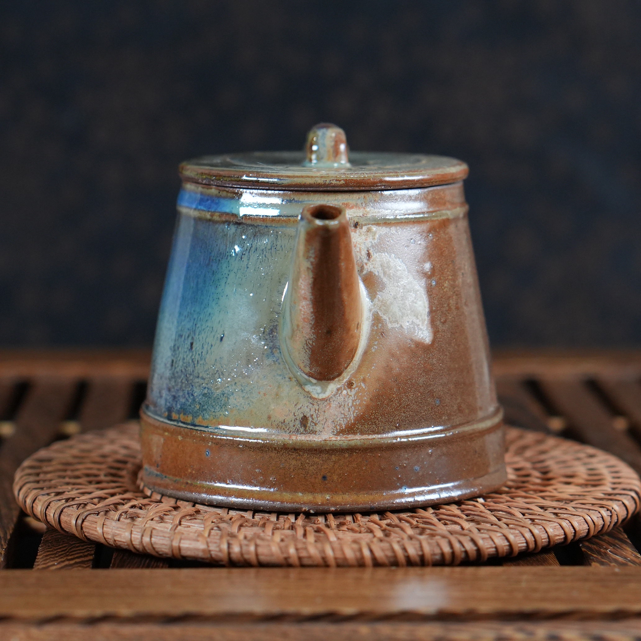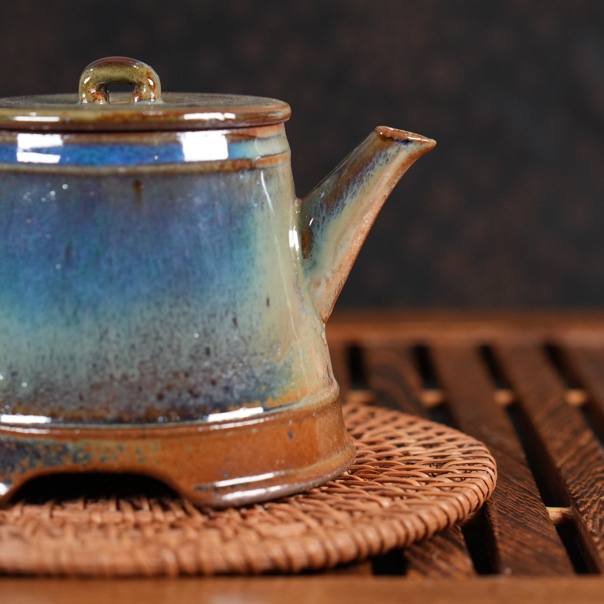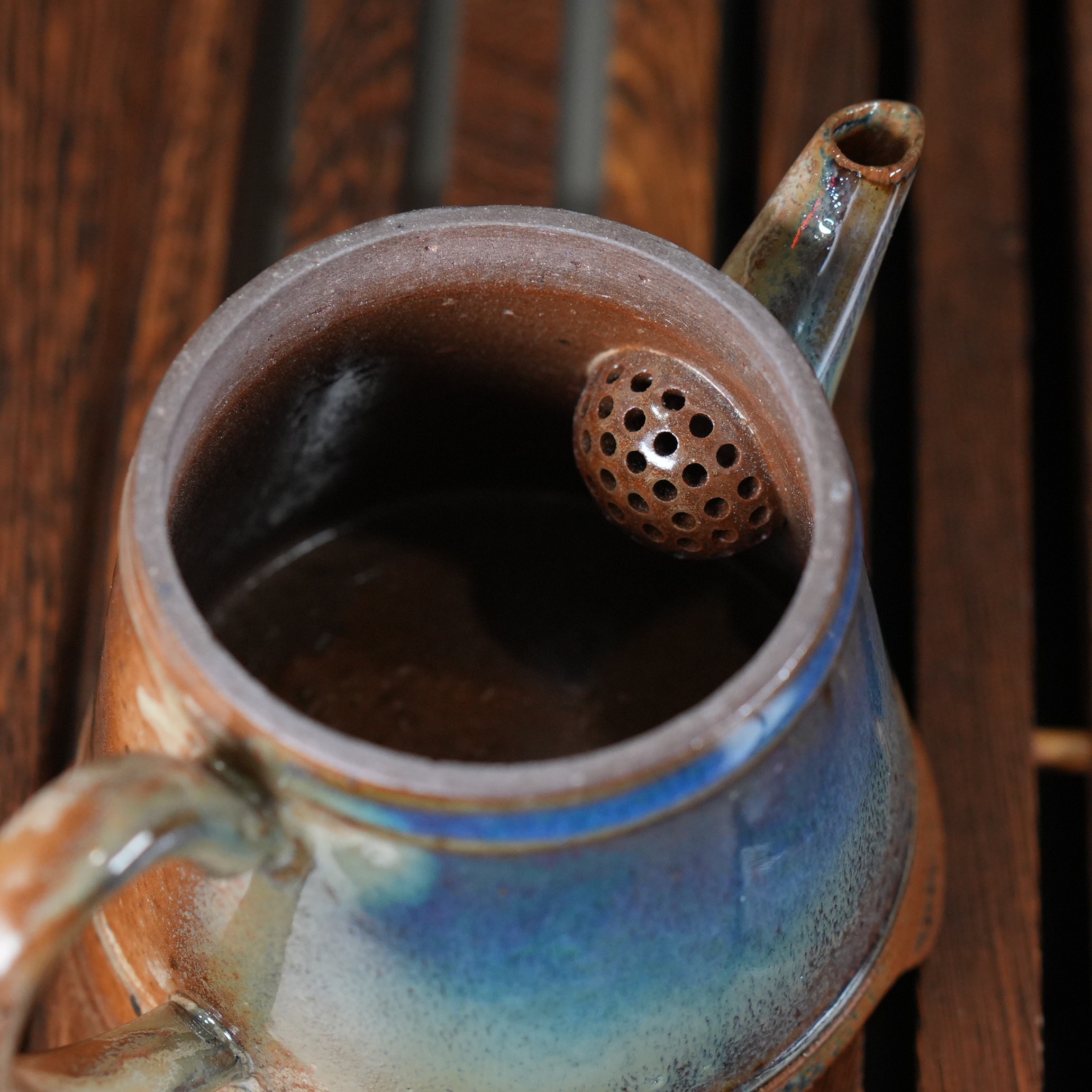 Это сочетание тёплого коричневого и холодных сине-зелёных тонов создаёт удивительный контраст, делающий чайник визуально сложным и интересным. Кажется, что внутри него горит свой, особенный свет.