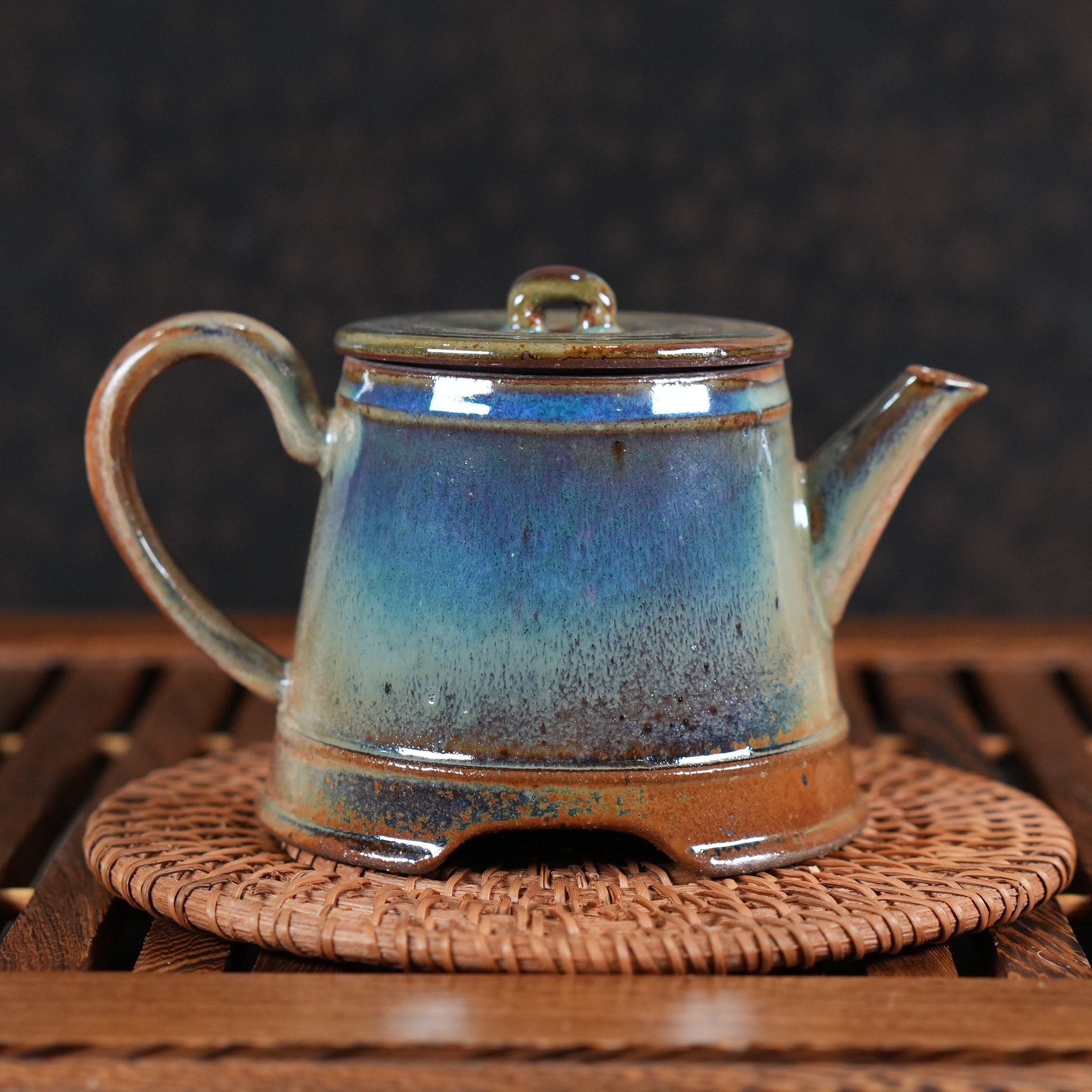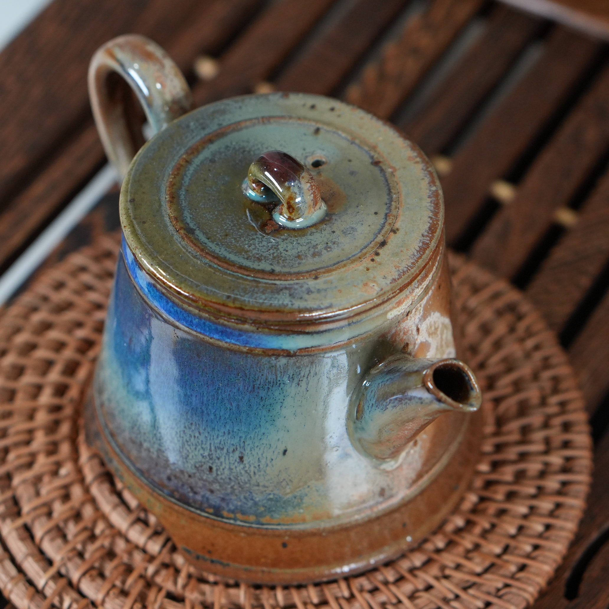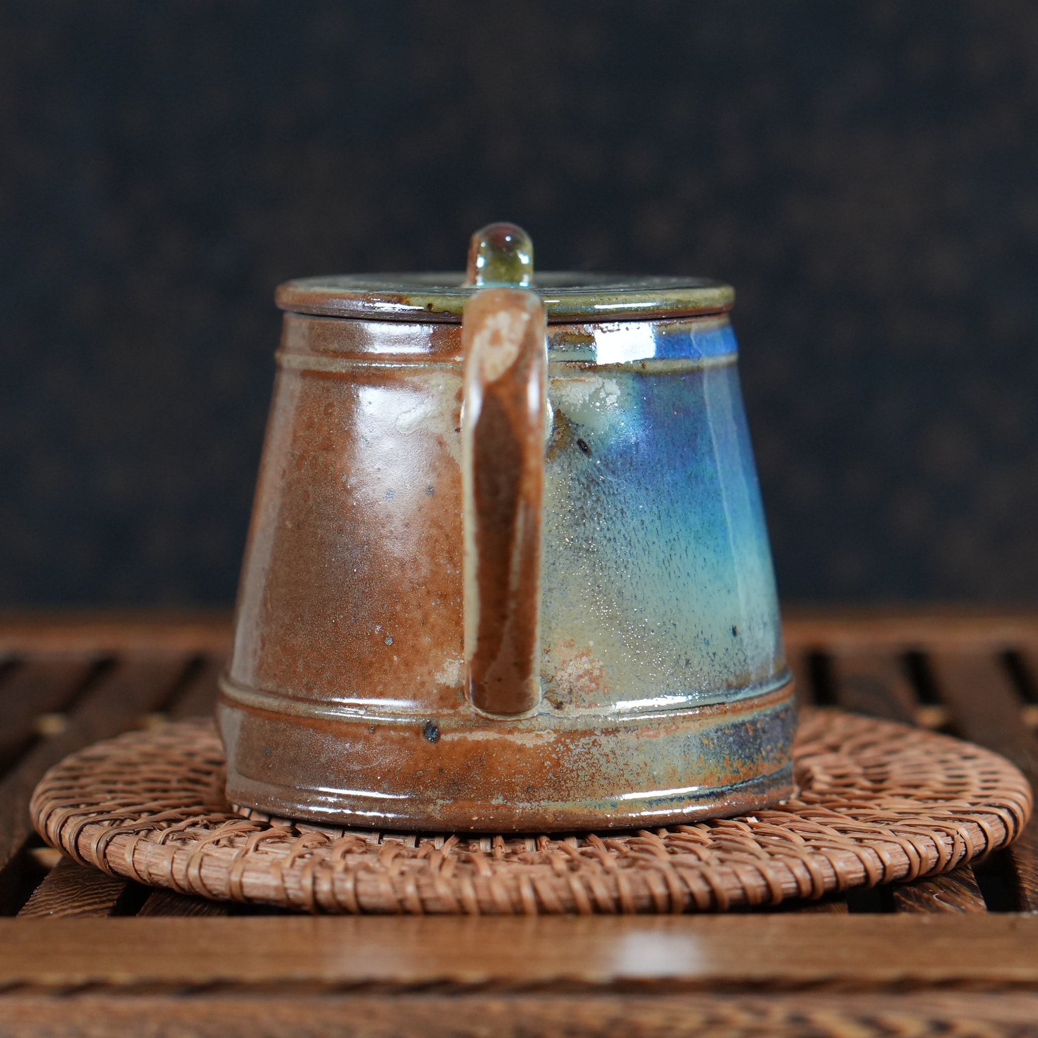 Это сочетание тёплого коричневого и холодных сине-зелёных тонов создаёт удивительный контраст, делающий чайник визуально сложным и интересным. Кажется, что внутри него горит свой, особенный свет.