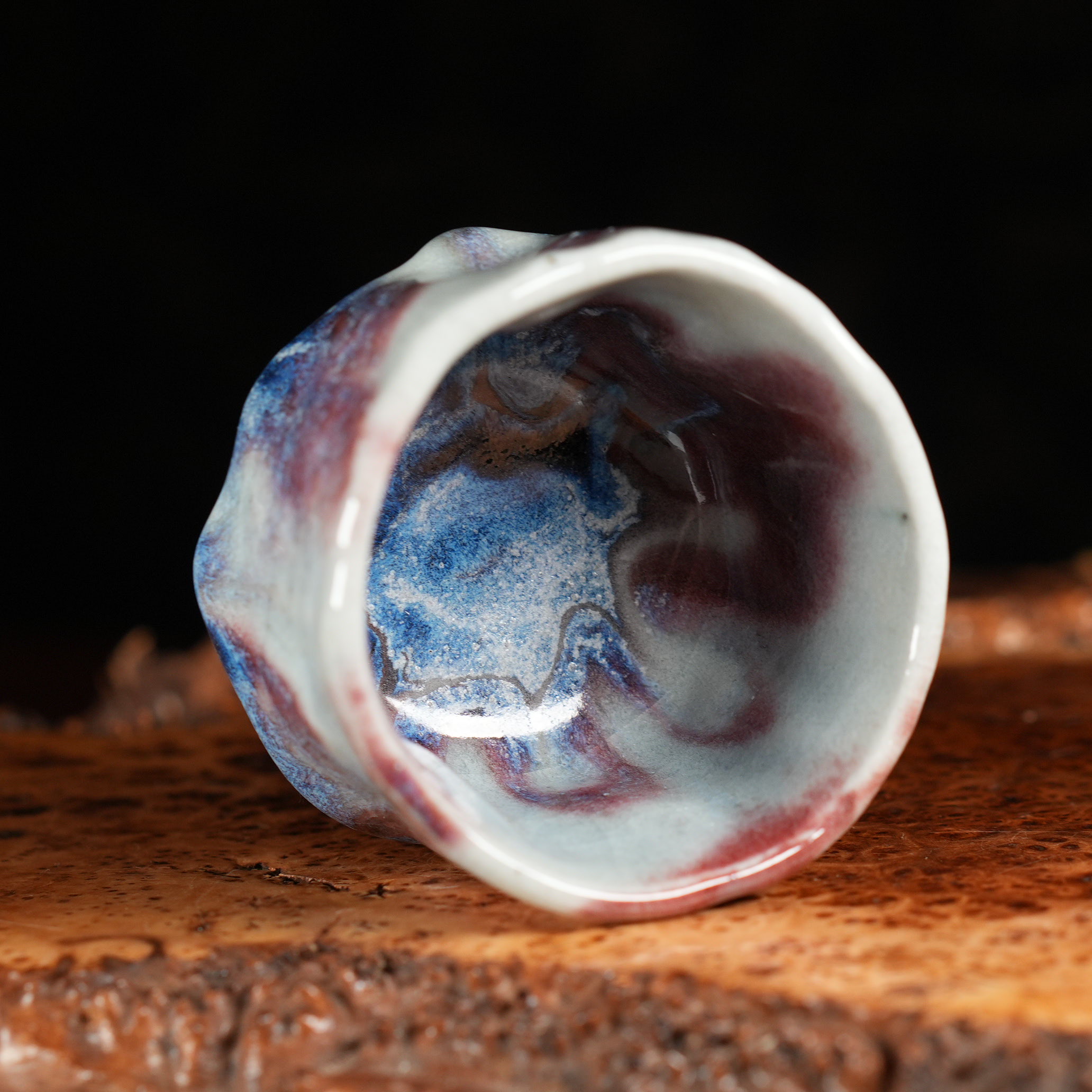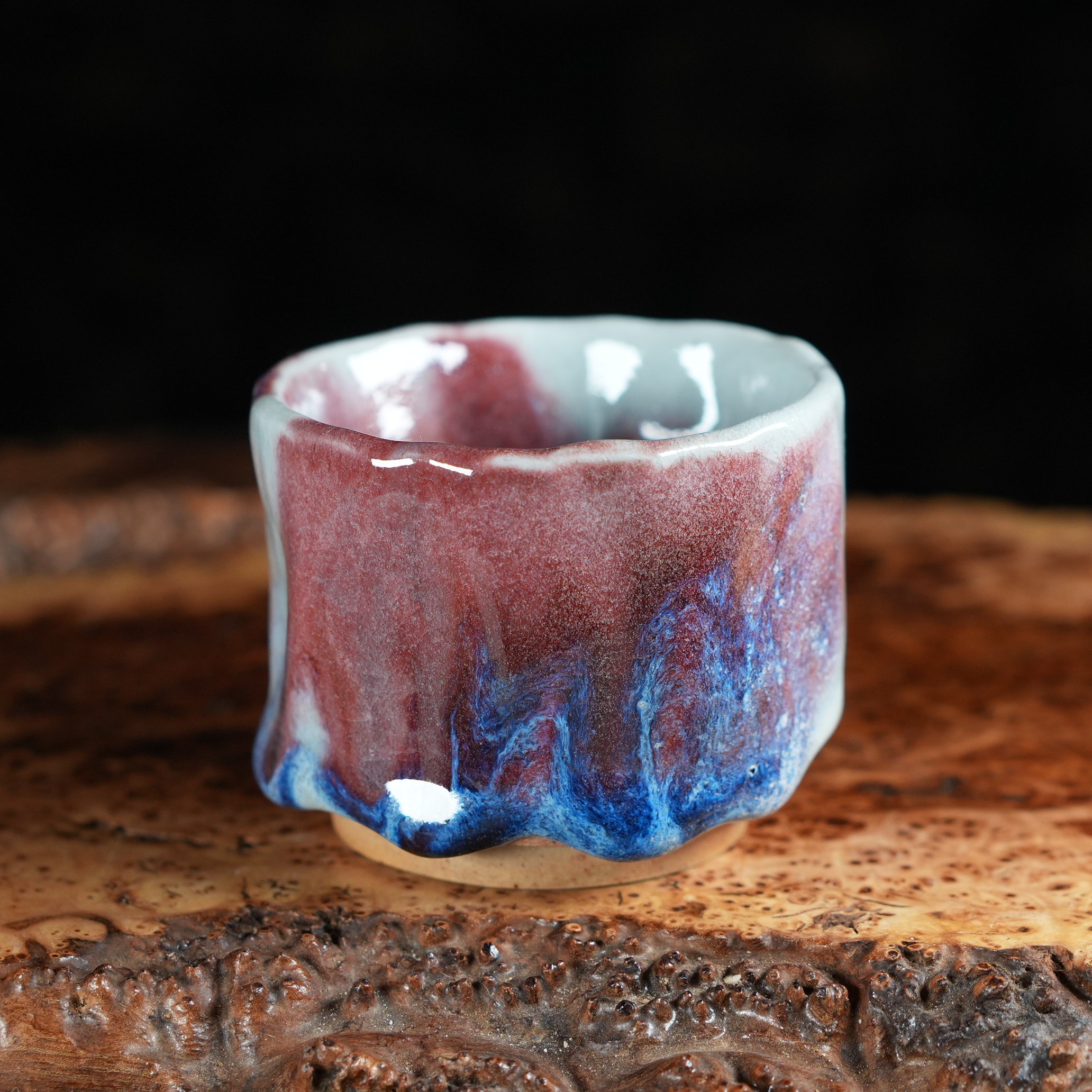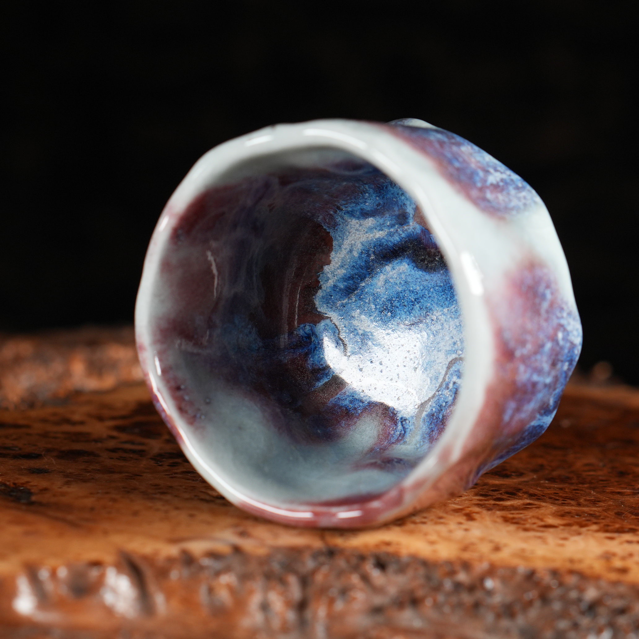 Глазурь нанесена смешанным слоем - она переливается, течёт, создаёт объём и глубину. В зависимости от освещения пиала может менять оттенок, открывая всё новые нюансы от холодных синих до тёплых бордовых.