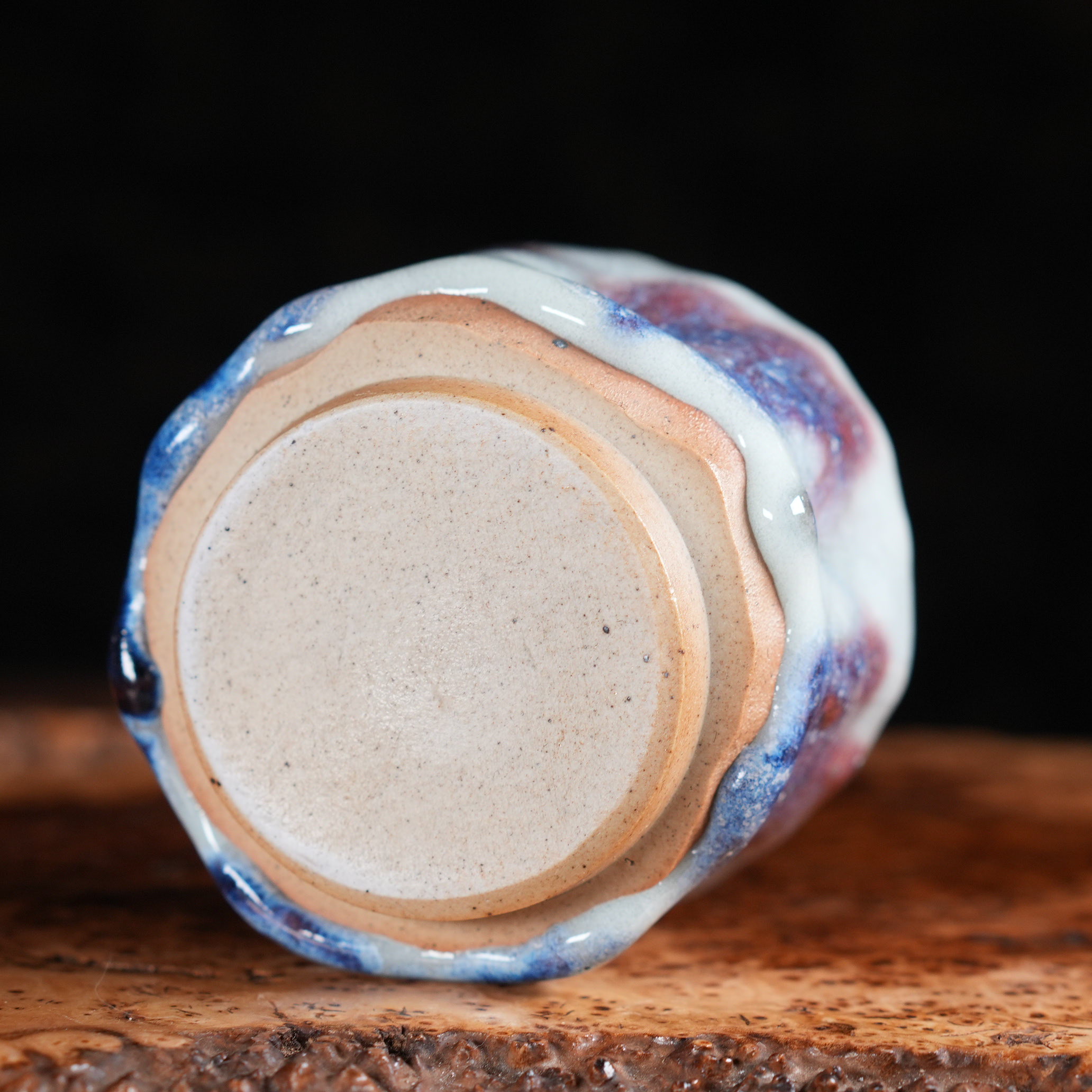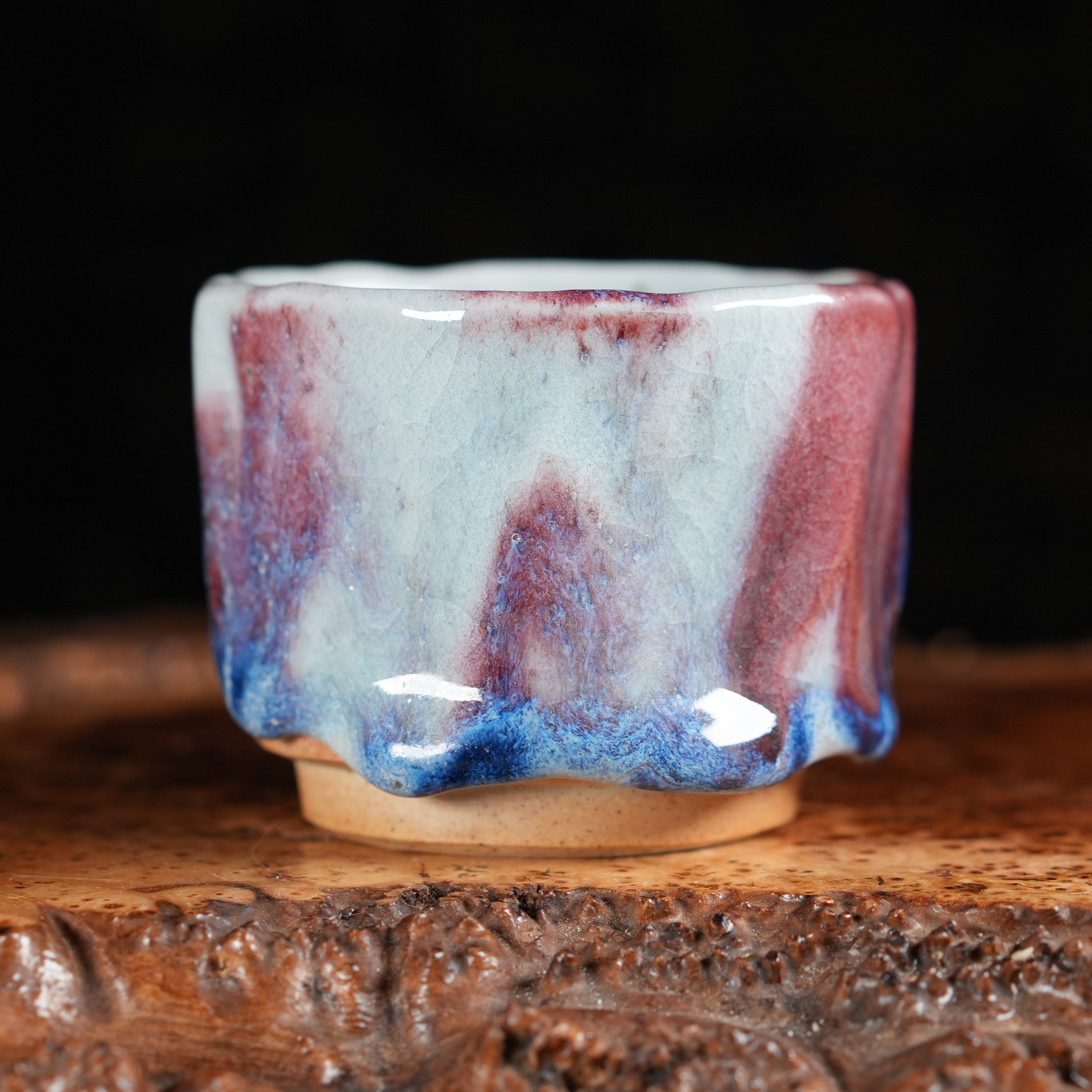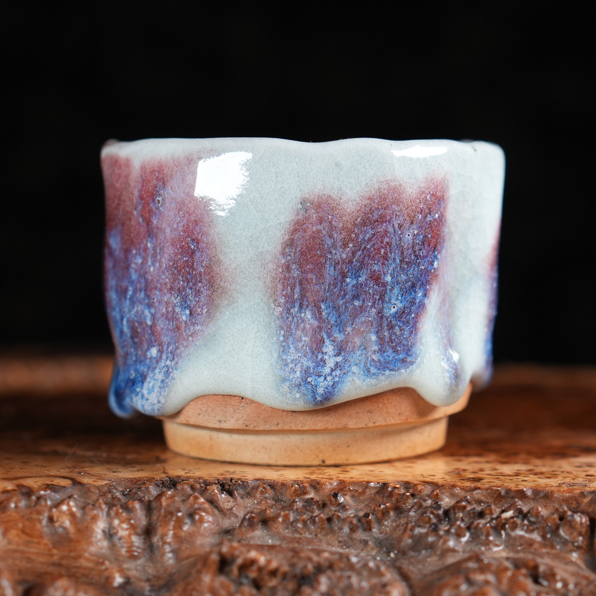 Глазурь нанесена смешанным слоем - она переливается, течёт, создаёт объём и глубину. В зависимости от освещения пиала может менять оттенок, открывая всё новые нюансы от холодных синих до тёплых бордовых.