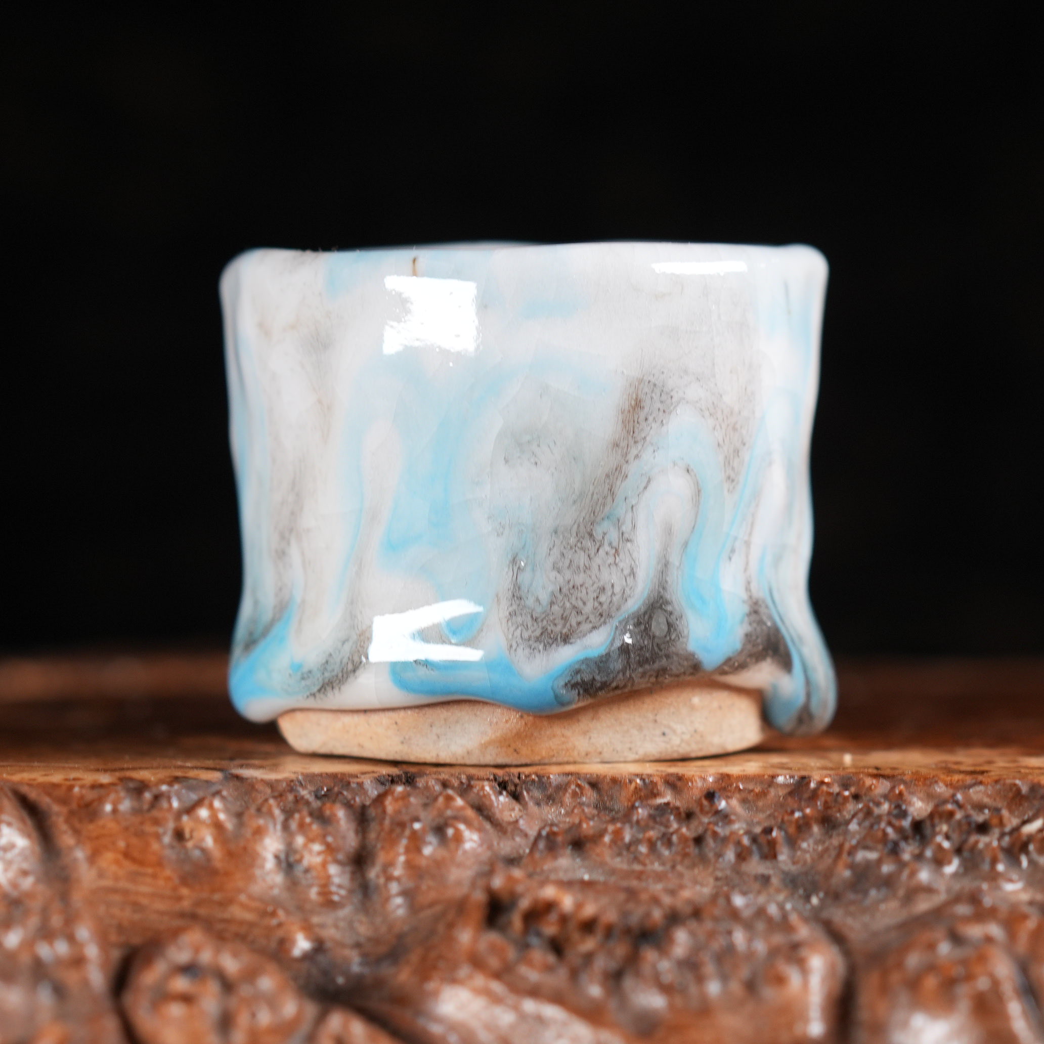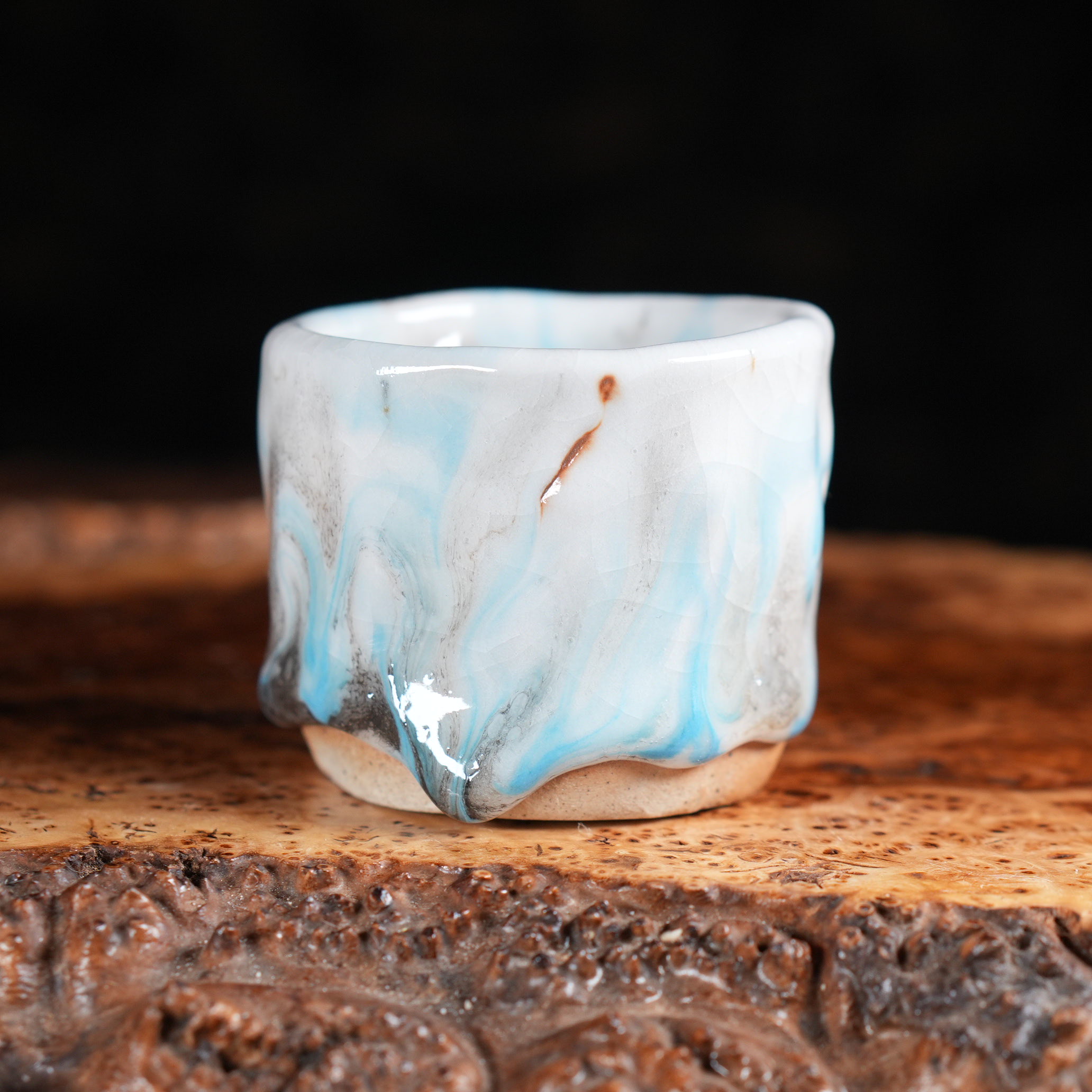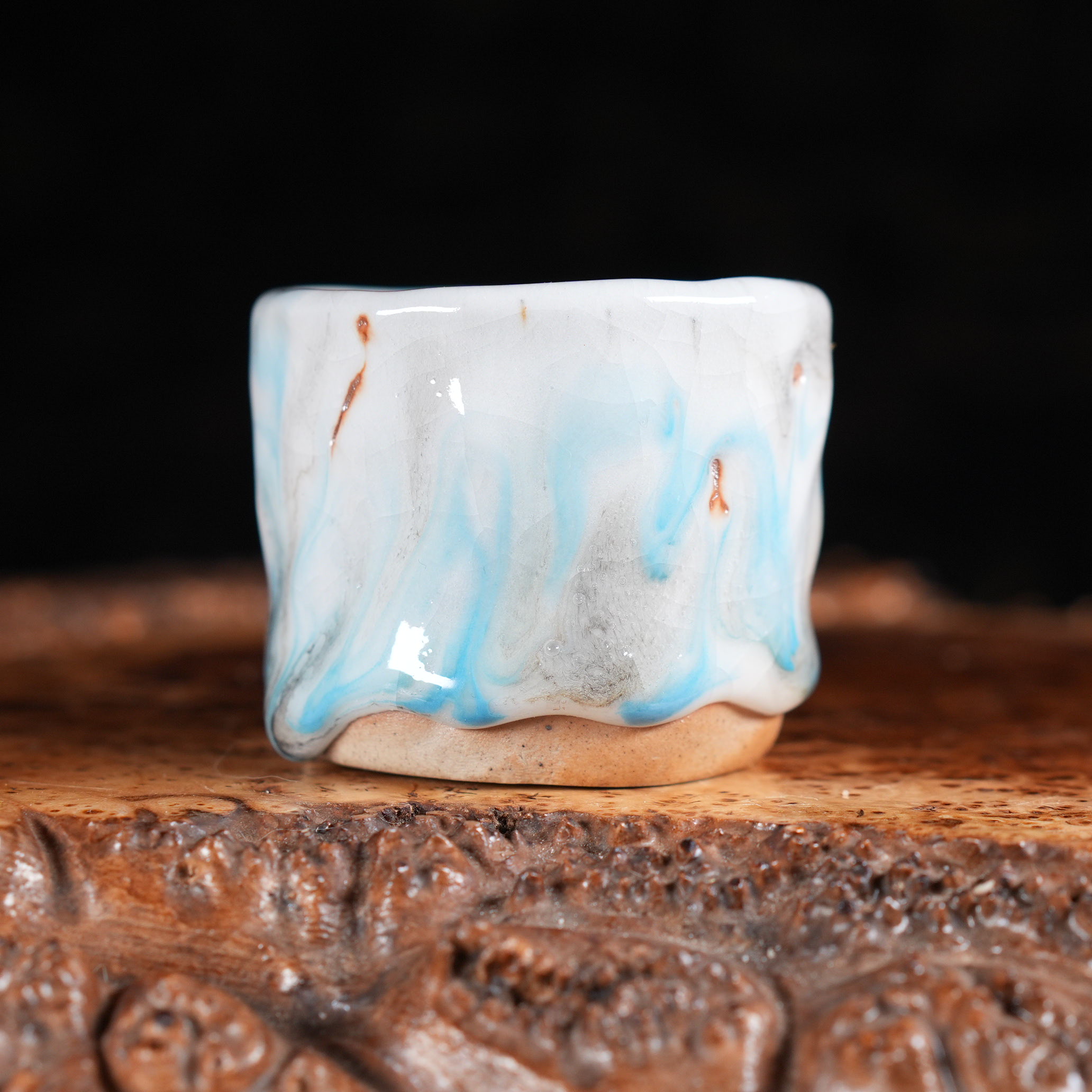 Пиала покрыта сложной многослойной глазурью, напоминающей морскую пену и прибрежные волны: