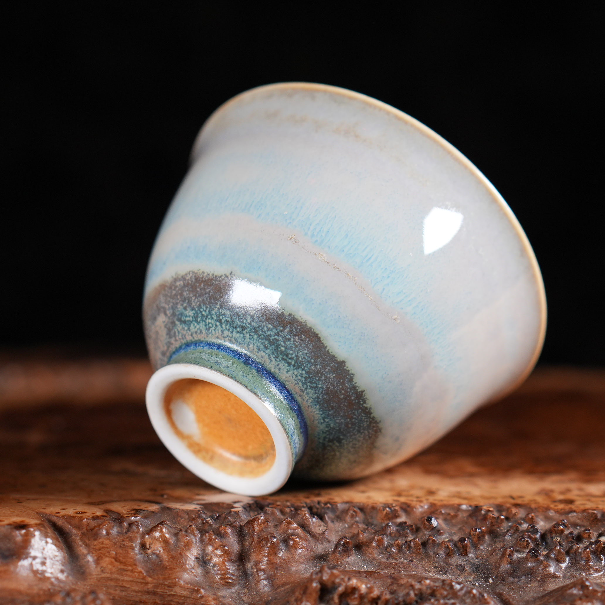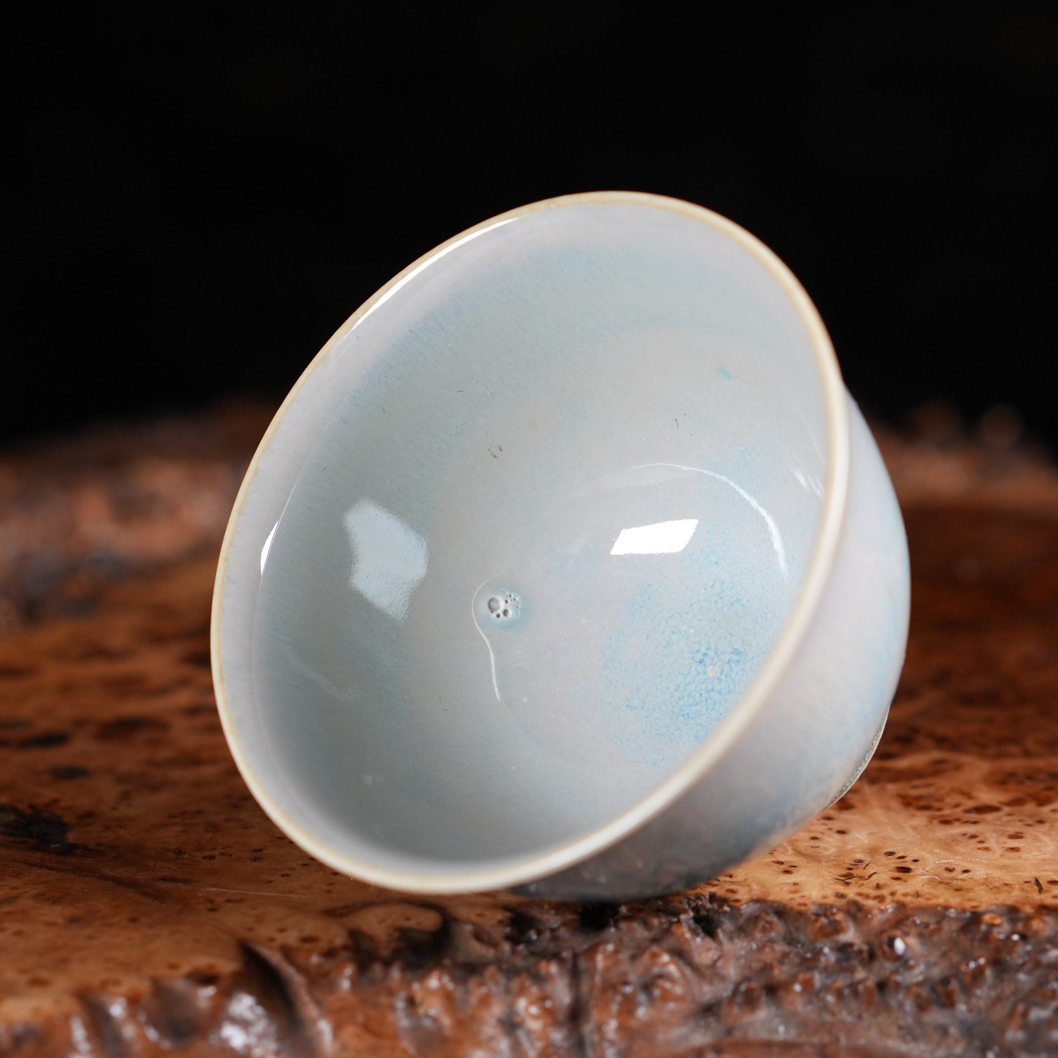 Верхняя часть пиалы покрыта нежно-голубой глазурью, напоминающей: