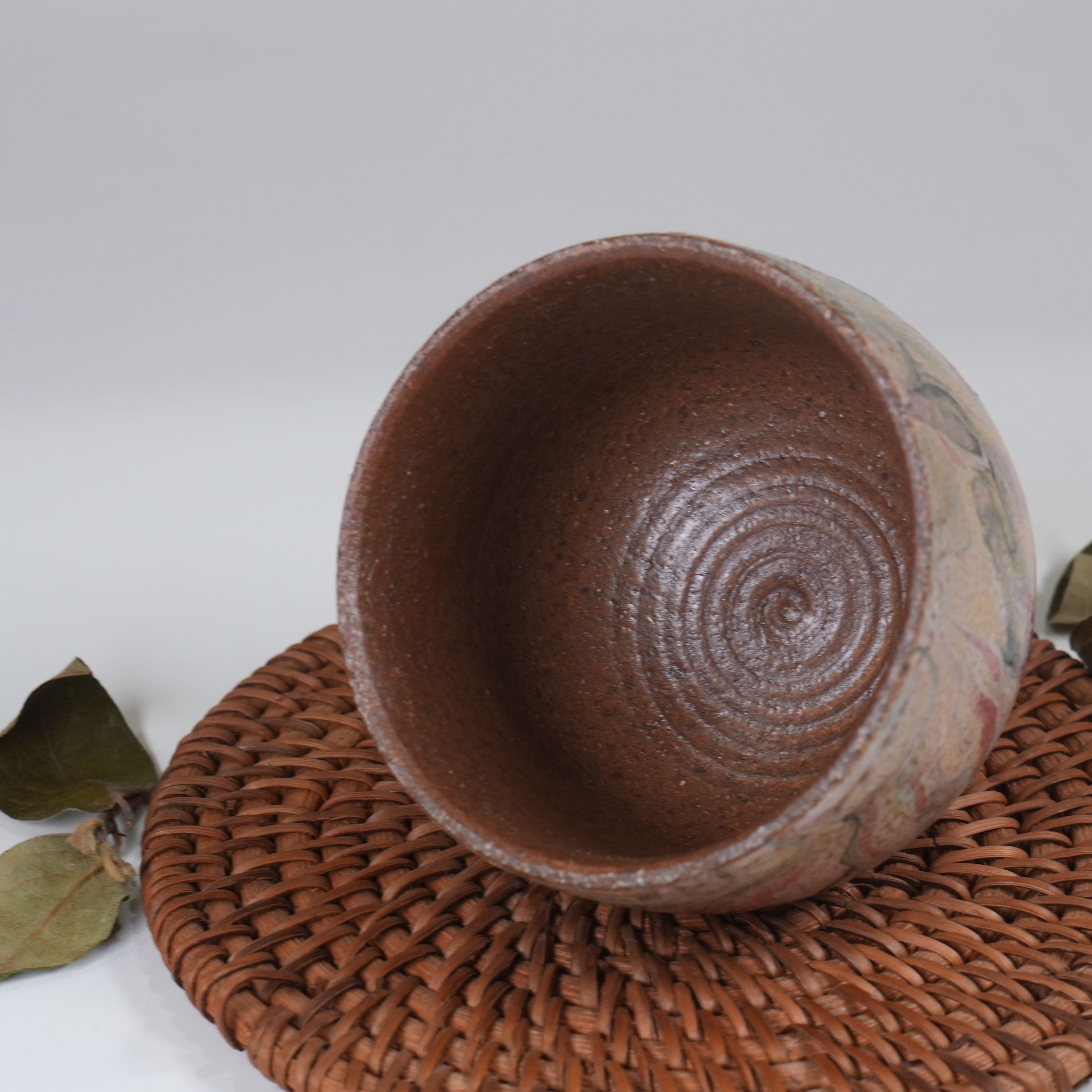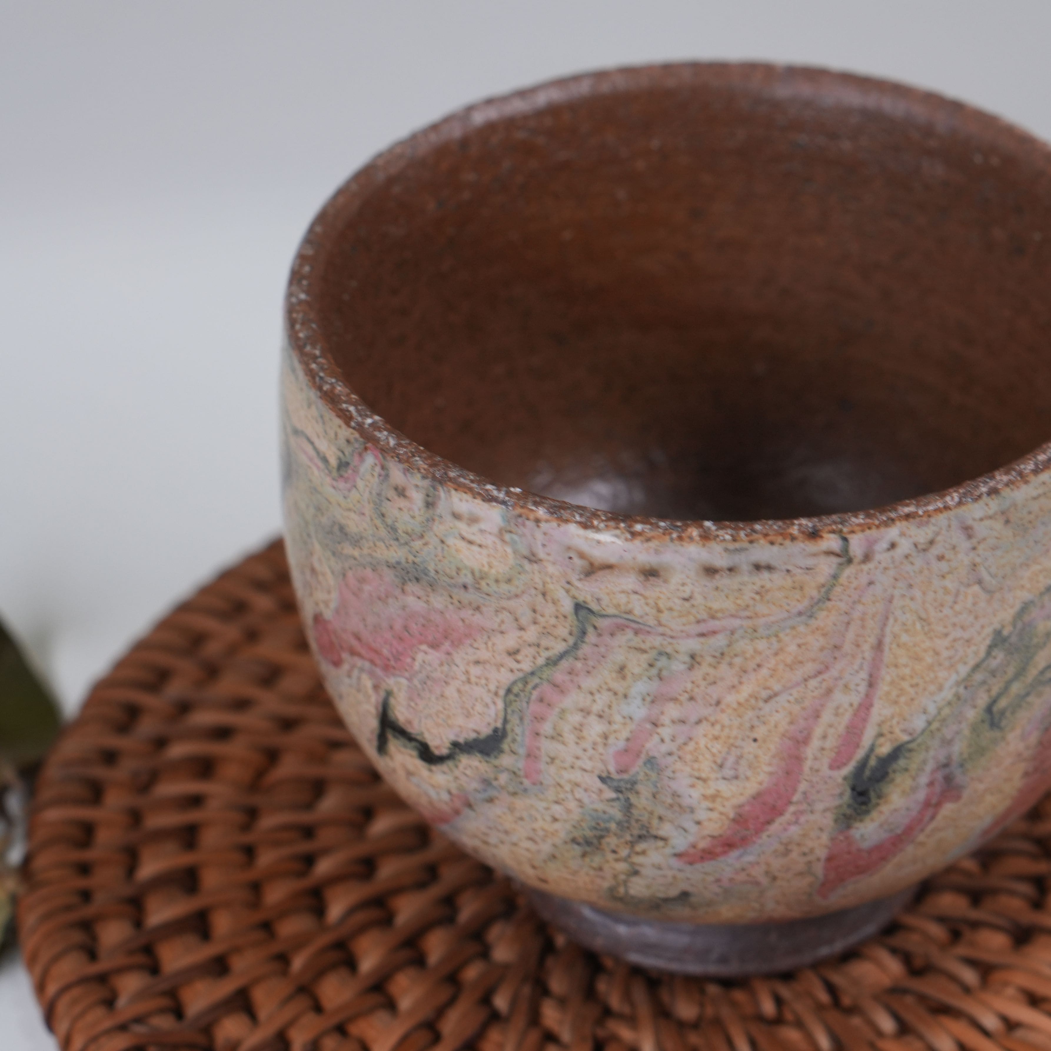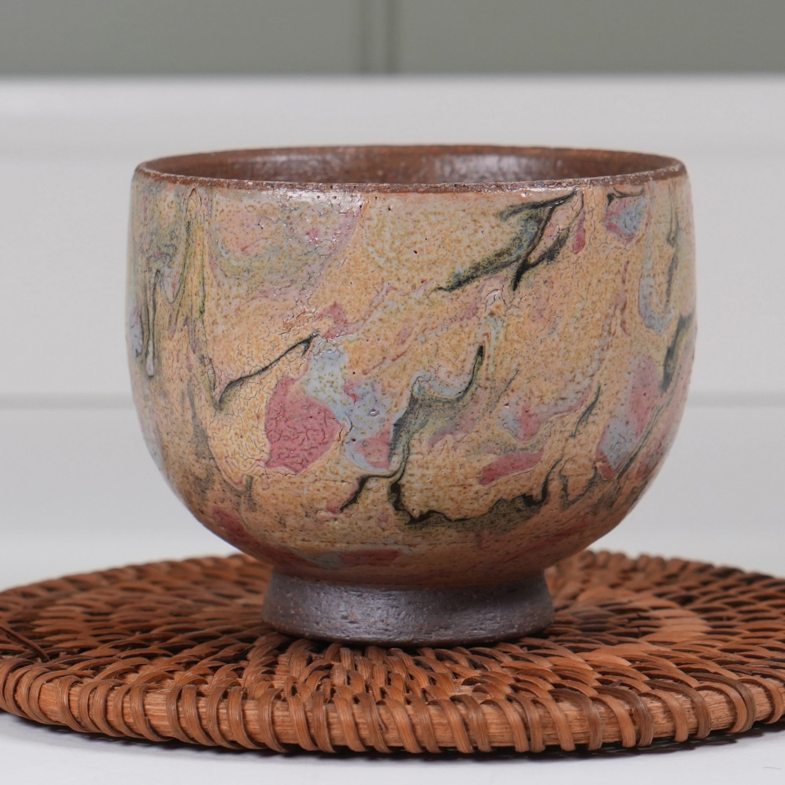 Грубый в основе черепок из глины Сябони, покрыт многослойной разноцветной глазурью.