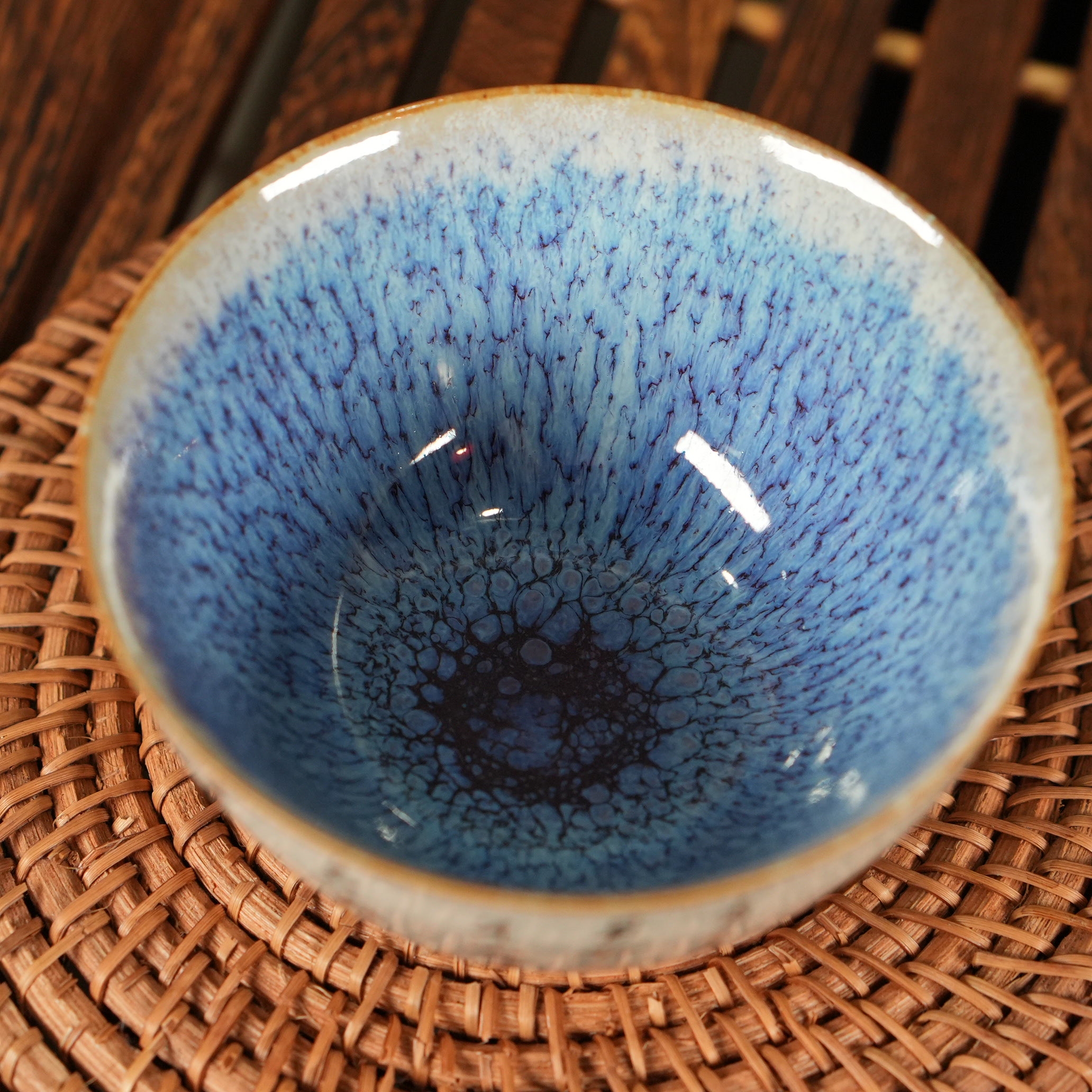 Внутренняя поверхность пиалы покрыта уникальной «павлиньей глазурью» в насыщенных синих оттенках. Эта глазурь создаёт глубокий, мерцающий фон, напоминающий переливы павлиньих перьев - то тёмно-синий, то изумрудный, то с фиолетовыми искрами. Благодаря сложному составу и особой технике нанесения, оттенок меняется в зависимости от освещения и угла обзора, делая каждое чаепитие маленьким визуальным путешествием.