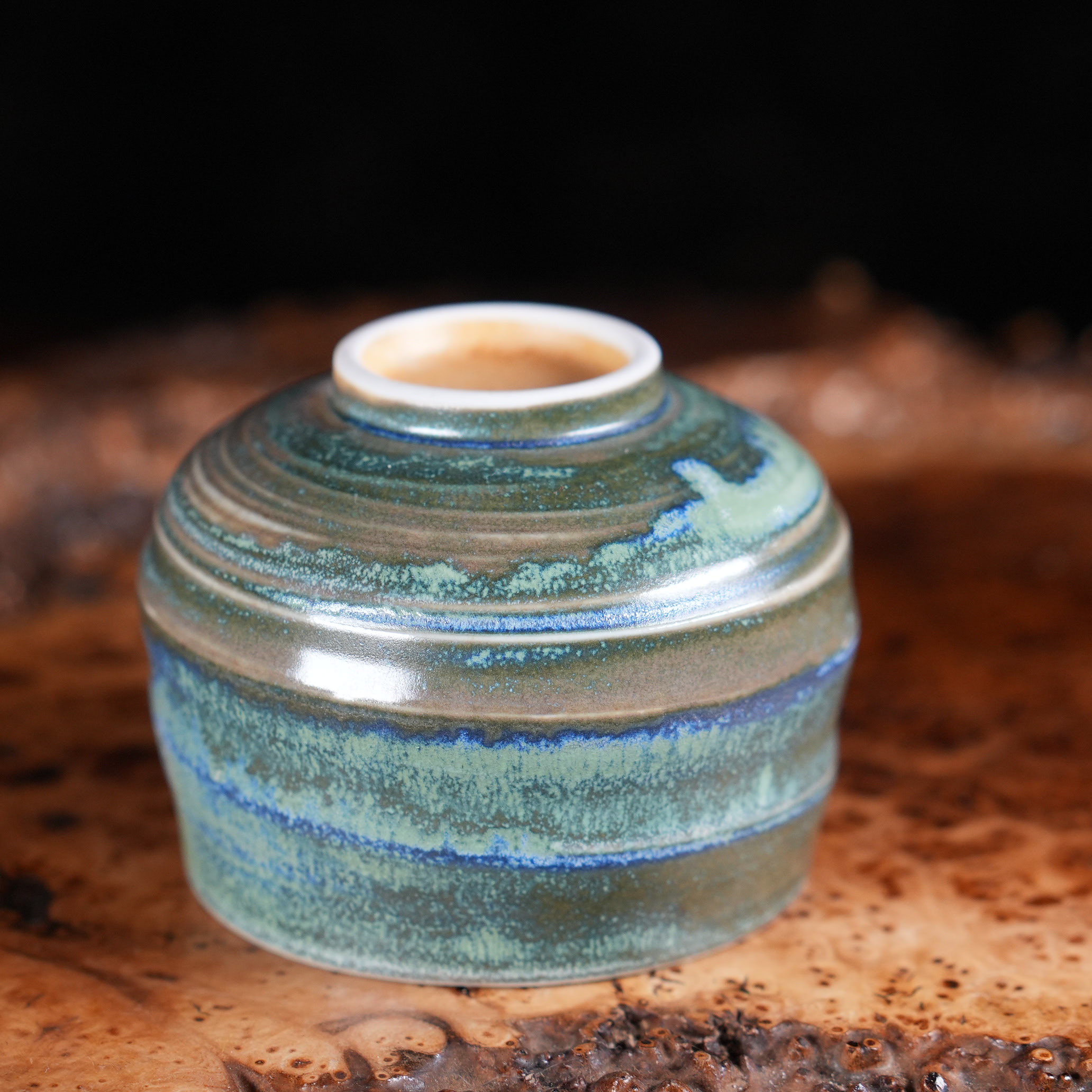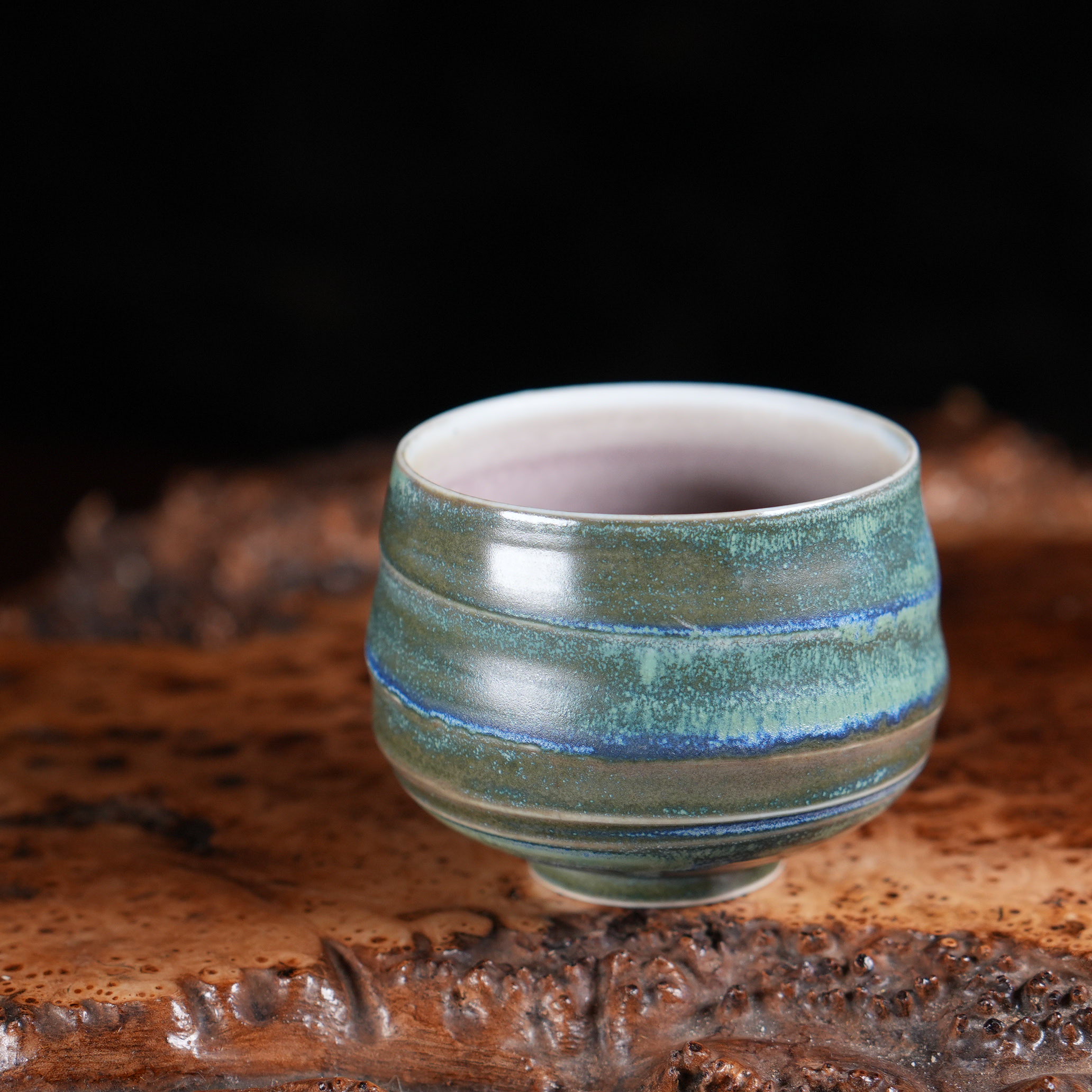 Пиала создана вручную мастерами Цзиндэчжэня. Концентрические борозды, форма бутона, насыщенная зелёная глазурь снаружи и нежная пепельно-розовая внутри - каждый элемент выполнен вручную и существует в единственном экземпляре. Вы получаете не тиражное изделие, а личную работу мастера.