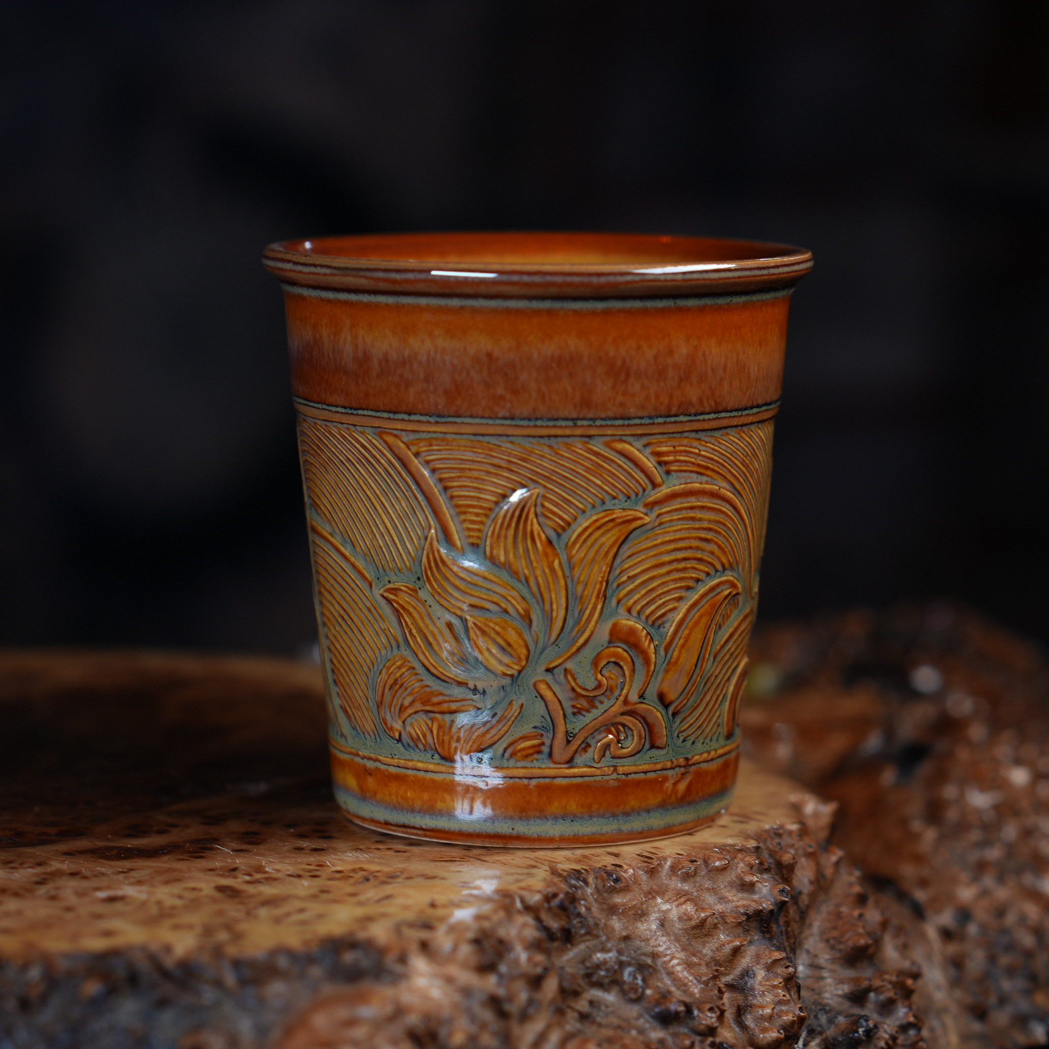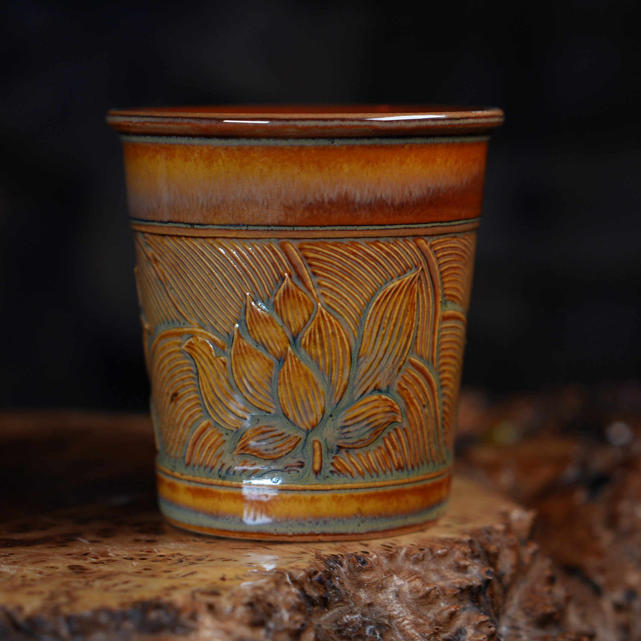 Красивая высокая пиала в форме маленького стакана с изображением трёх лотосов.