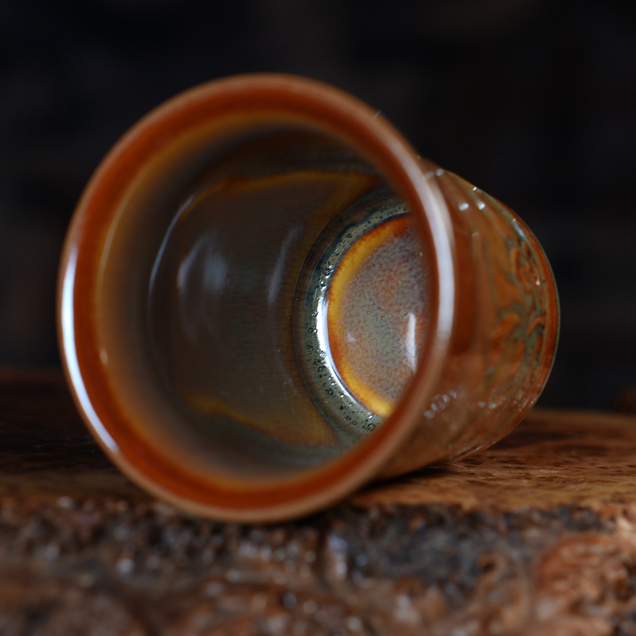 Многослойная глазурь в коричнево-золотых оттенках с серыми прожилками.