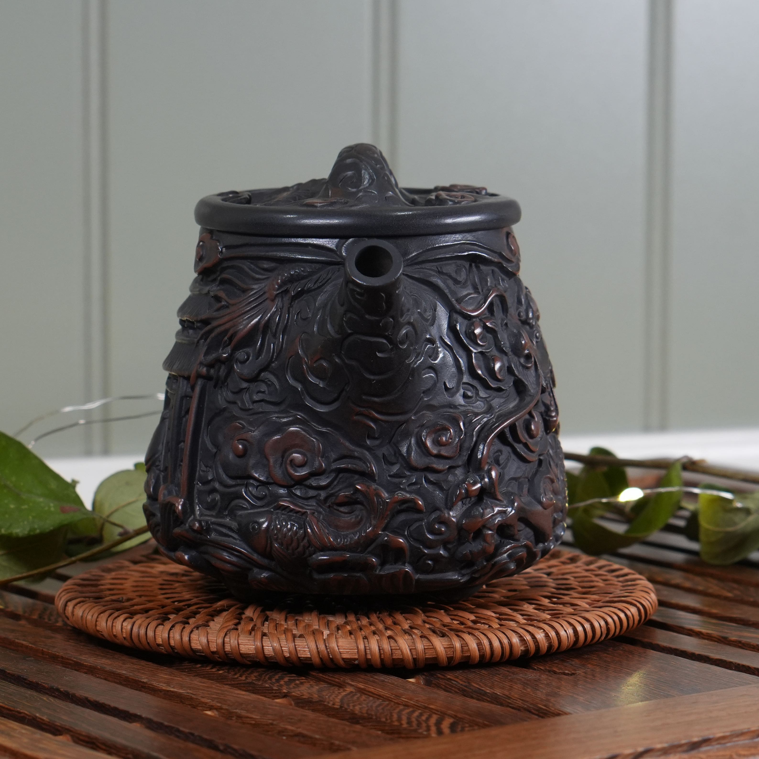Карп и дракон, изображённые на стенках чайника, в китайской культуре связаны через легенду о Вратах Дракона. По ней, карп плыл вверх, преодолевая водопады и прочие препятствия, чтобы добраться до вершины горы. Когда он достиг вершины, то превратился в дракона, одного из самых величественных существ.
