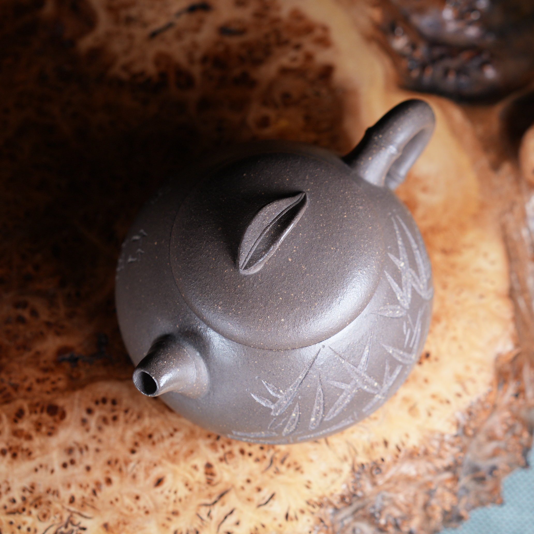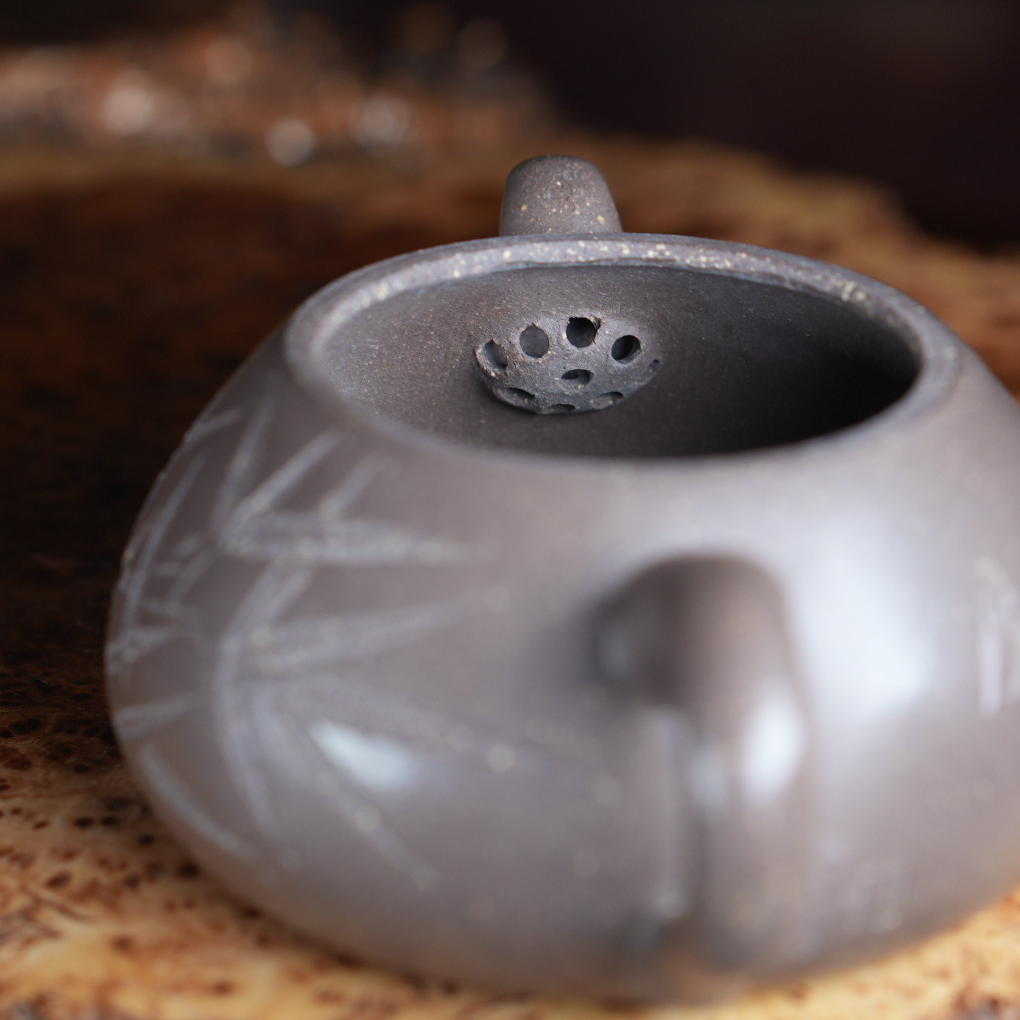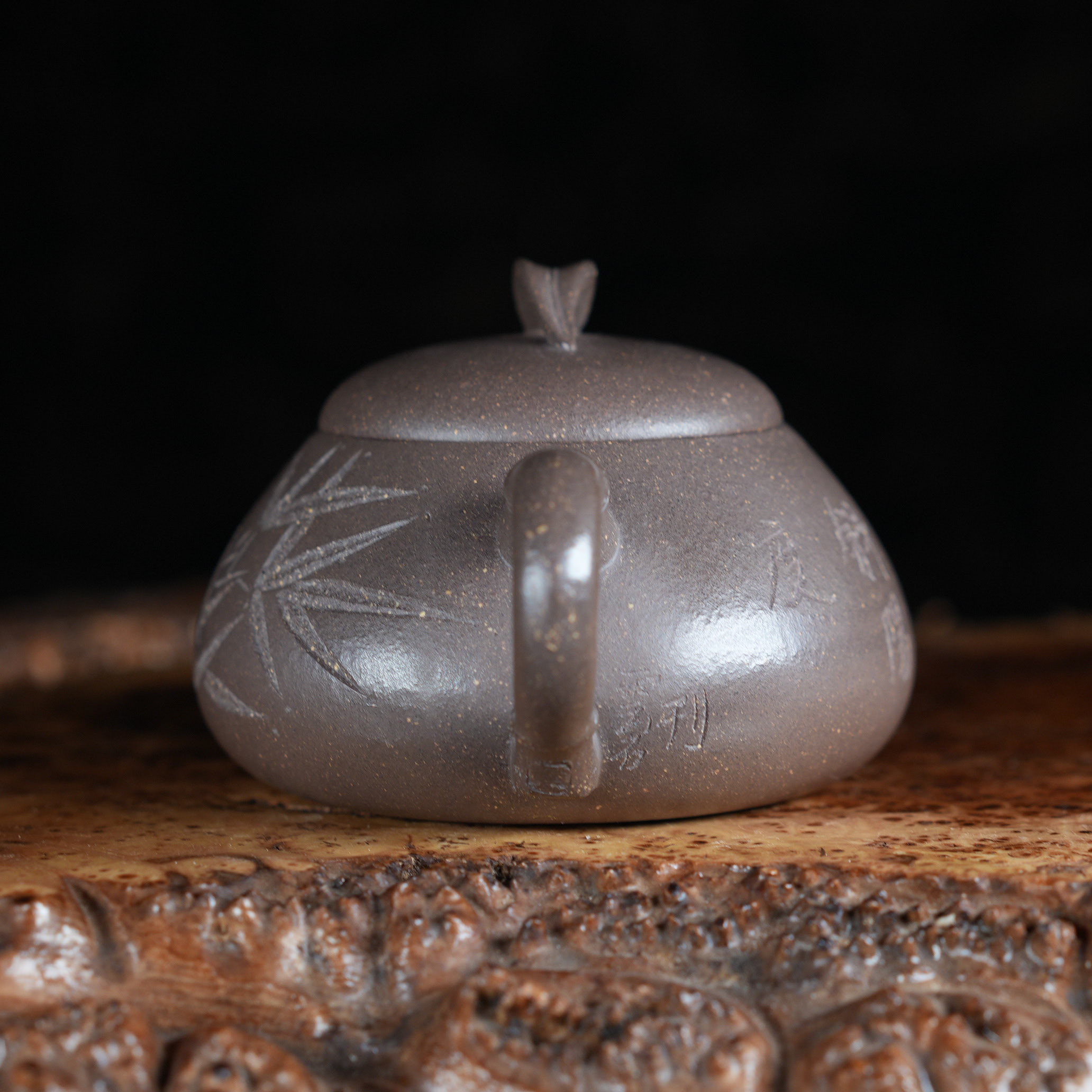 В этом чайнике бамбук проявляется во всём: в форме ручки и носика, в гравировке на корпусе, в поэтической надписи. Он напоминает о благородстве и стойкости, о способности сохранять внутреннюю чистоту и гармонию, даже когда вокруг бури и закаты.