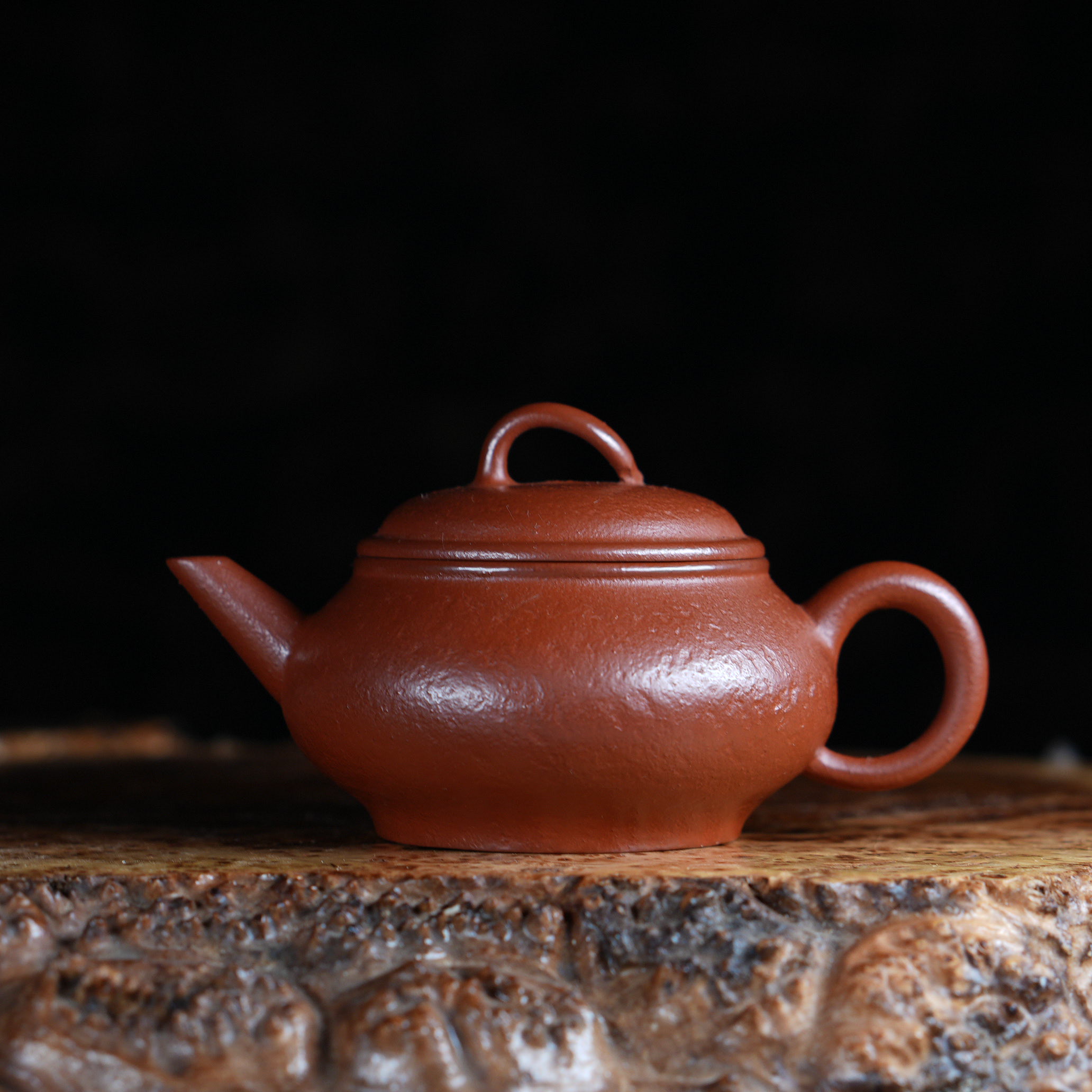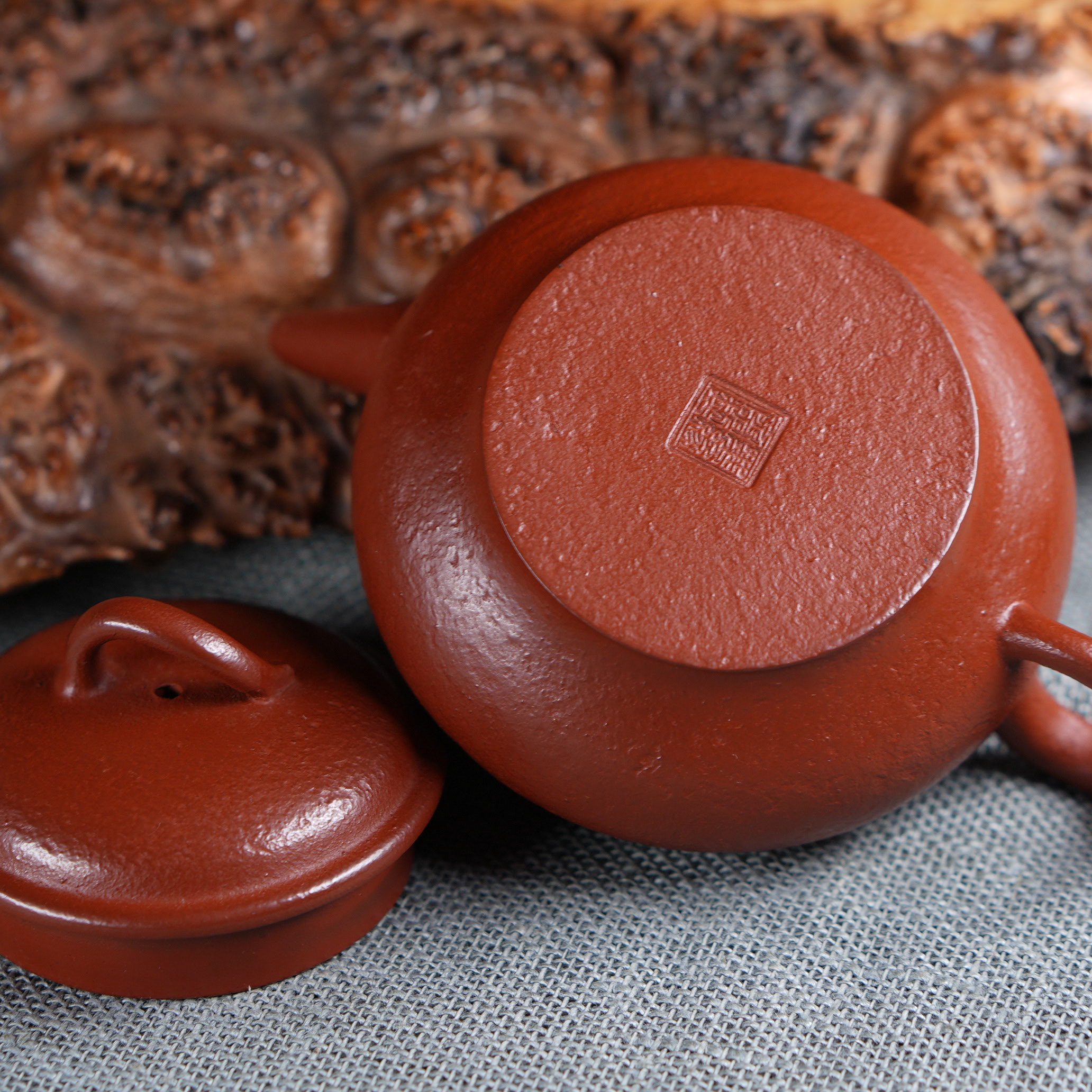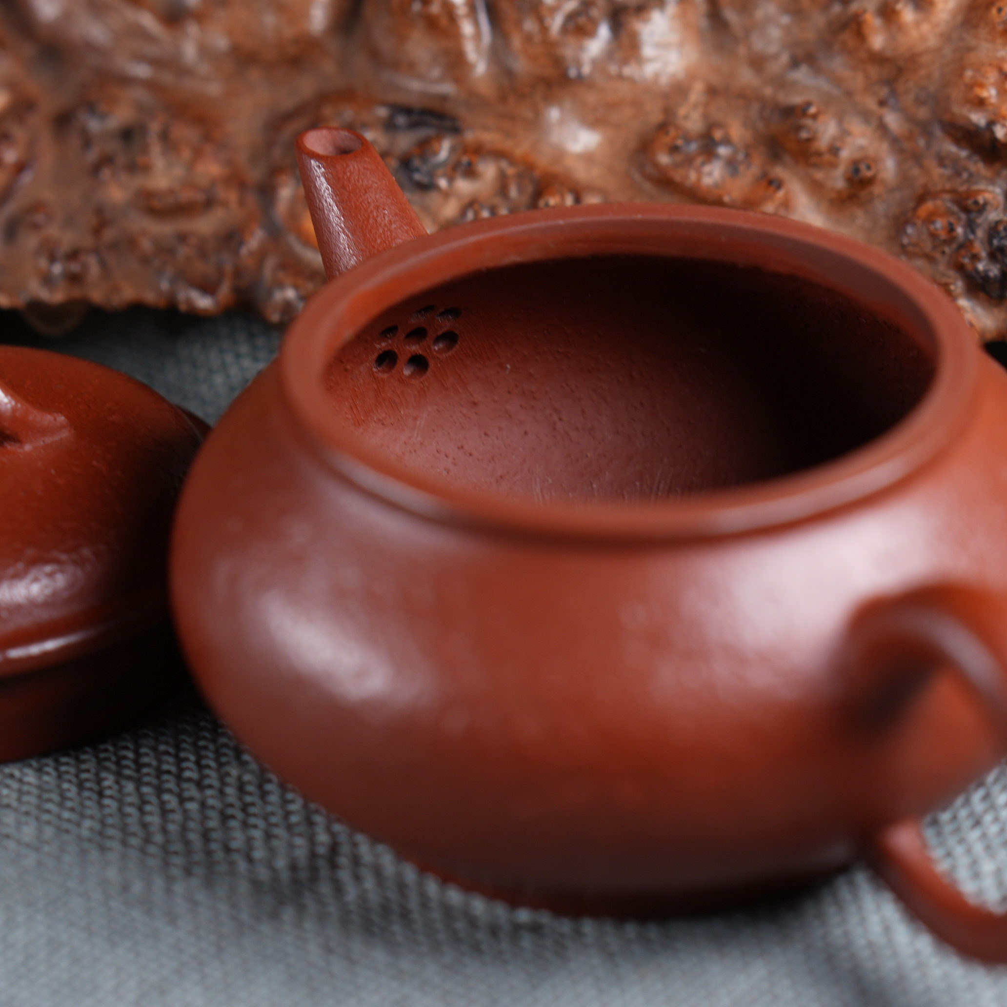 Чайник выполнен из красной исинской глины Чжу Ни (朱泥), которая отличается особой плотностью и благородным красновато-оранжевым оттенком после обжига. Чжу Ни — одна из самых ценимых исинских глин, известная своим мелкозернистым строением и способностью придавать чайному настою особую мягкость и округлость.