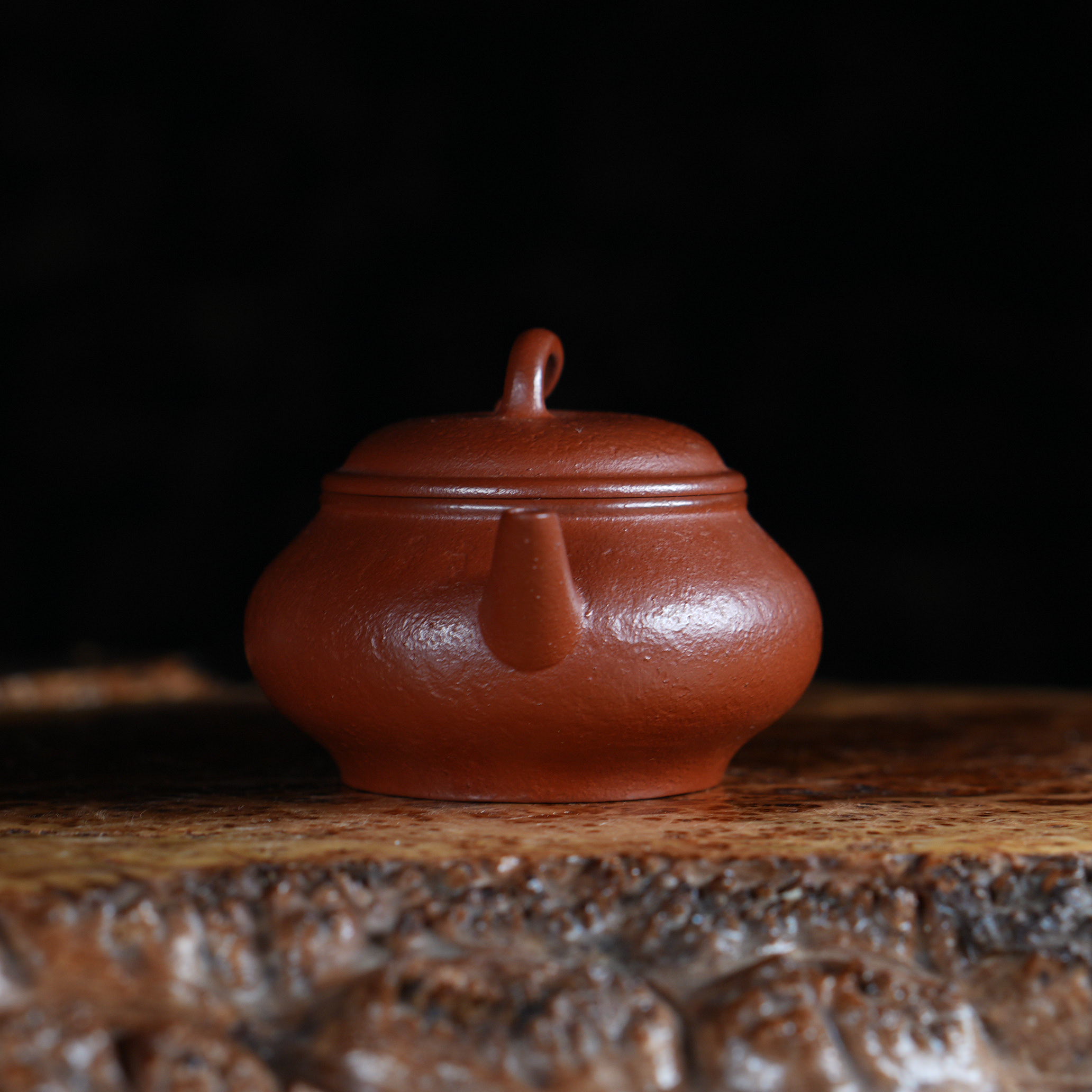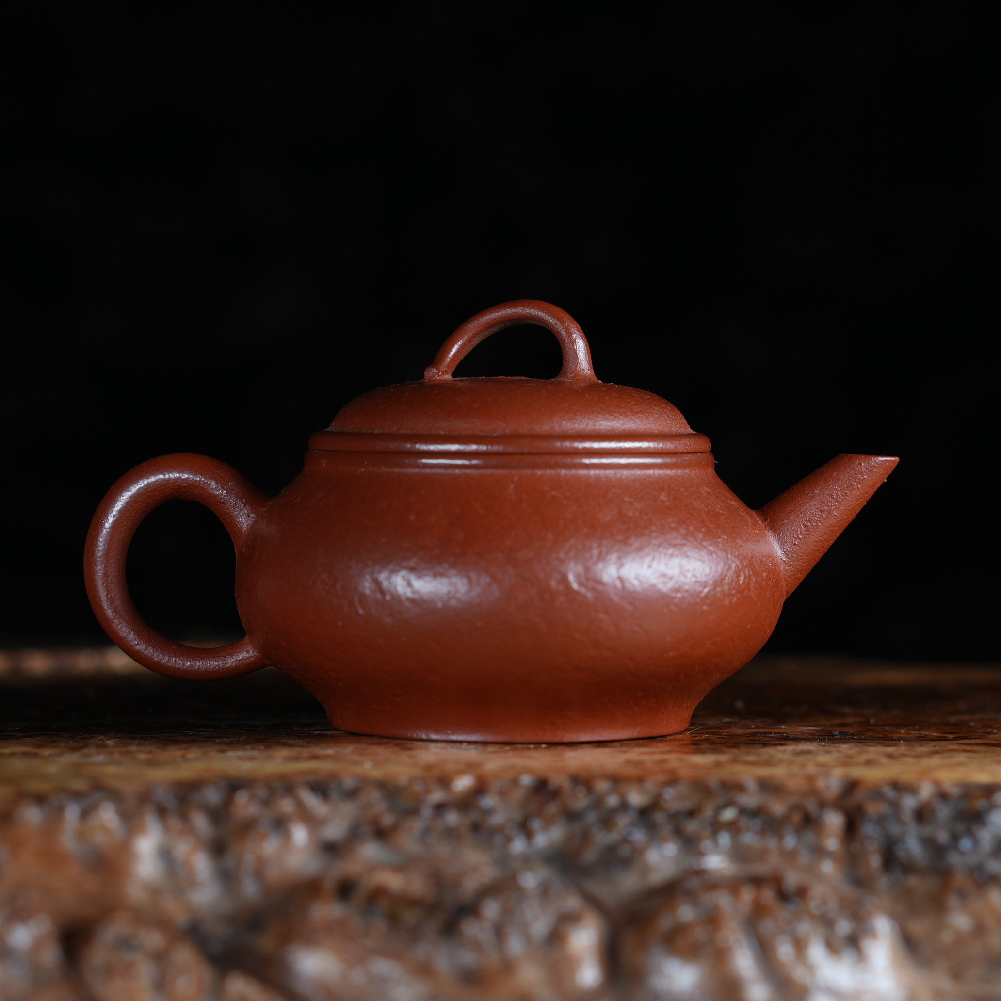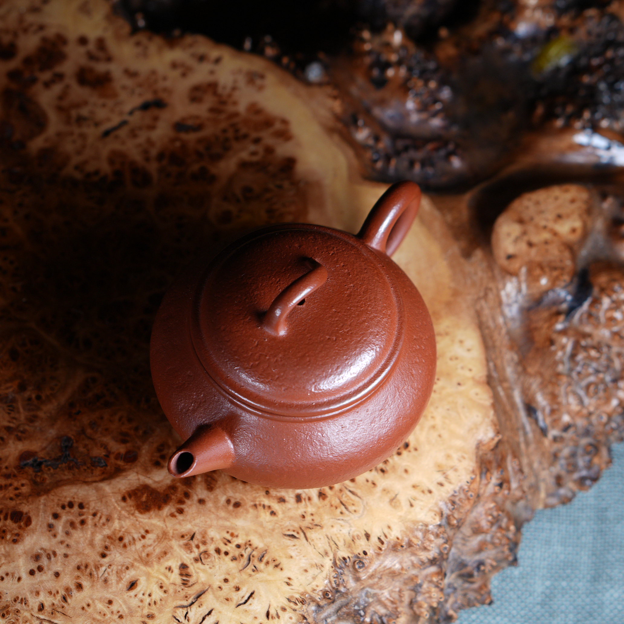 Чайник выполнен из красной исинской глины Чжу Ни (朱泥), которая отличается особой плотностью и благородным красновато-оранжевым оттенком после обжига. Чжу Ни — одна из самых ценимых исинских глин, известная своим мелкозернистым строением и способностью придавать чайному настою особую мягкость и округлость.