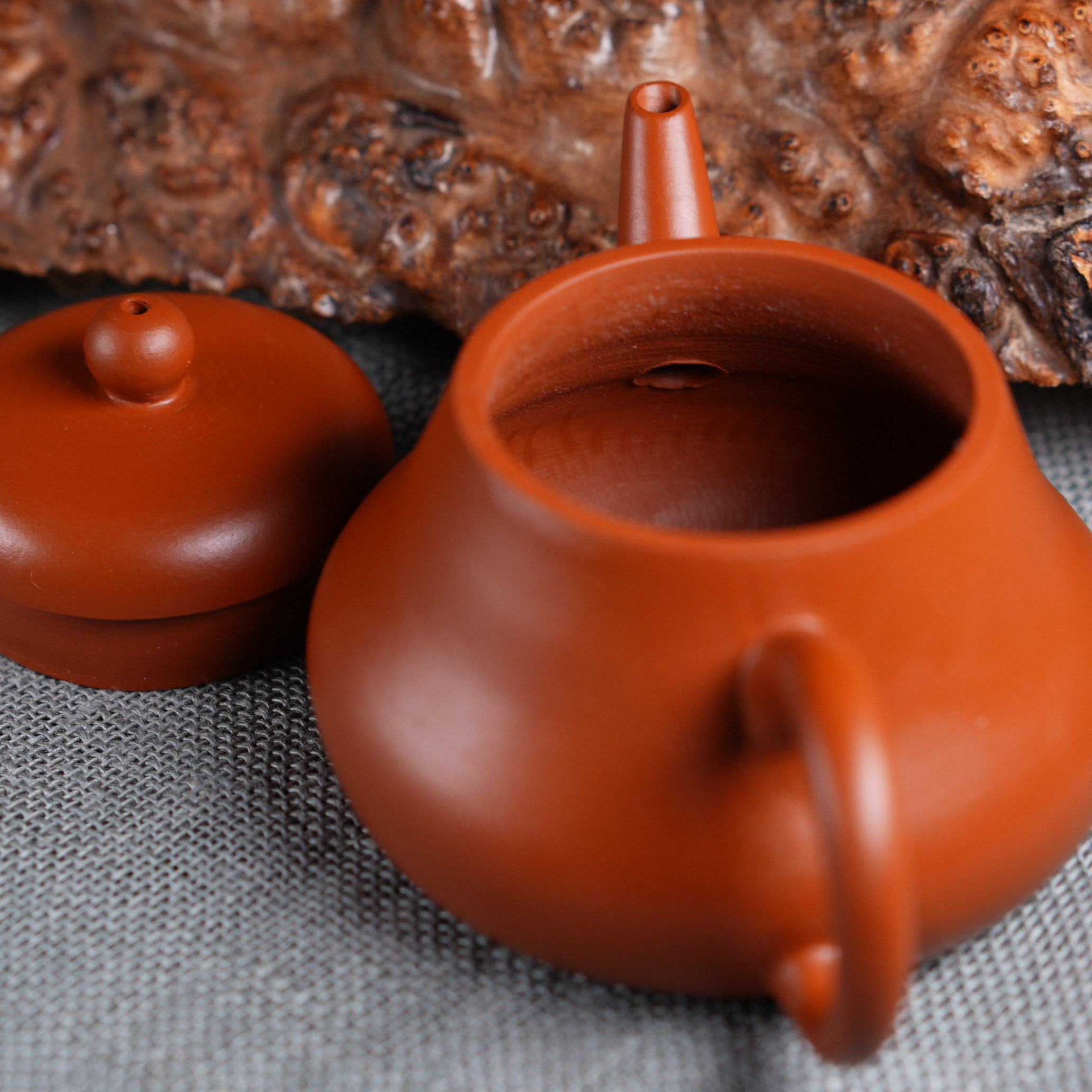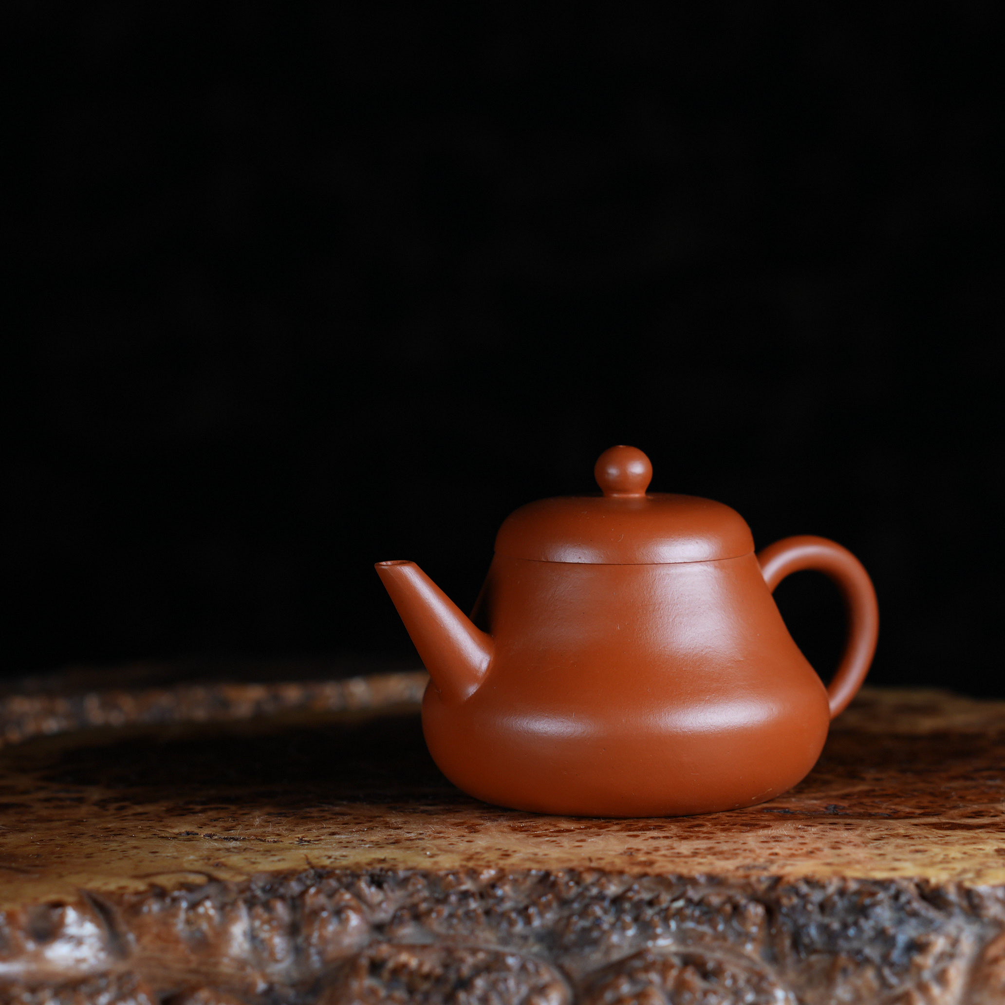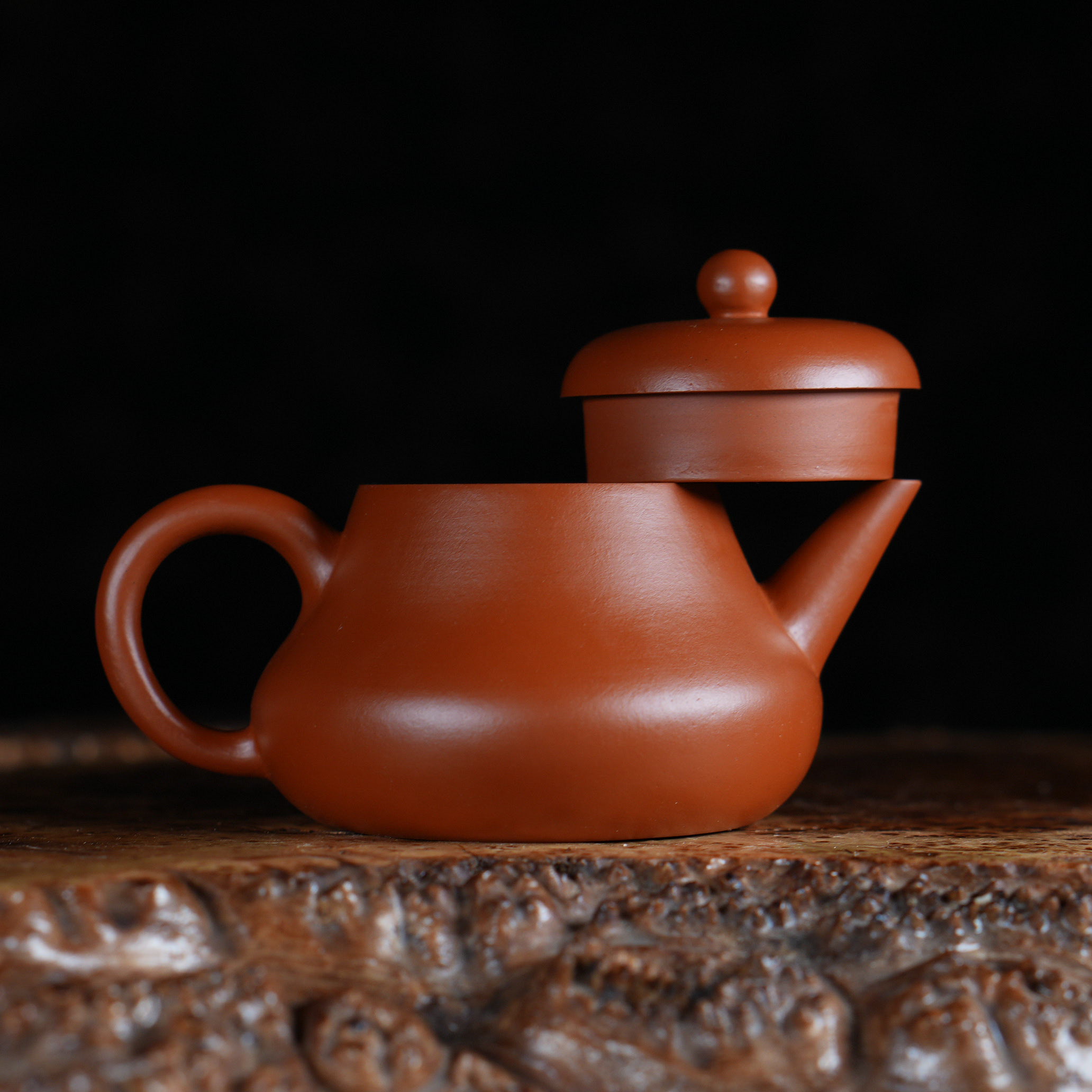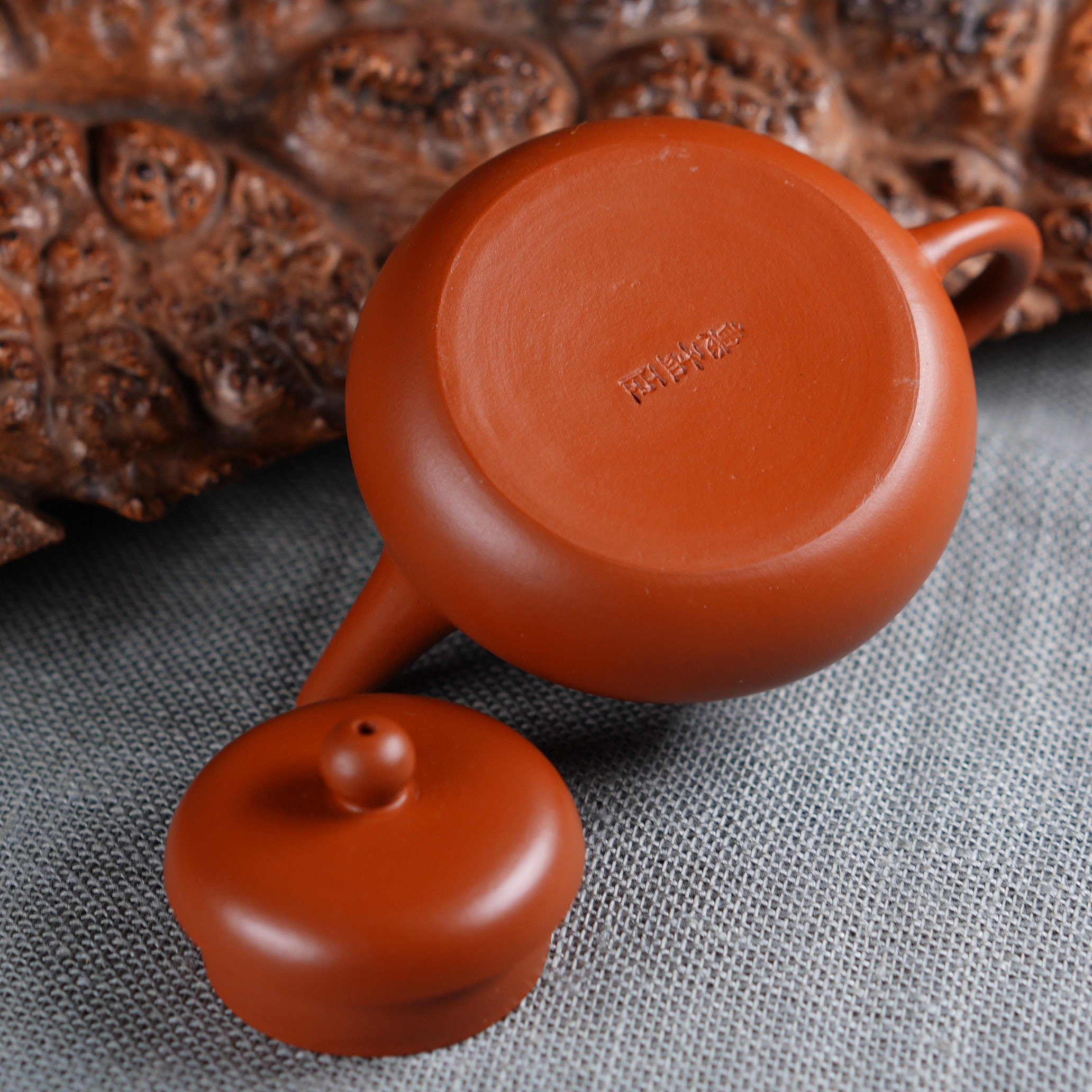 Чайник выполнен из красной исинской глины Чжу Ни (朱泥), которая отличается особой плотностью и благородным красновато-оранжевым оттенком после обжига. Чжу Ни - одна из самых ценимых исинских глин, известная своим мелкозернистым строением и способностью придавать чайному настою особую мягкость и округлость.