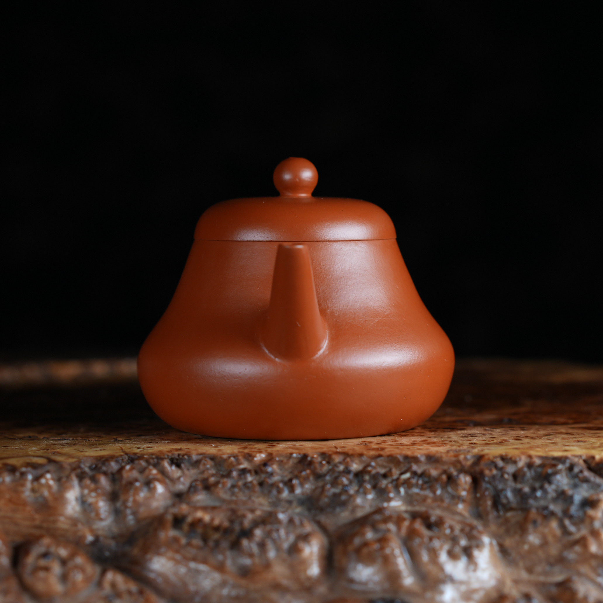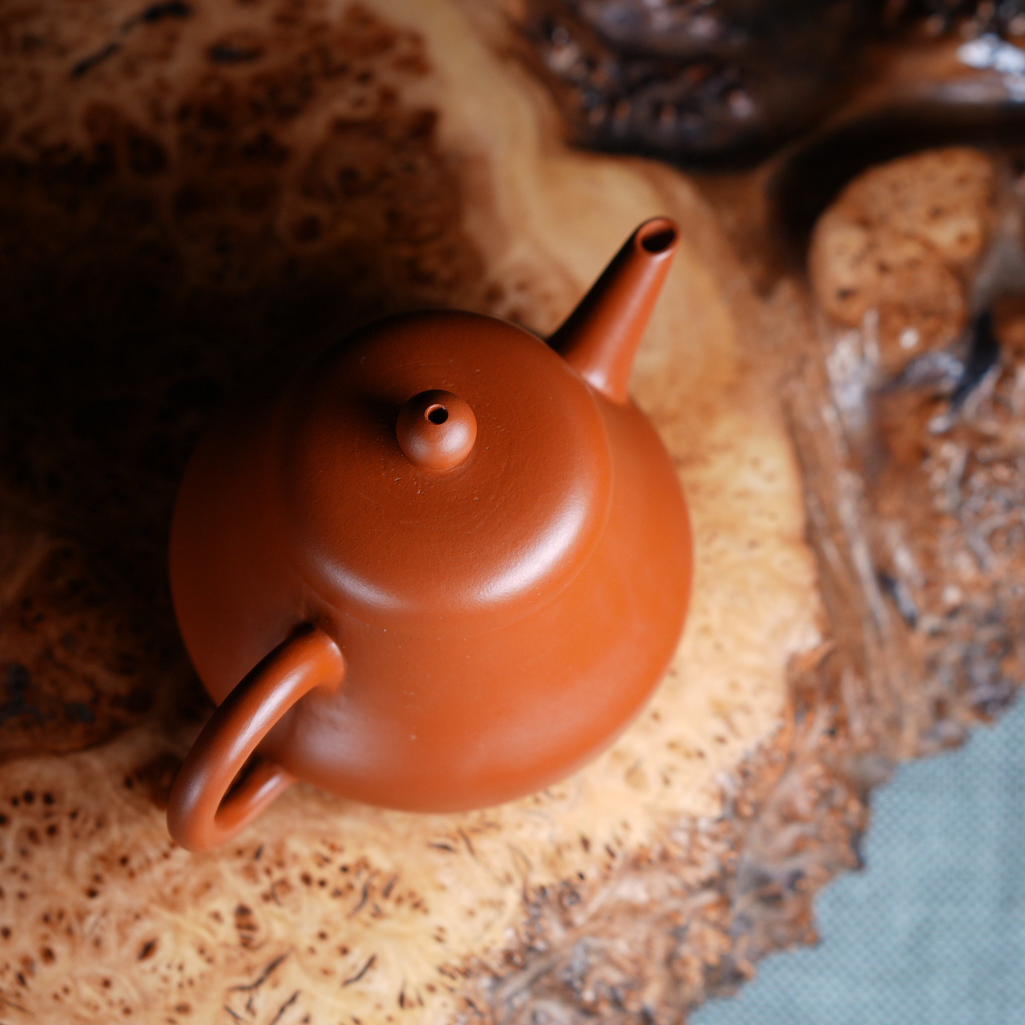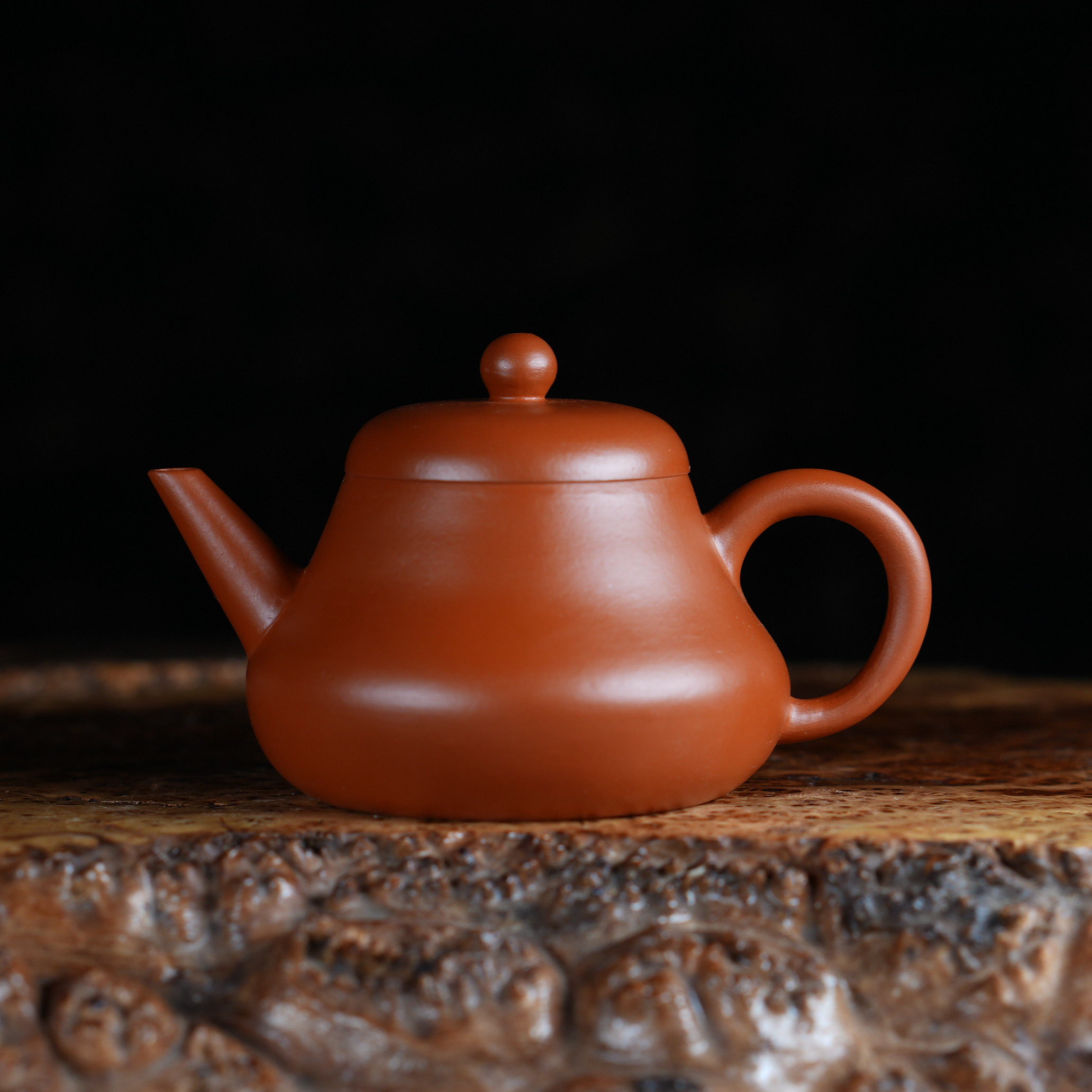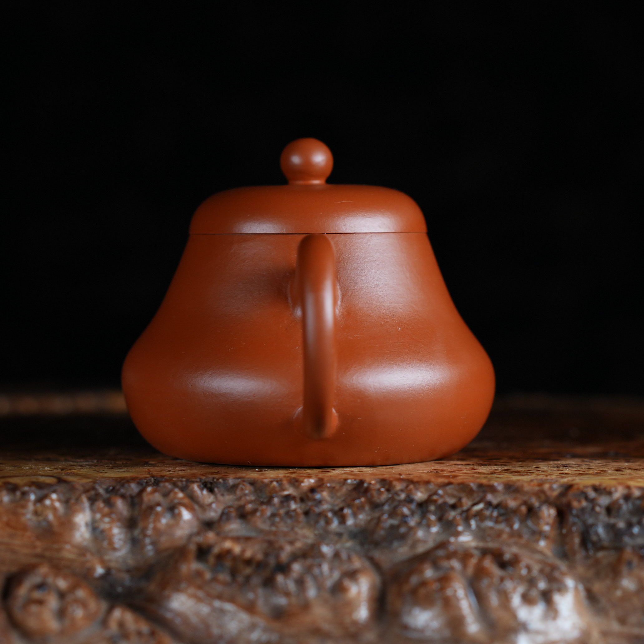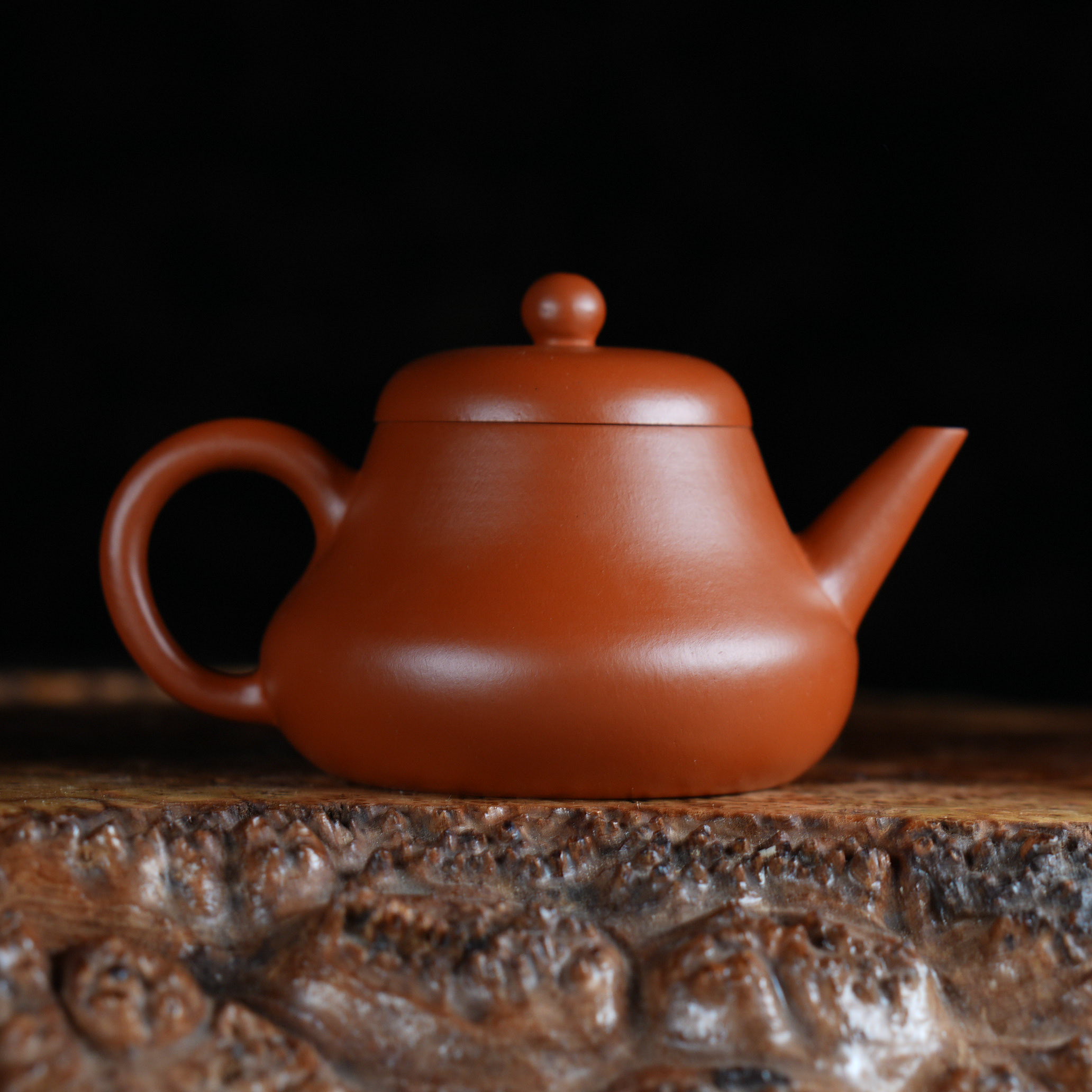 Чайник выполнен из красной исинской глины Чжу Ни (朱泥), которая отличается особой плотностью и благородным красновато-оранжевым оттенком после обжига. Чжу Ни - одна из самых ценимых исинских глин, известная своим мелкозернистым строением и способностью придавать чайному настою особую мягкость и округлость.