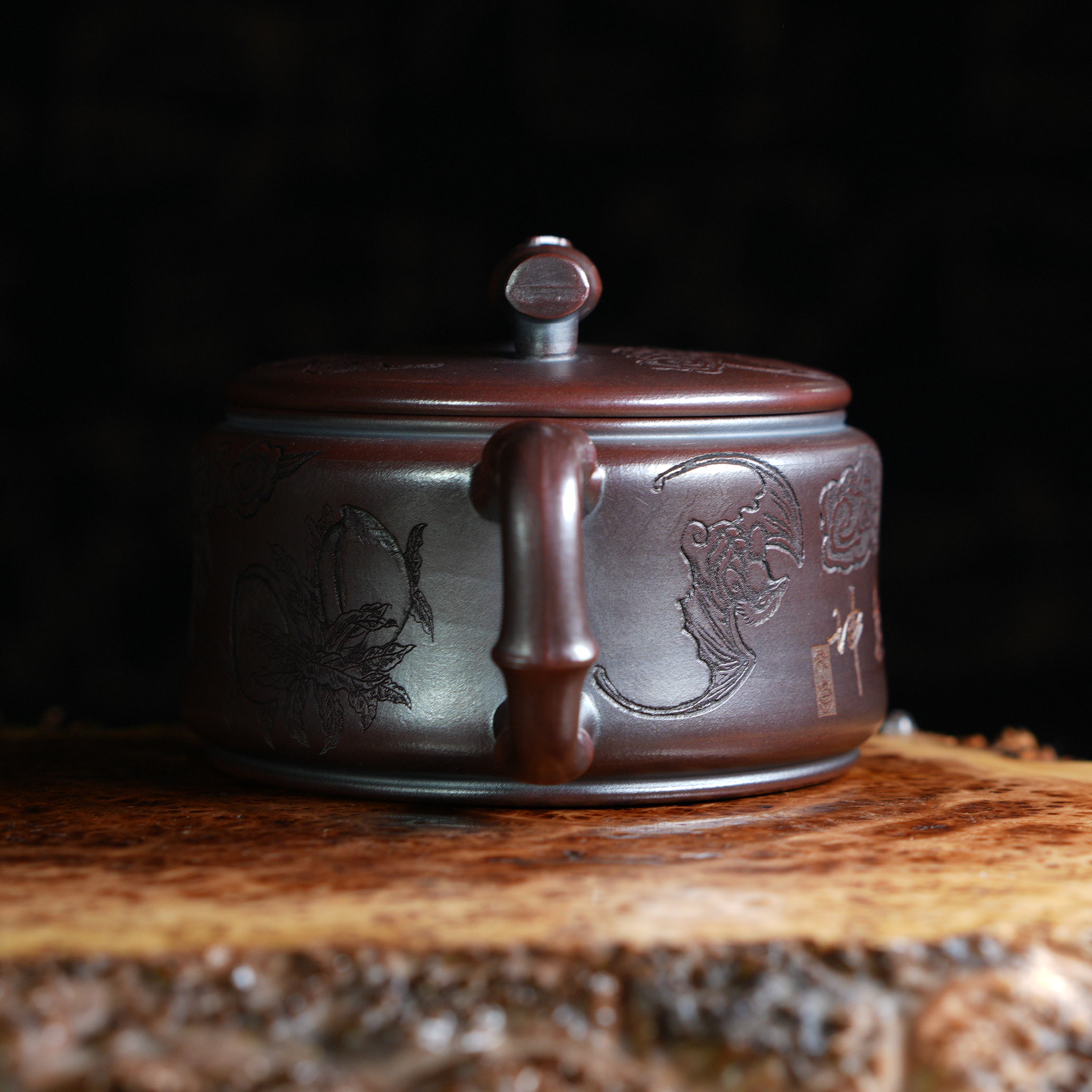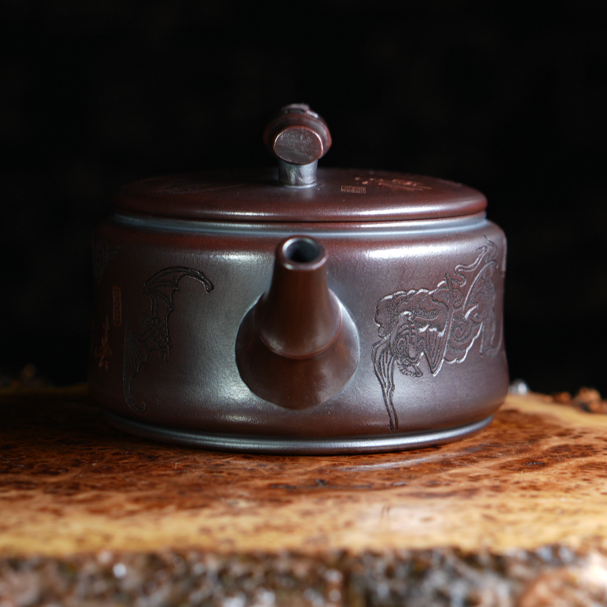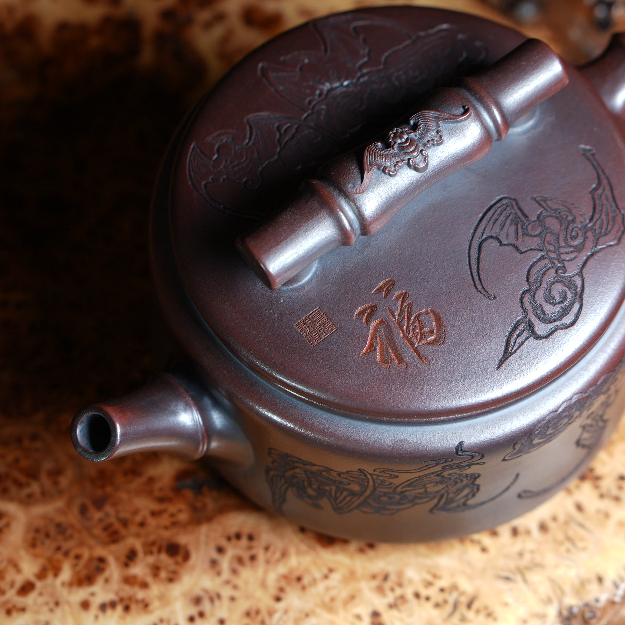 На крышке и стенках чайника изображены летучие мыши. В китайской культуре летучая мышь (фу) созвучна слову «счастье» (также фу). Поэтому изображение летучих мышей - это прямое пожелание счастья.