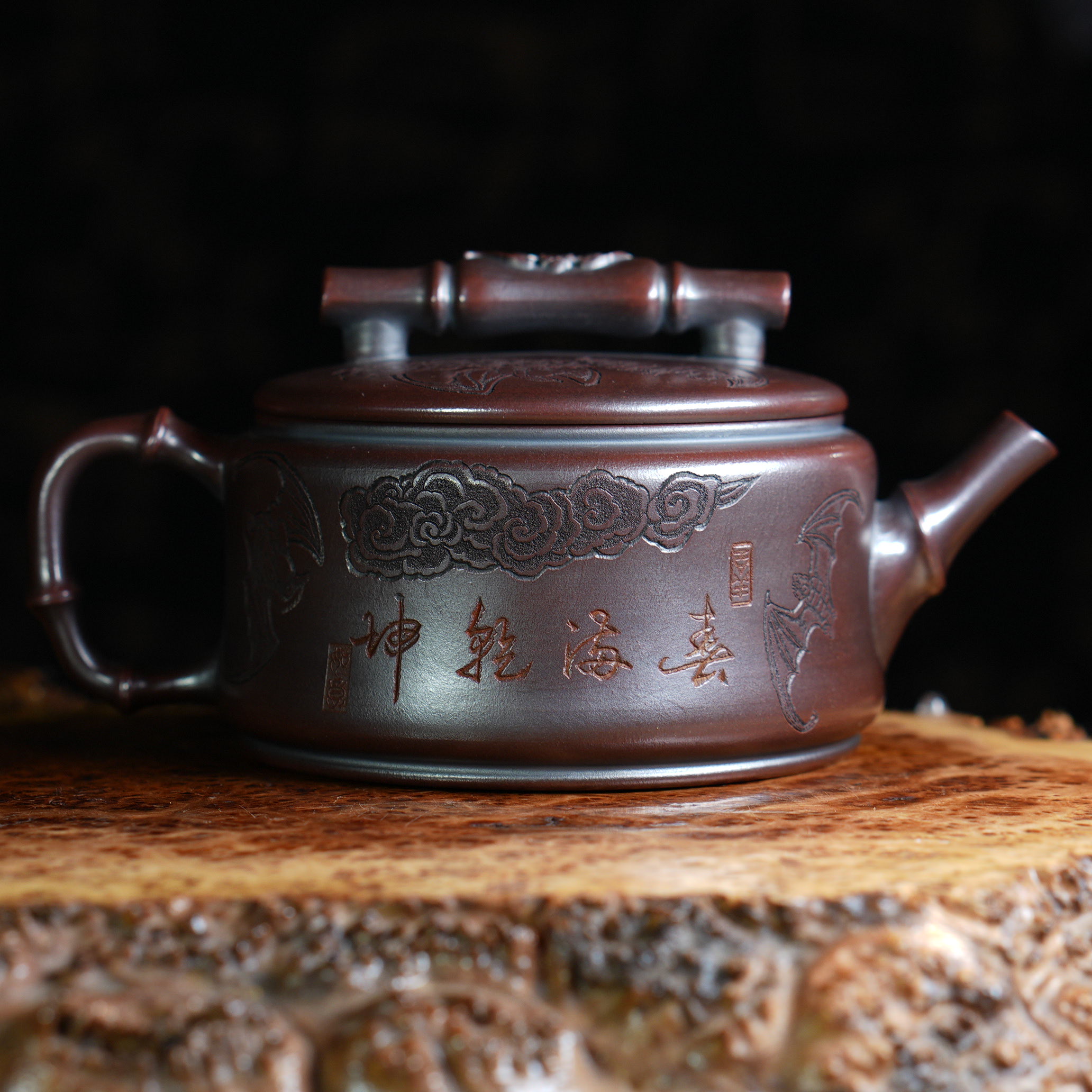 Чайник создан вручную. Стилизация под бамбук, изображения летучих мышей, множество каллиграфических благопожеланий - всё это требует высочайшего мастерства и существует в единственном экземпляре. Сто знаков счастья на дне делают этот чайник абсолютно уникальным.