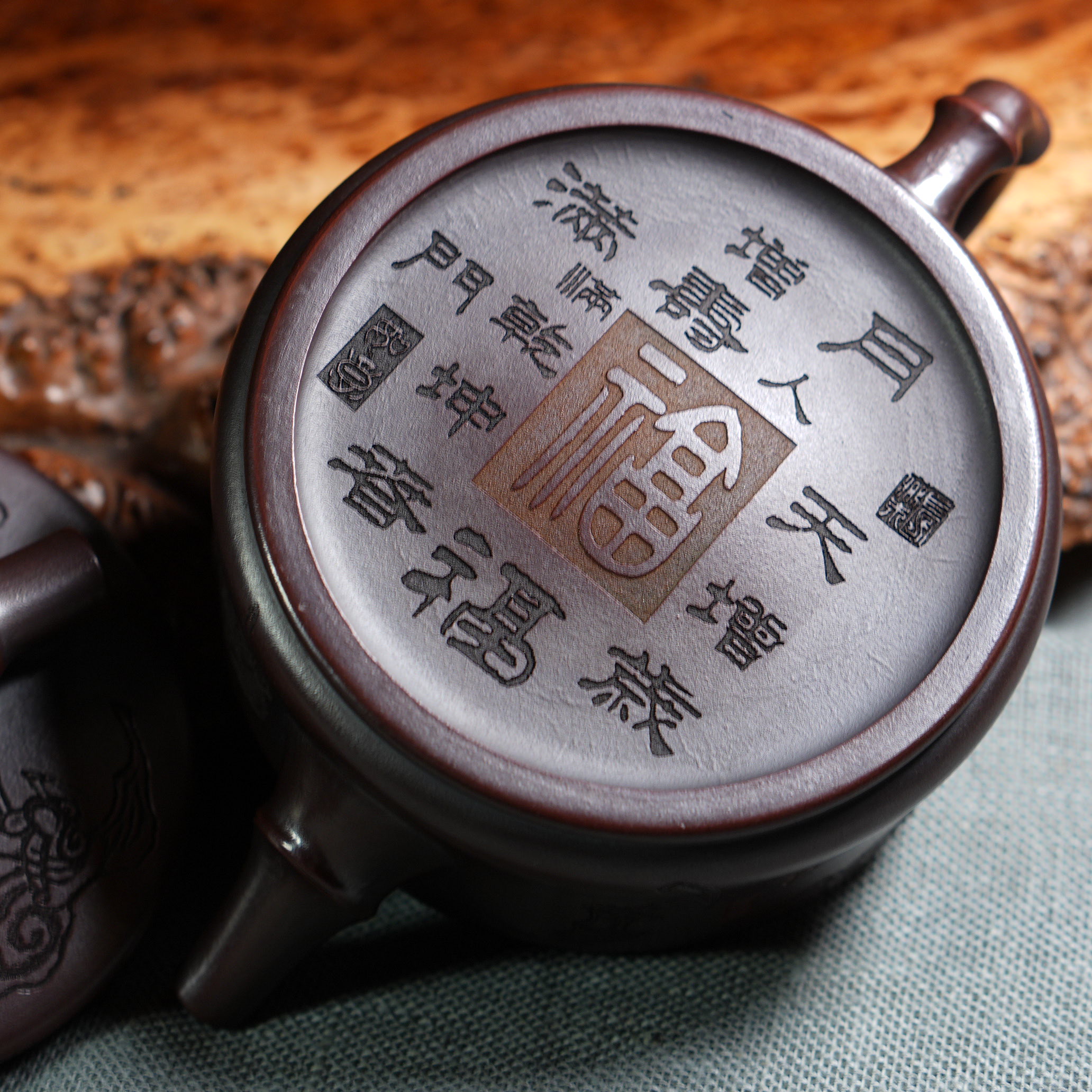 Внутри на дне - множество вариаций иероглифа «Счастье» (福). Здесь собрано около ста знаков счастья, выполненных в разных стилях каллиграфии. Каждый раз, заваривая чай, вода омывает эти знаки, словно заряжаясь энергией счастья и передавая её напитку, а затем и вам.