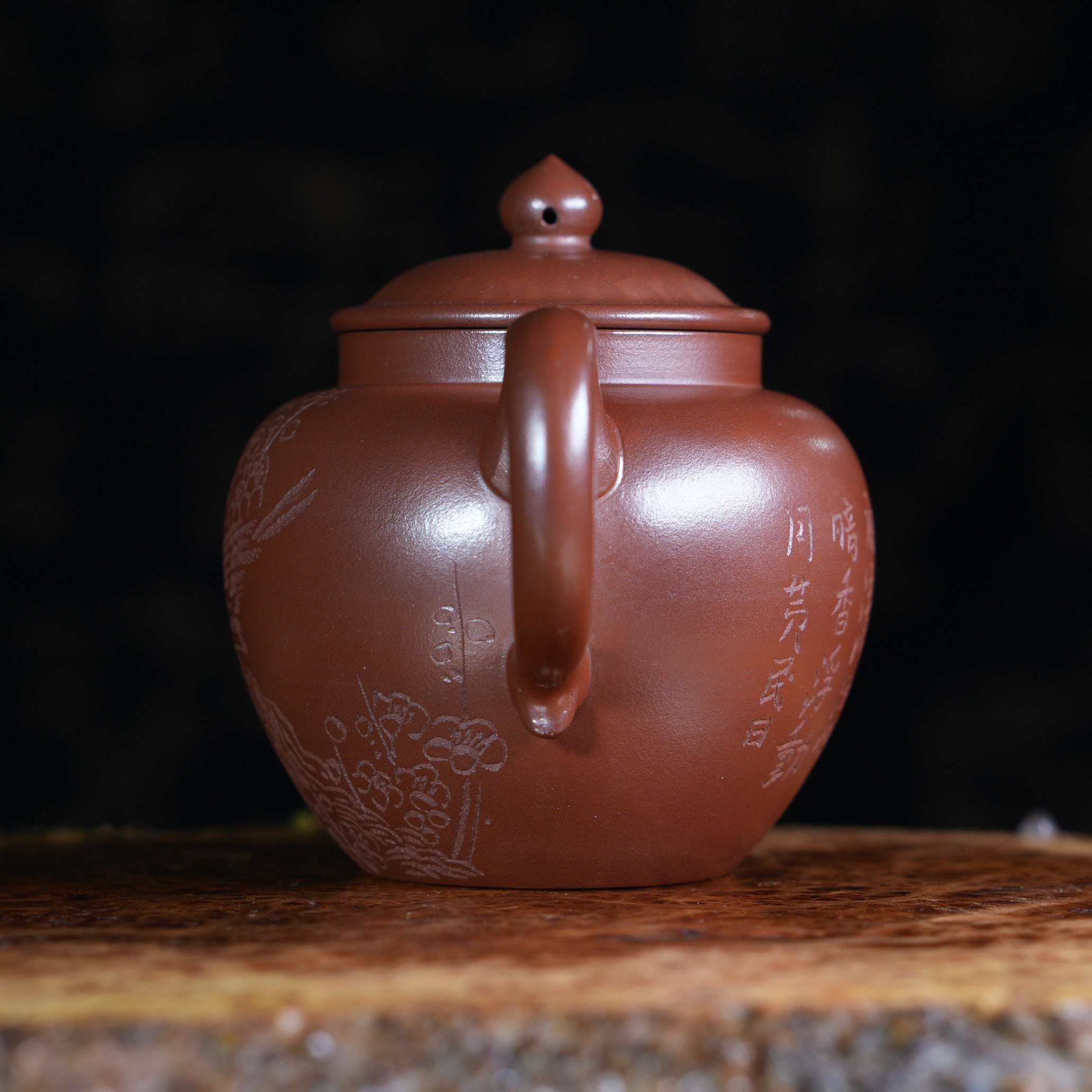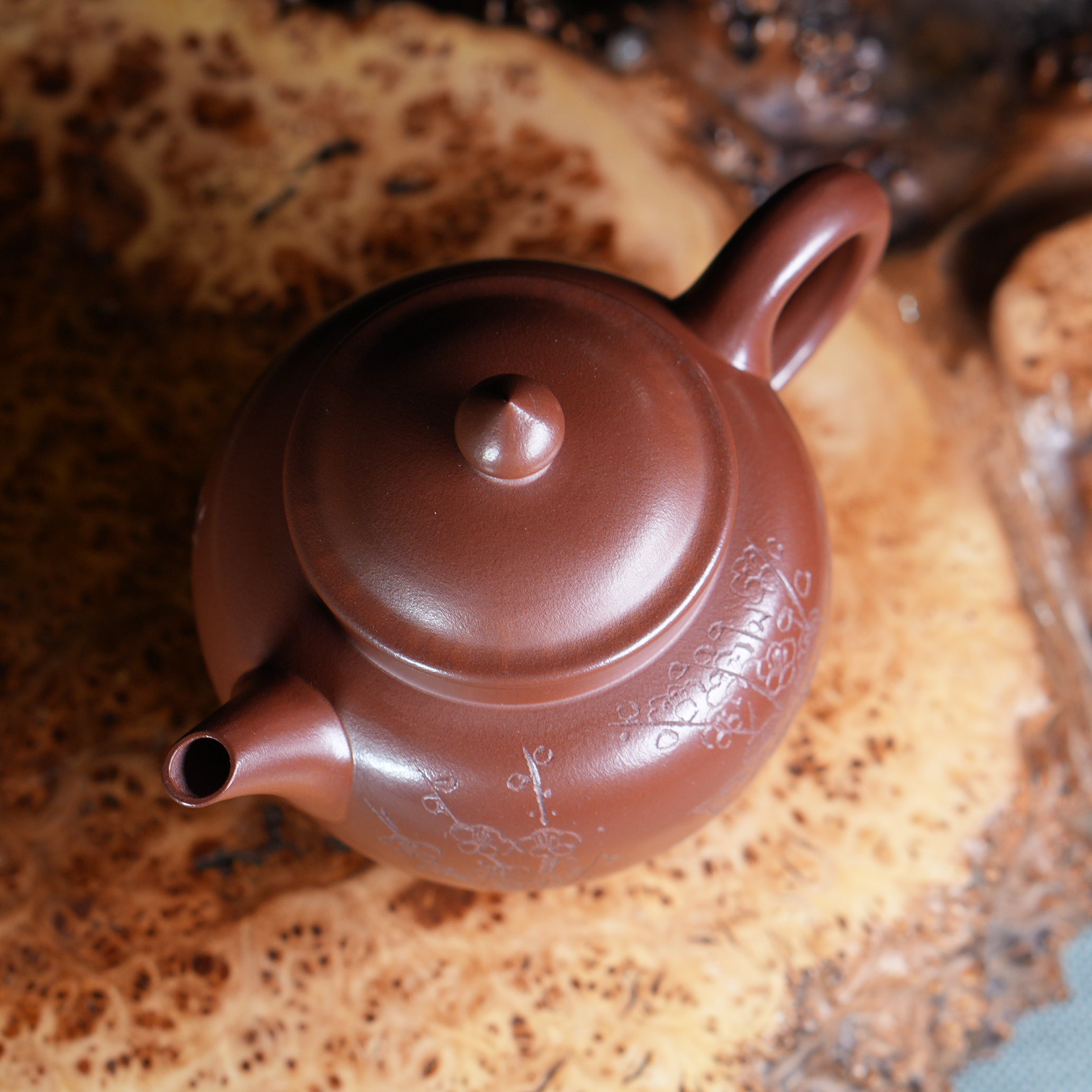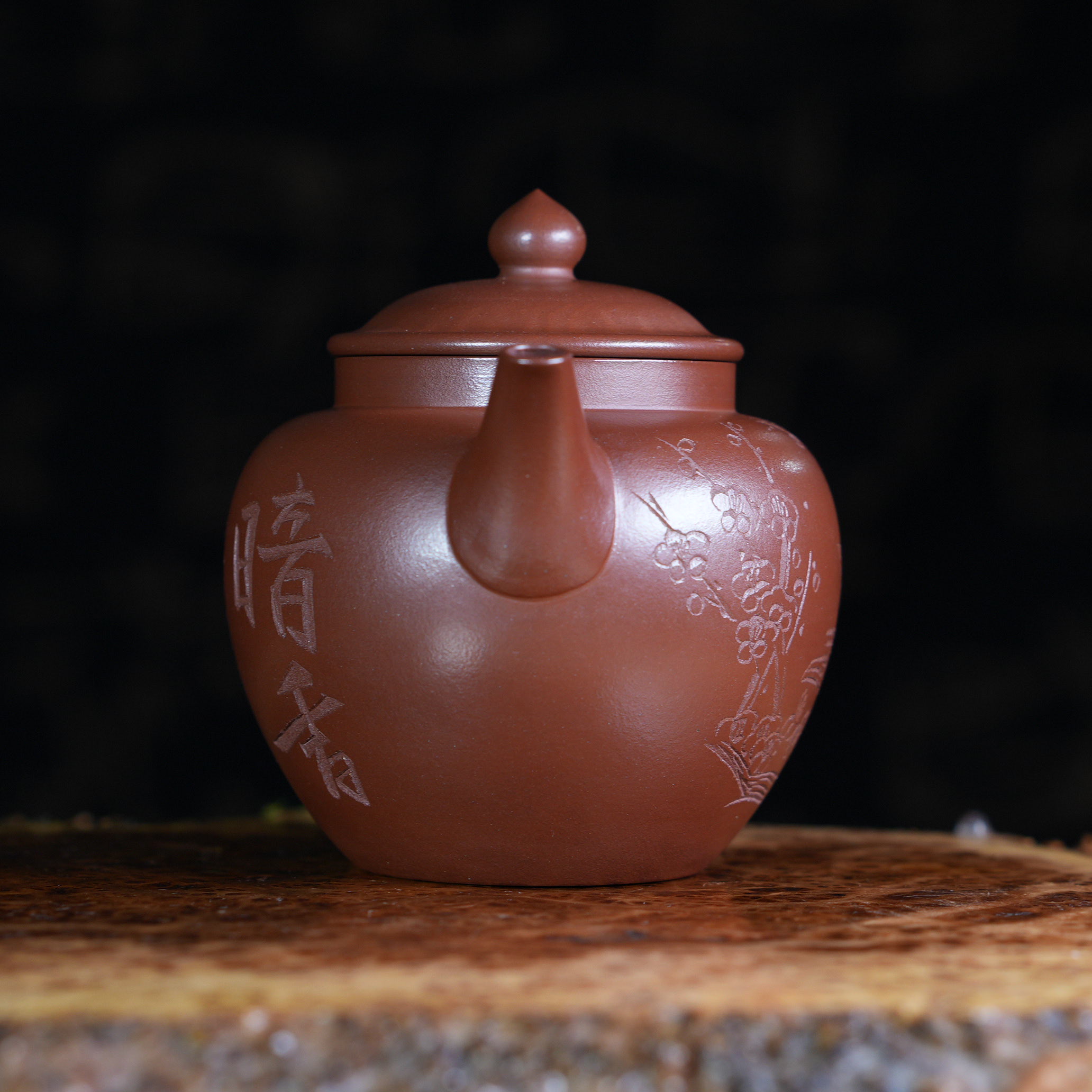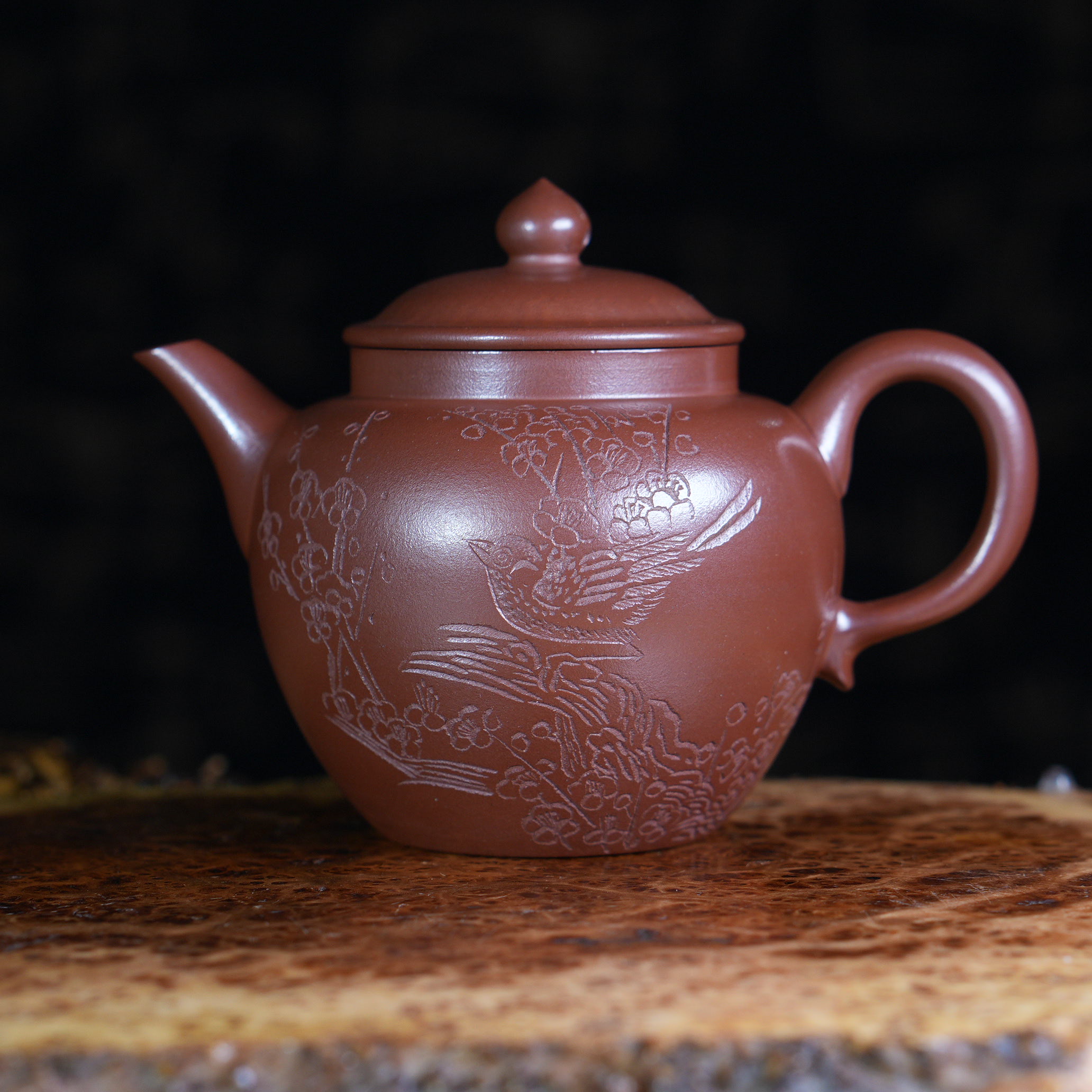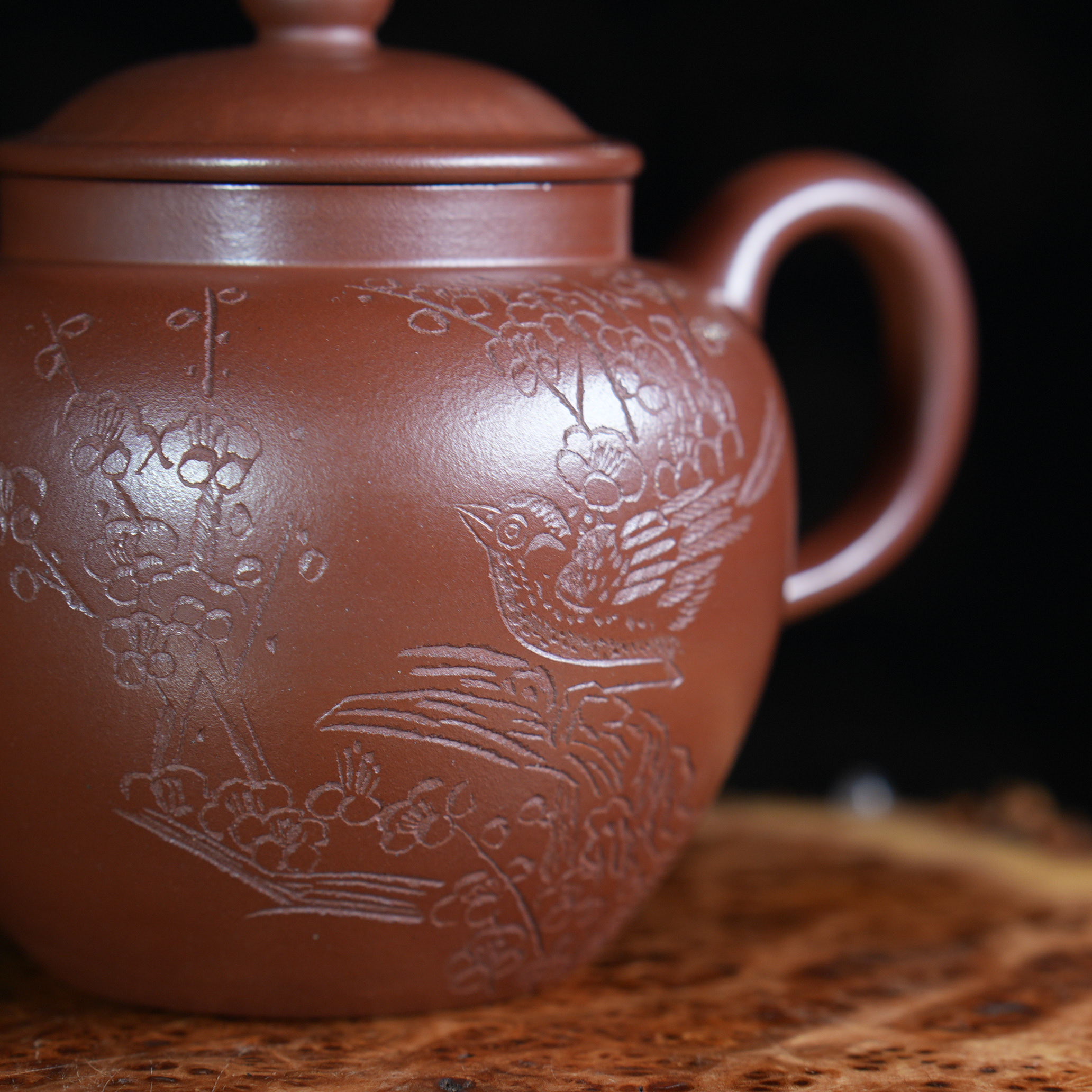 На одной стороне чайника выполнена глубокая гравировка с классическим сюжетом: птица на ветви цветущей сливы (мэйхуа). Цветущая слива - один из самых почитаемых символов в китайской культуре: