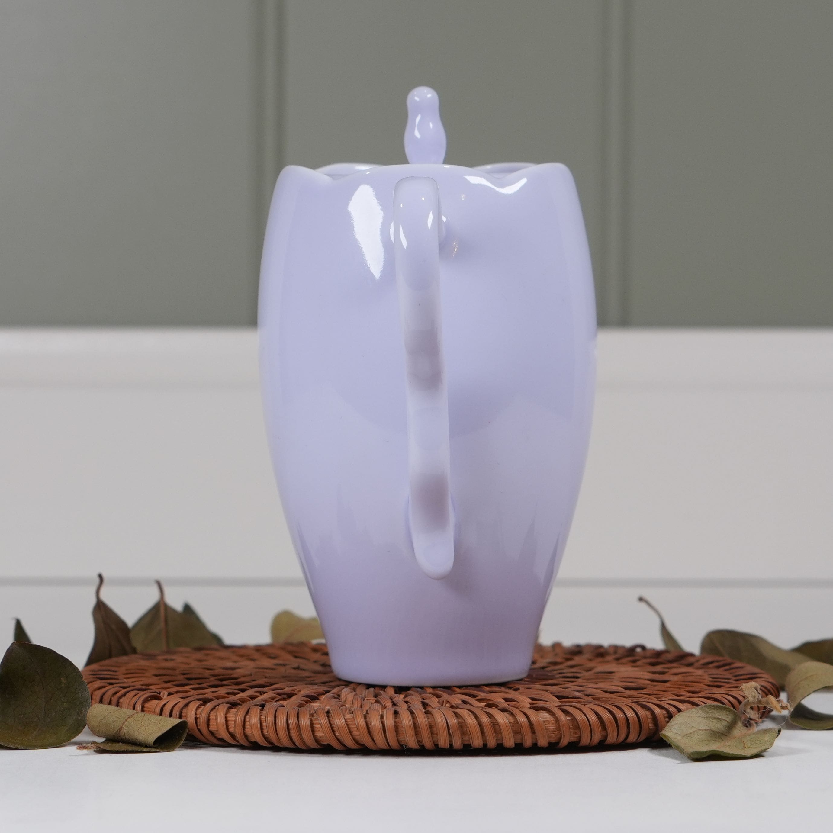 Нежный, изящный, с ровным сливом. Резной верх в виде цветка и изогнутая тонкая ручка. Длинный носик.