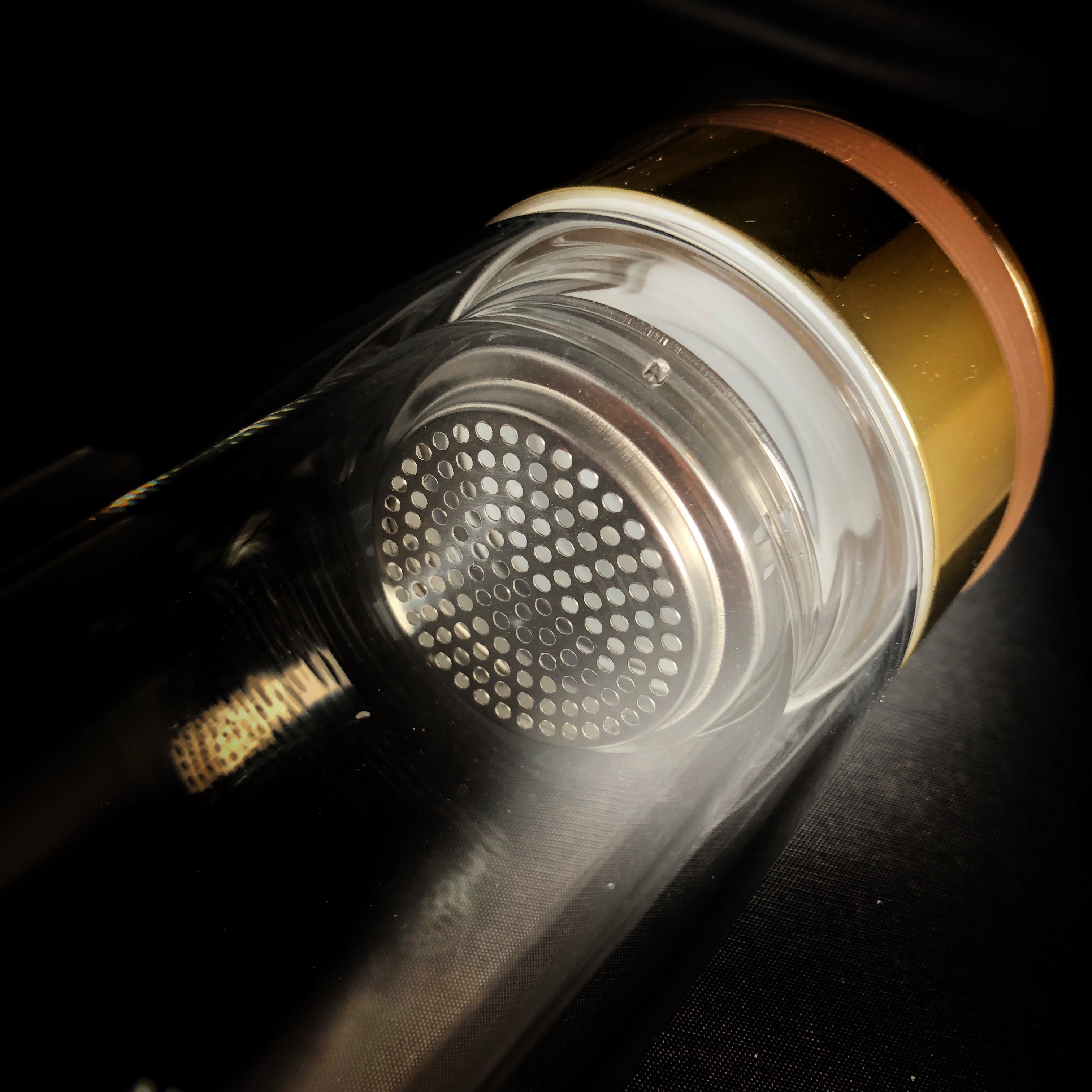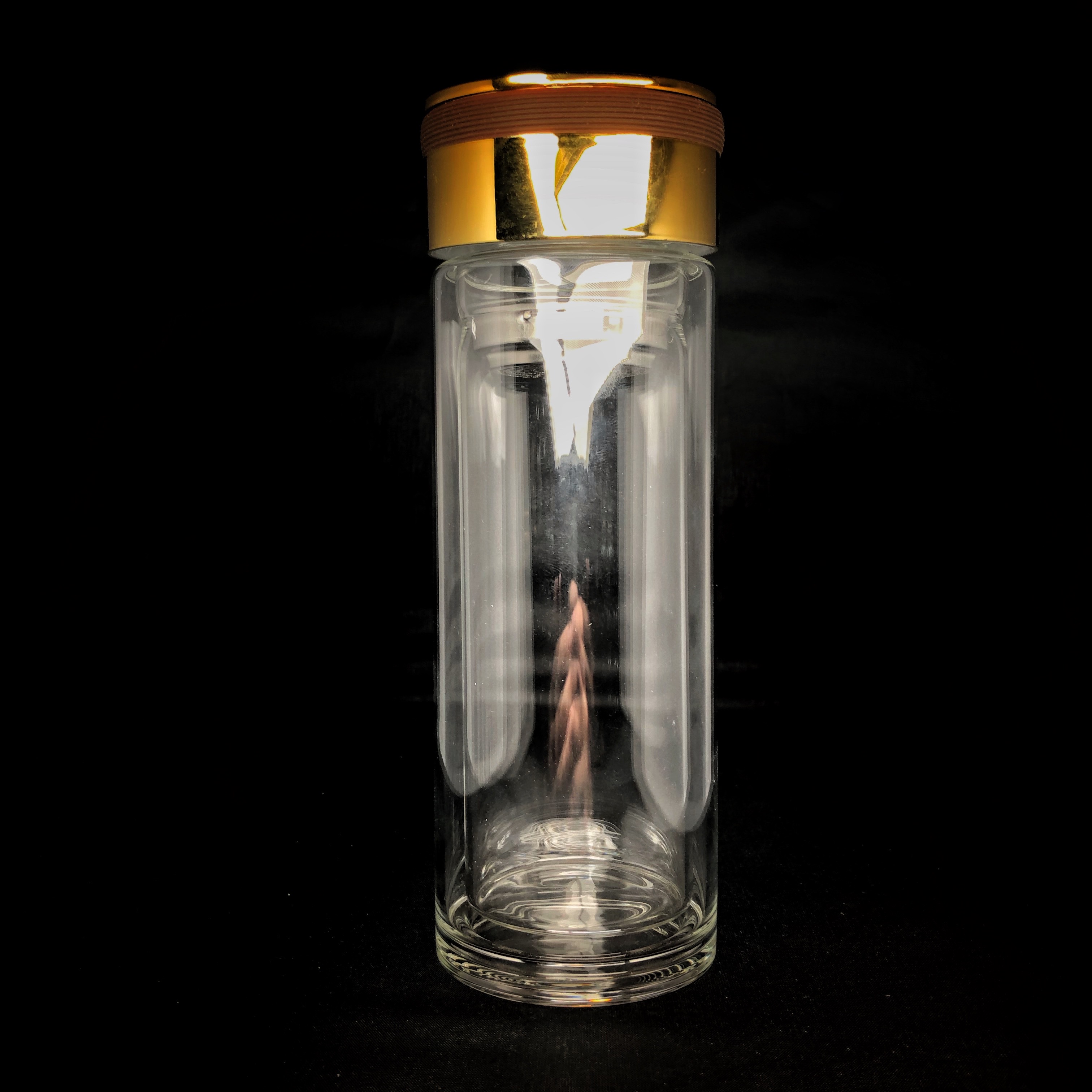 Термос из двойного стекла с золотистой крышкой. В крышке есть ситечко для фильтрации чайного настоя от листьев.