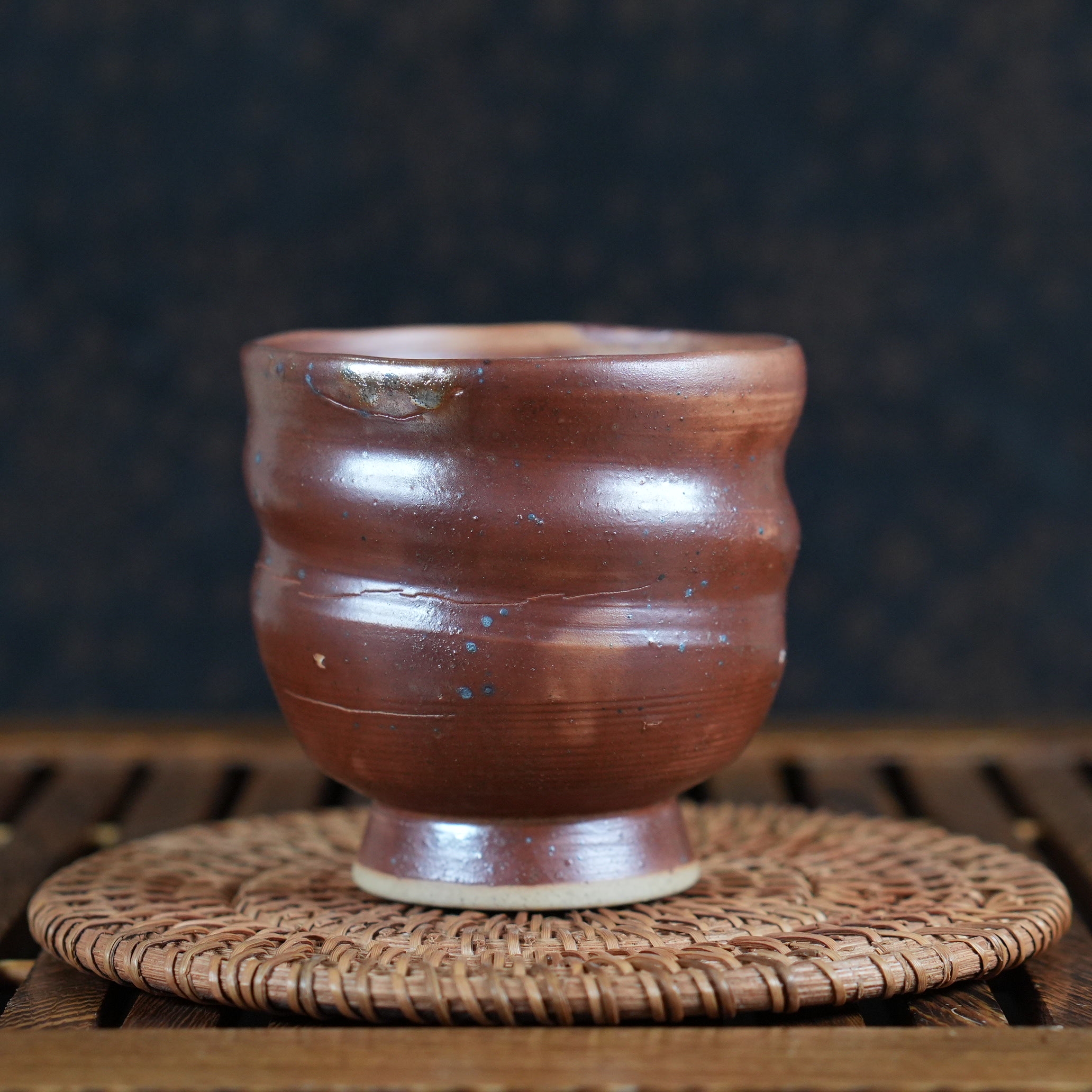 Пиала выполнена из плотной глины, добываемой в префектуре Окаяма. Эта глина обладает высоким содержанием железа и отличается пластичностью, но при этом низкой огнеупорностью - она требует особого, длительного режима обжига. Форма пиалы высокая, объёмная, на высоком подиуме (кольцевом поддоне). Стенки тонкие, но плотные, что создаёт приятную тяжесть (вес 140 гр) и ощущение надёжности. Высота 7,2 см и ширина 7,3 см формируют стройный, изящный силуэт. Объём 140 мл универсален - подходит как для церемониальных проливов, так и для полноценного чаепития.